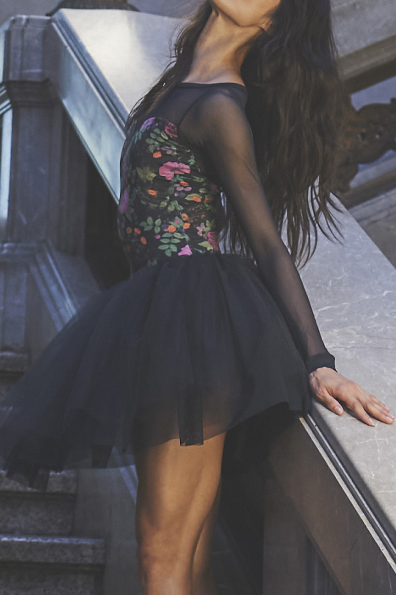 墨クロのベース生地にアネモネや小さなお花の色彩が美しくピンクやオレンジなどが混ざり合った色合いが大人可愛いレオタード。