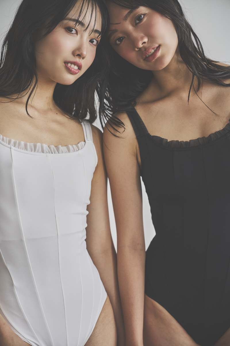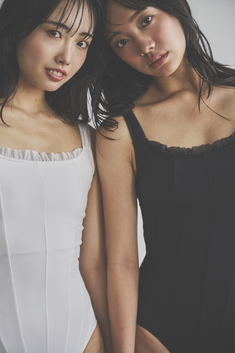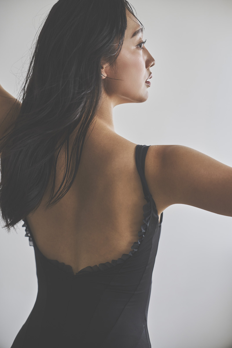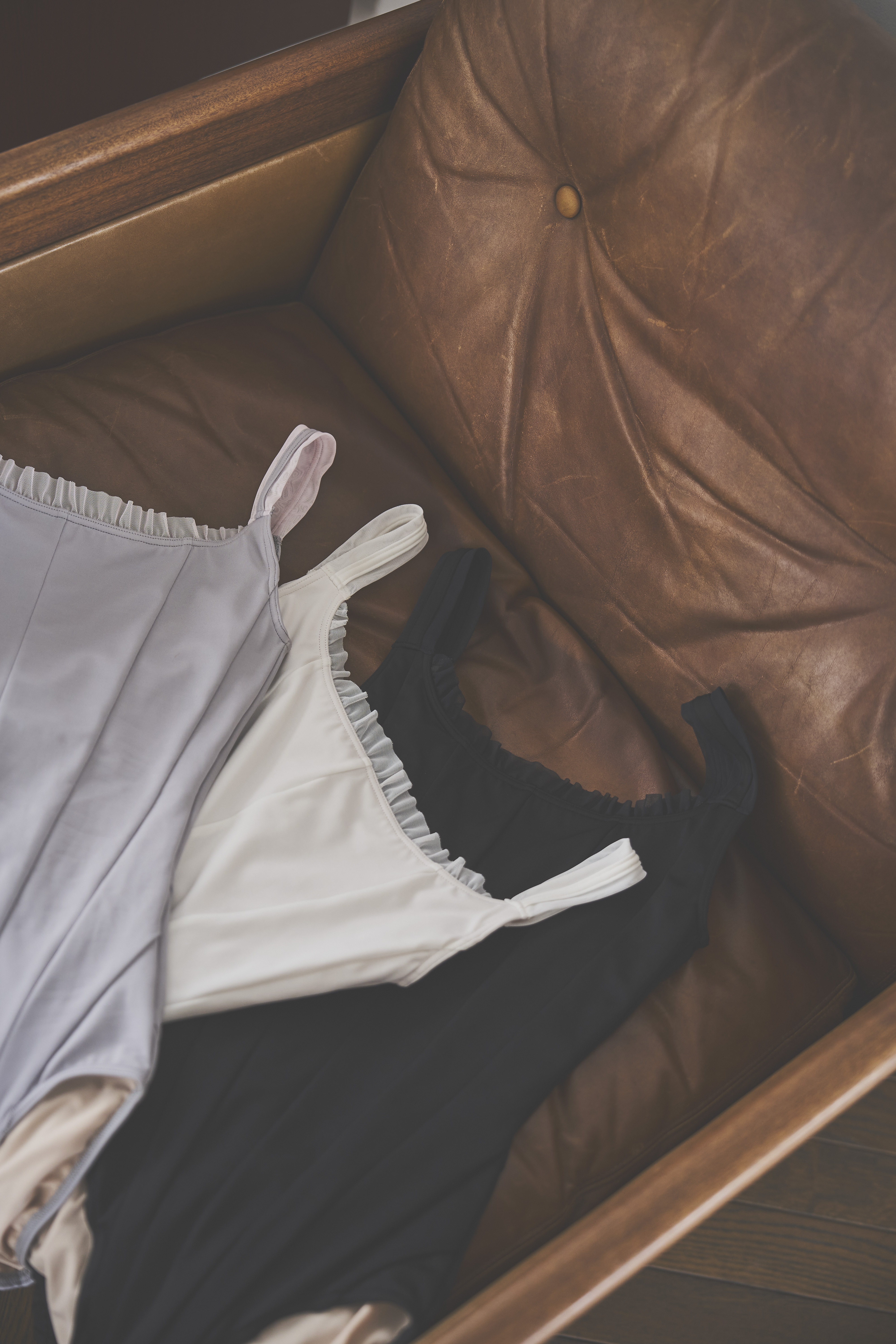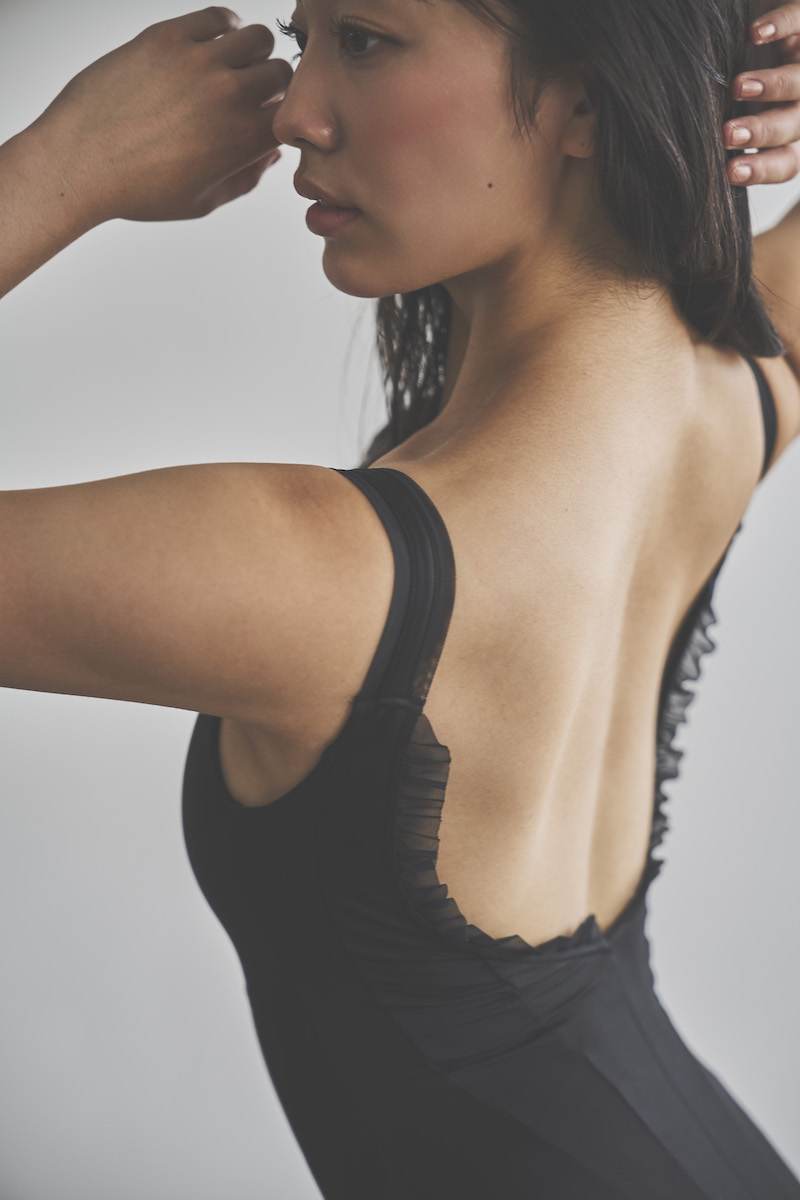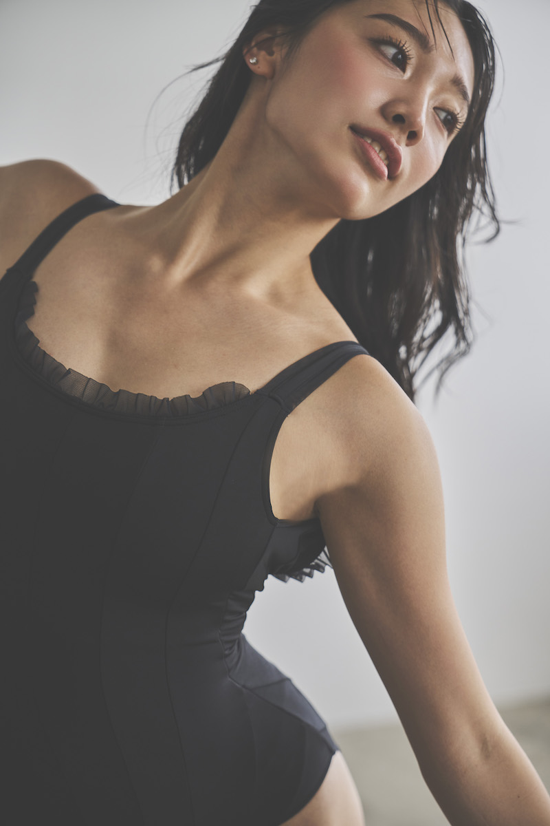 立体的で美しいボディラインを演出しつつ、スクエアネックと控えめなフリルが、クラシックでモードな印象を両立。