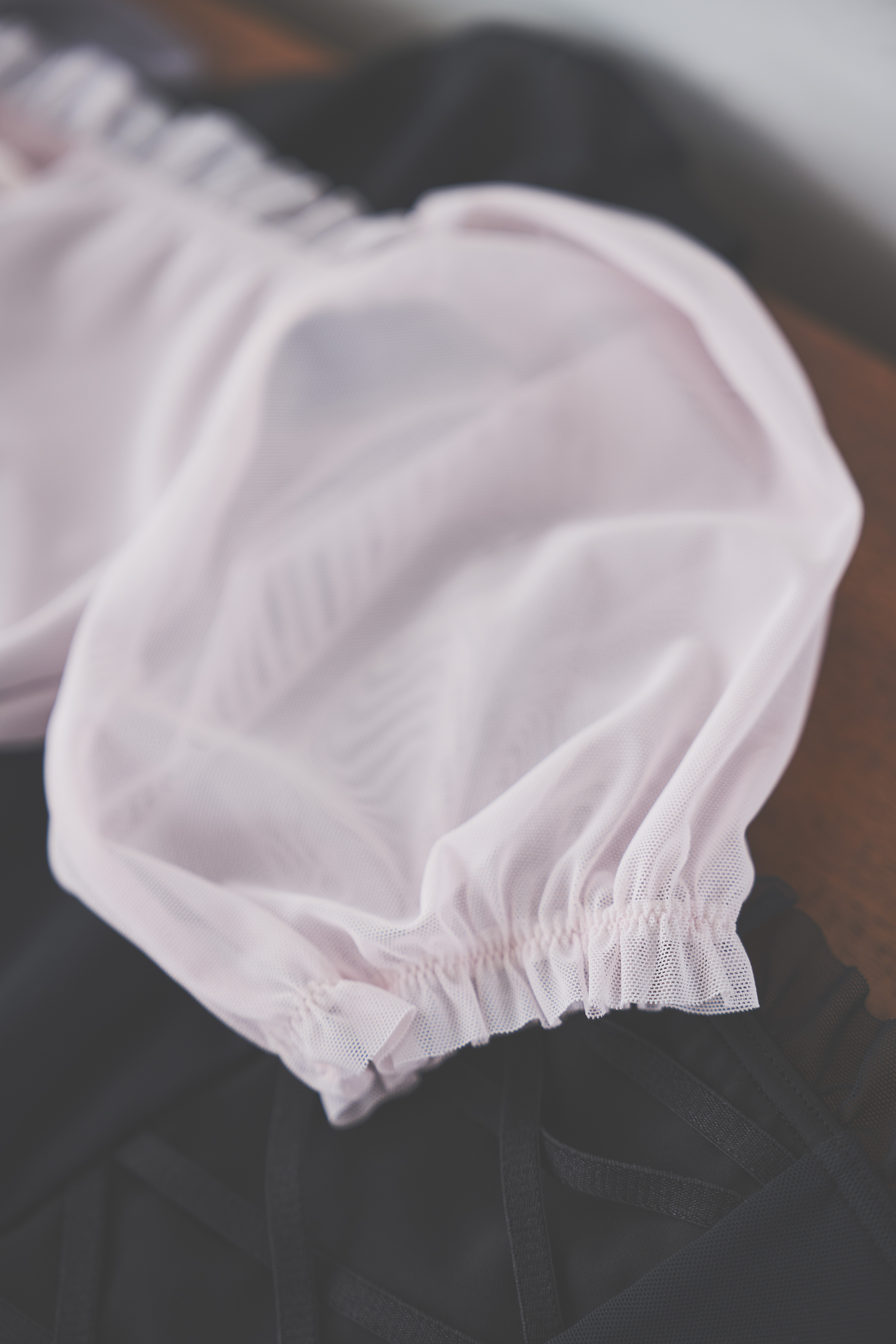 ふんわりとしたパフスリーブは、薄く繊細なパワーネット素材を重ね、