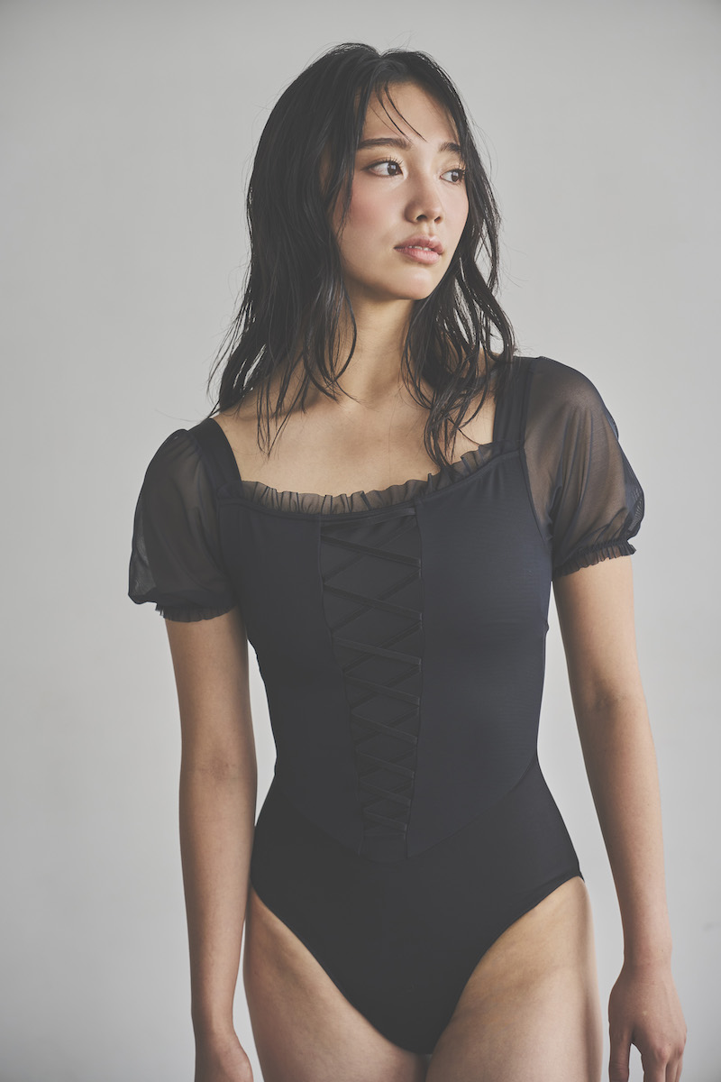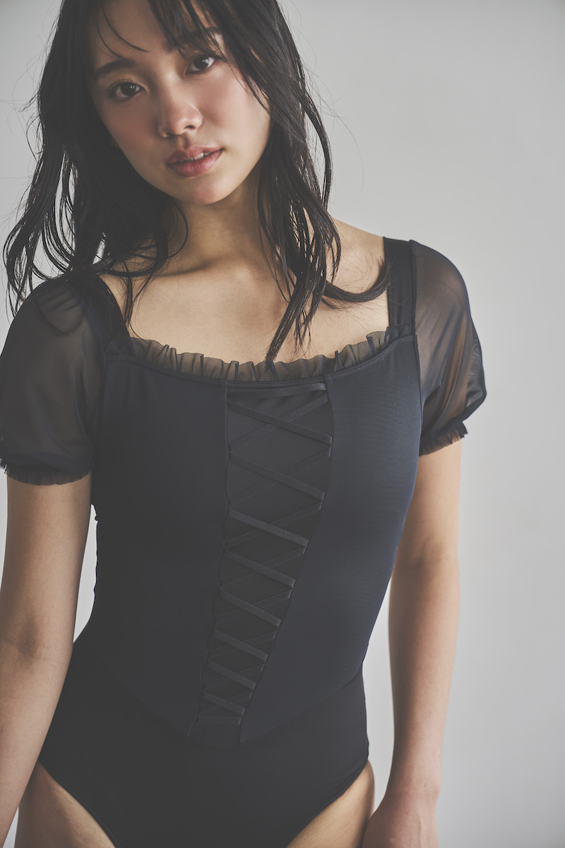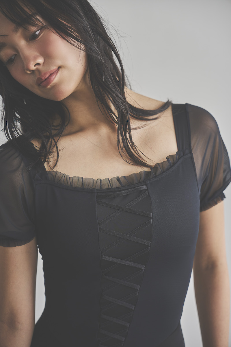胸元からウエストにかけてのクロスになるレースアップディテールが縦のラインを強調し、上半身をしなやかに見せます。