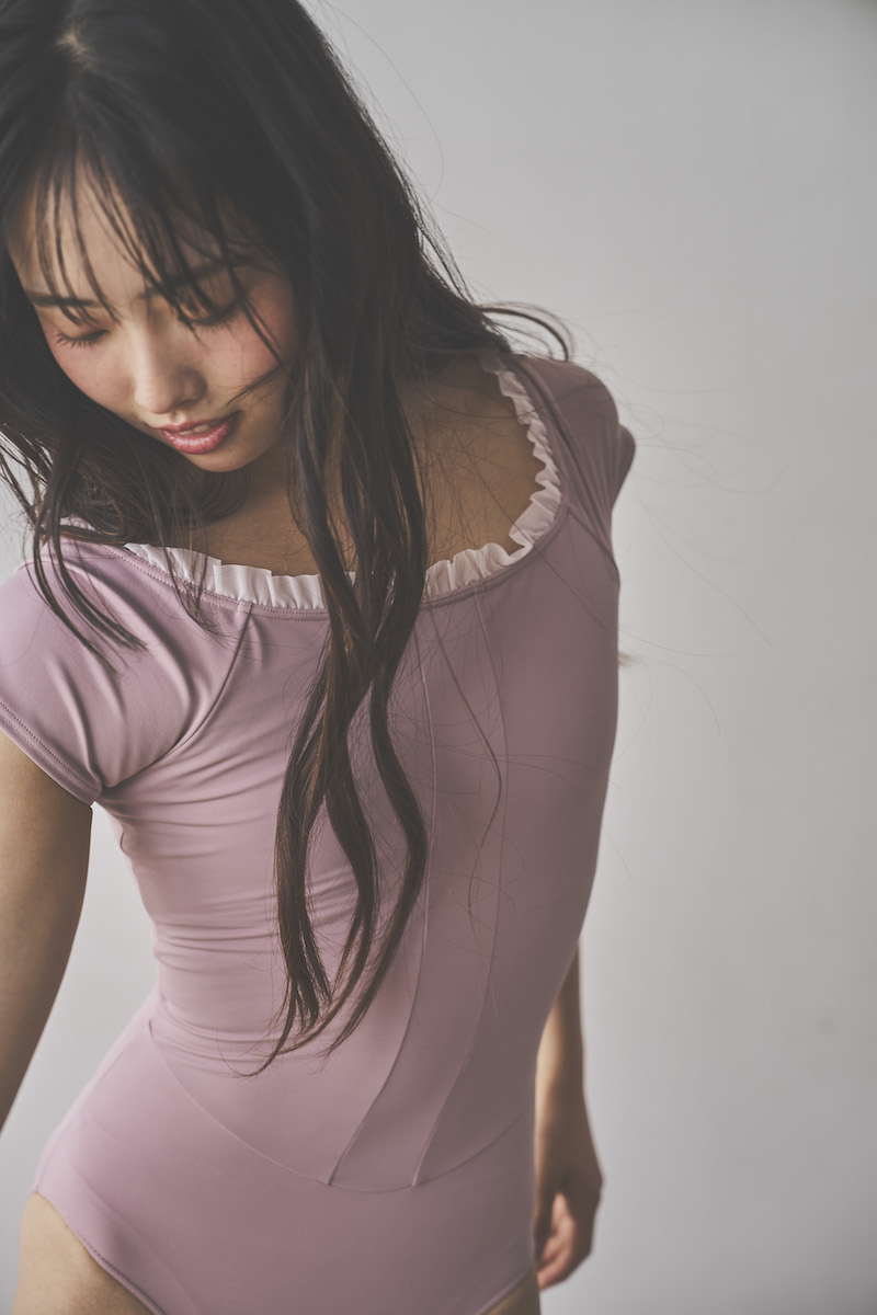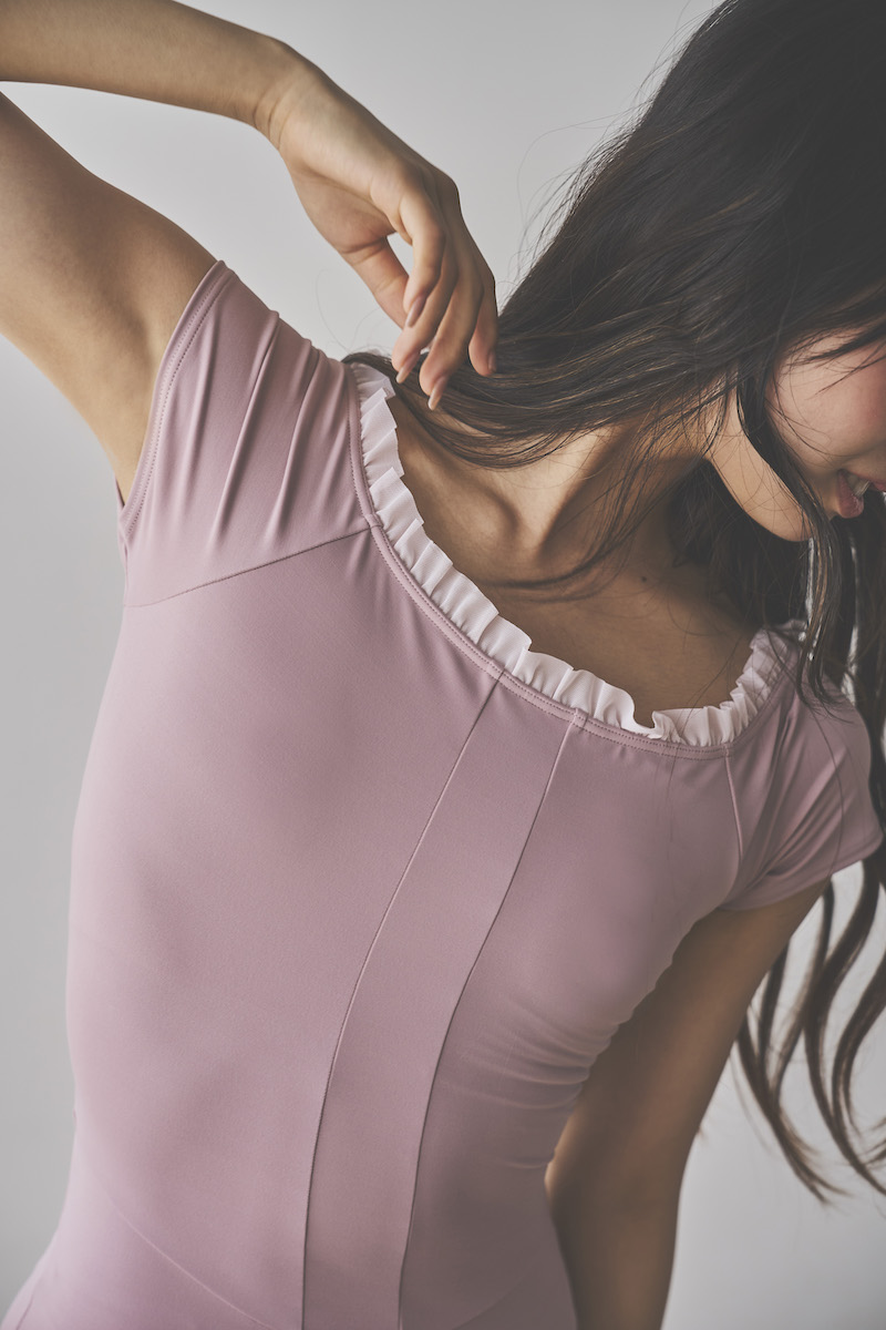 シンプルなラウンドネックにフリルを施し可愛らしさを演出。胸元の切り替えステッチが美しい陰影を生む「Dólce」。