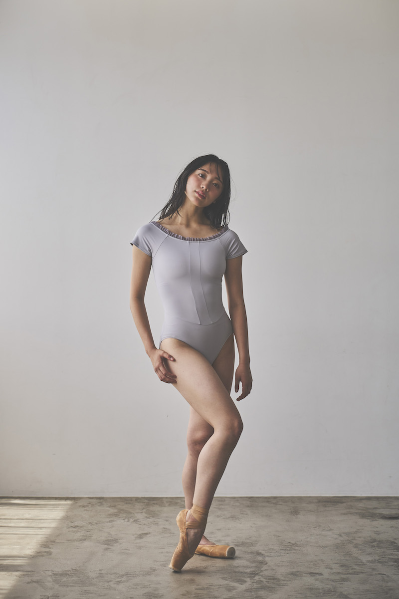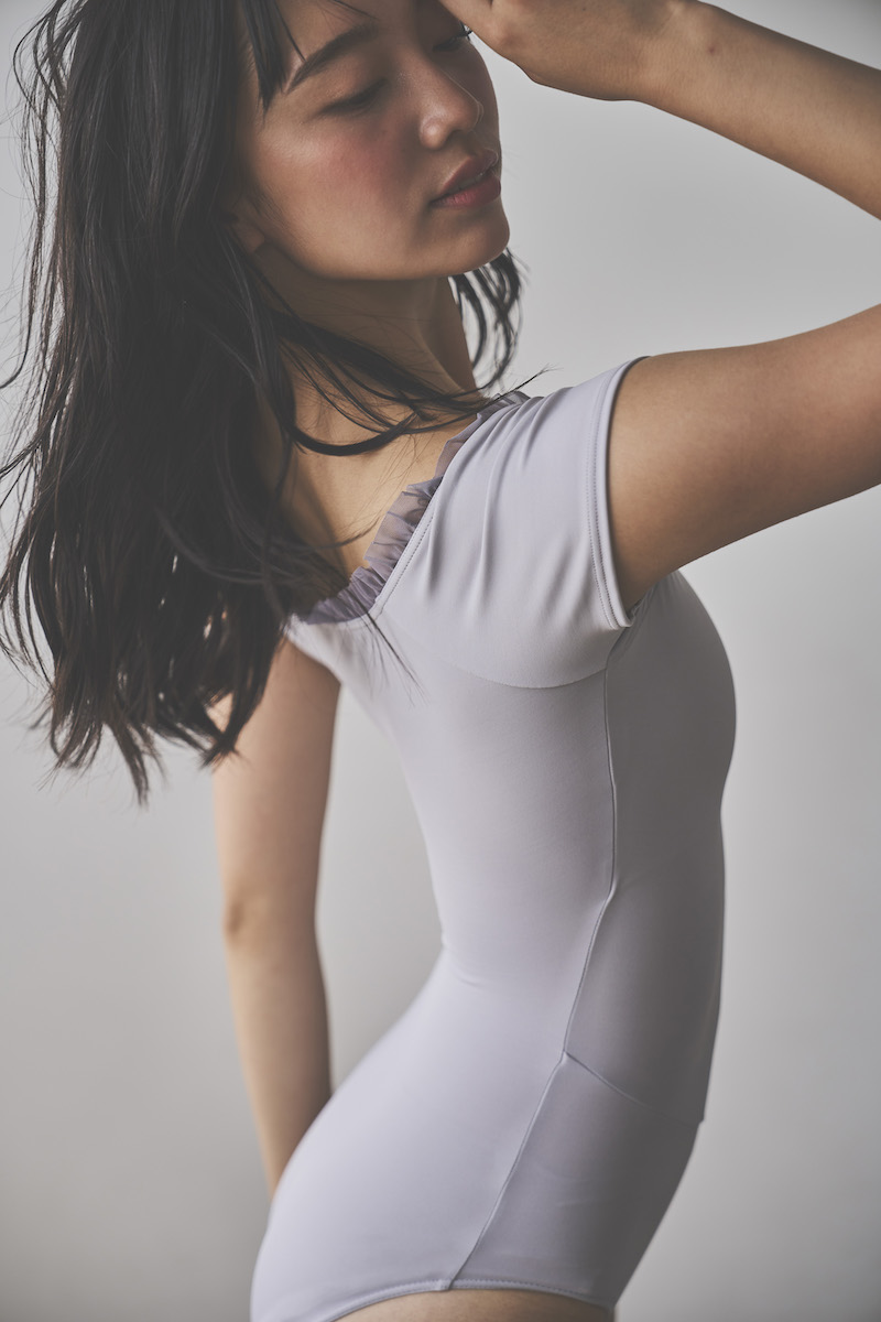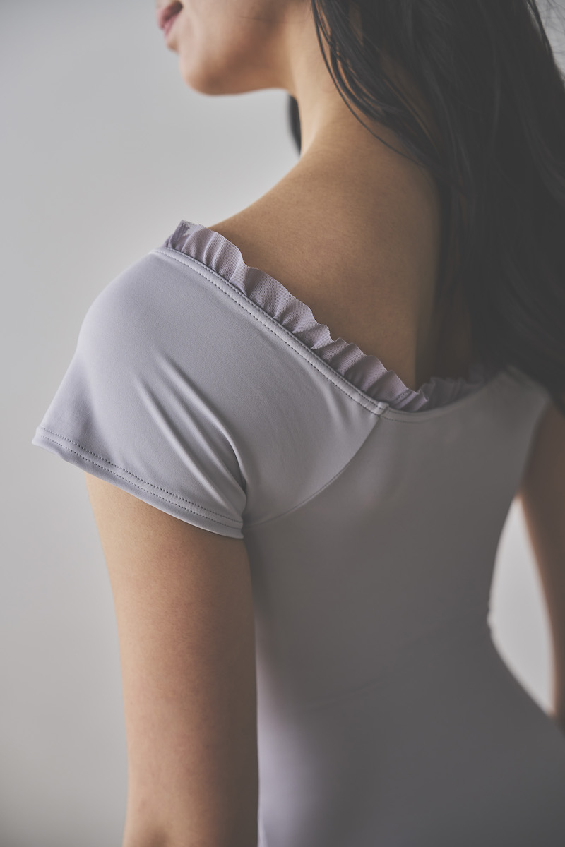 シンプルなラウンドネックにフリルを施し可愛らしさを演出。胸元の切り替えステッチが美しい陰影を生む「Dólce」。
