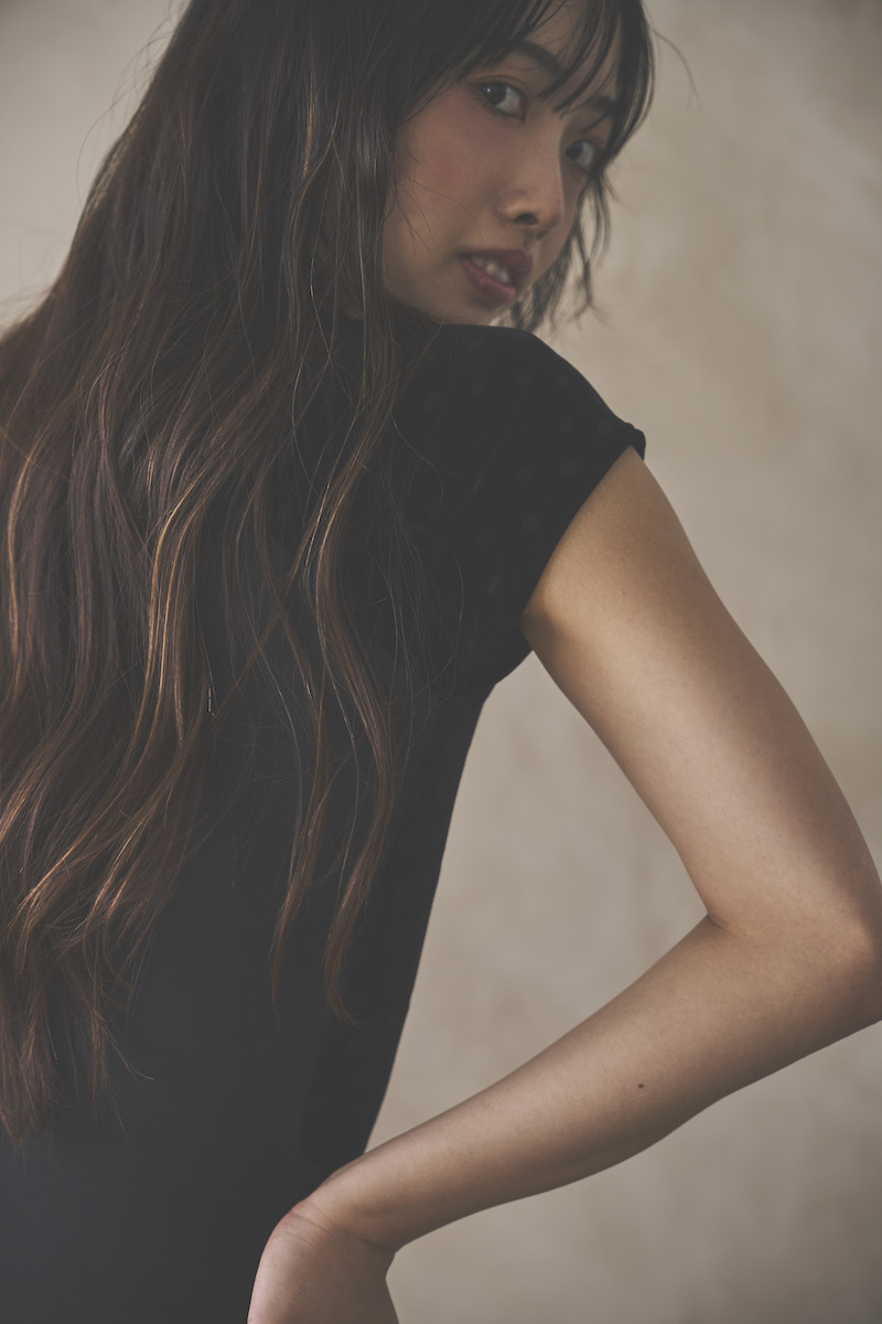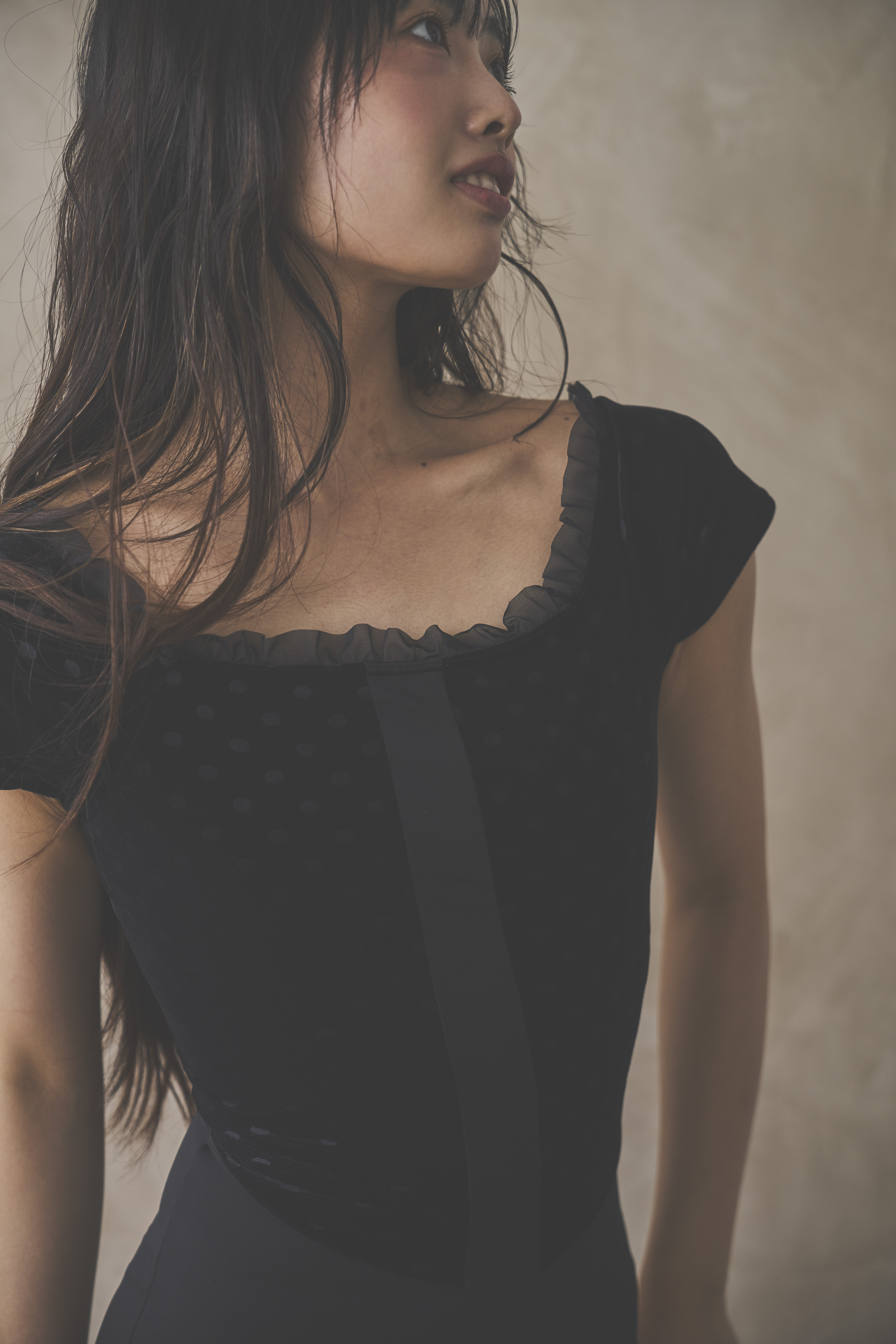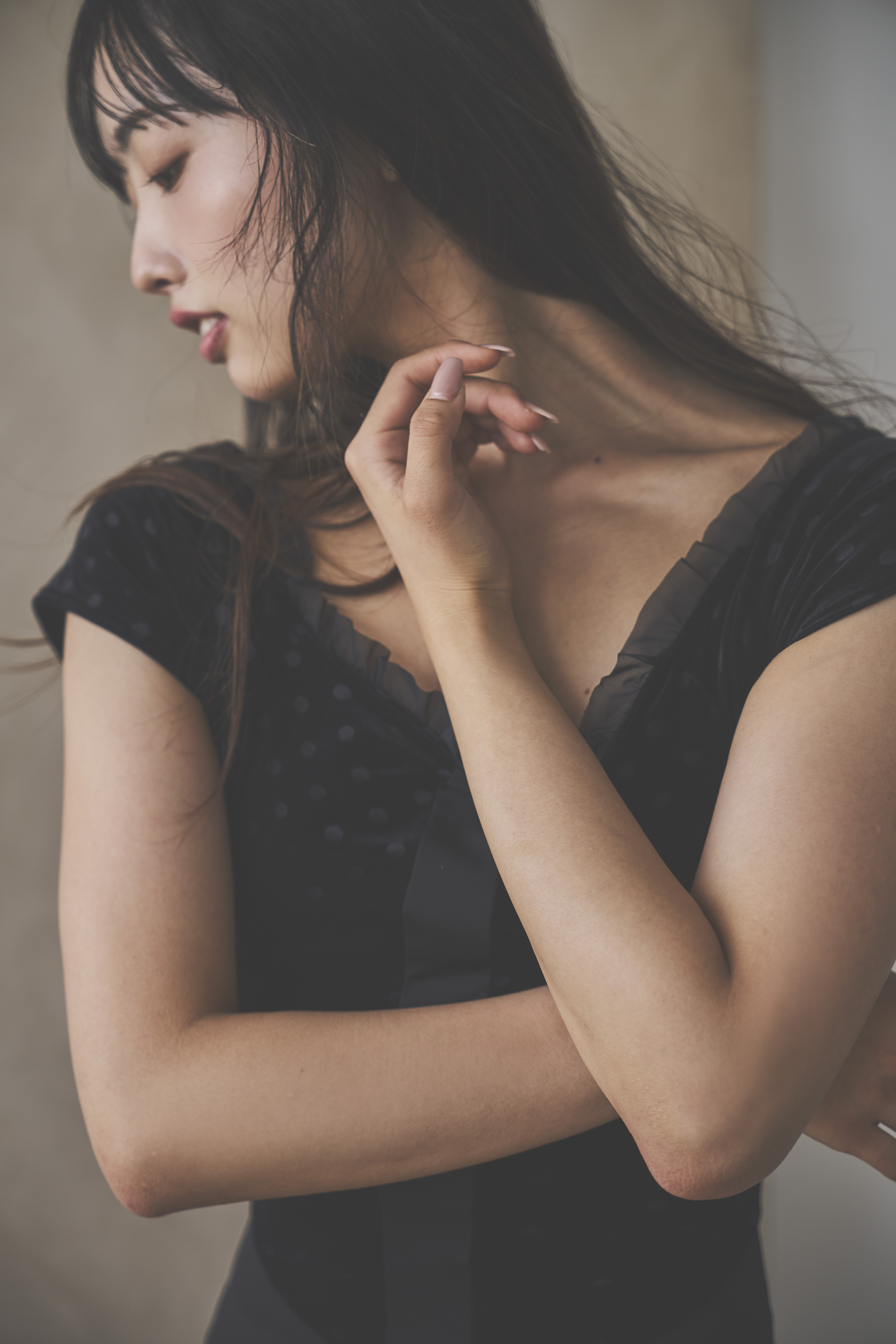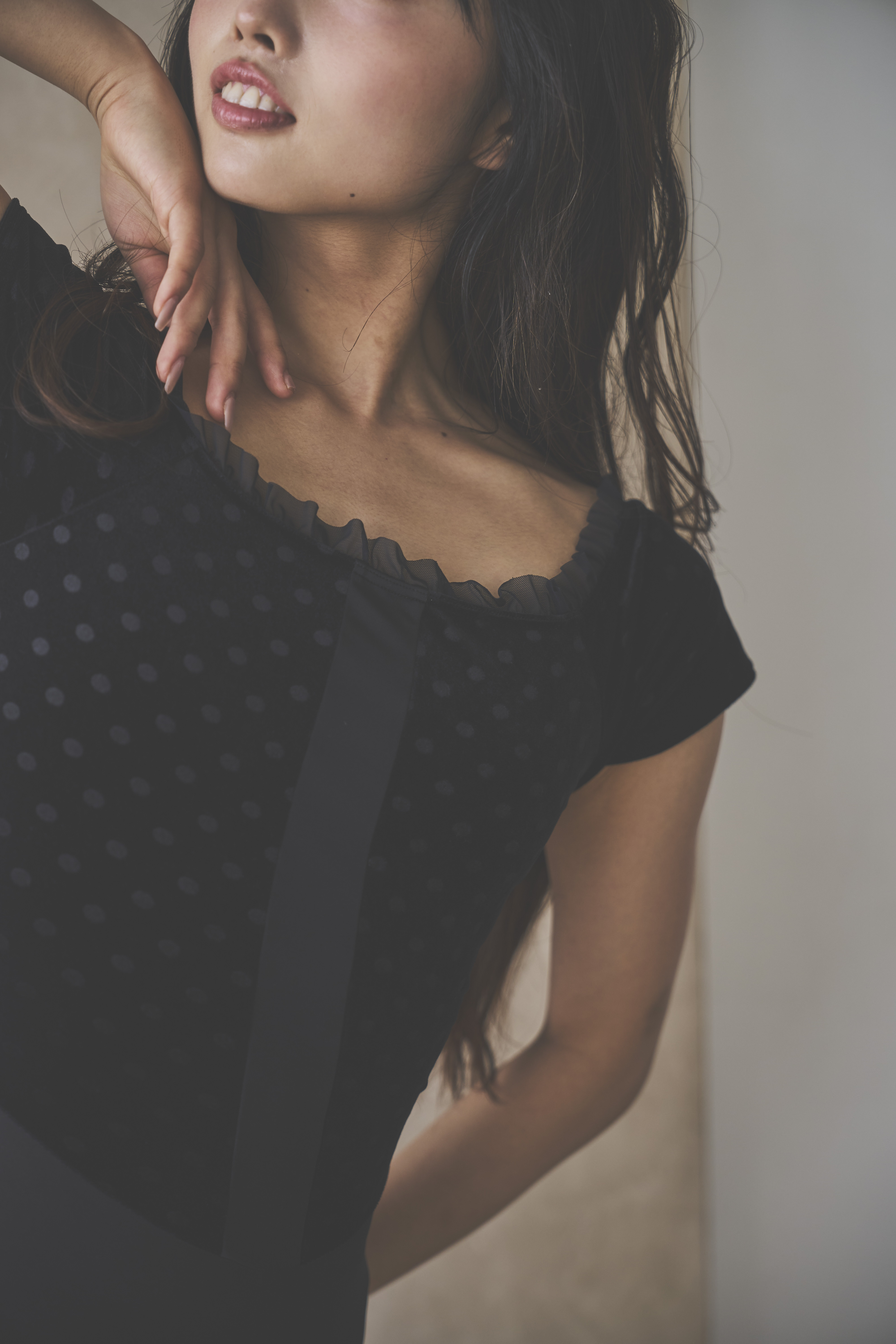 パフスリーブの可憐さが絶妙に調和し、品よく洗練された一着に仕上げています。