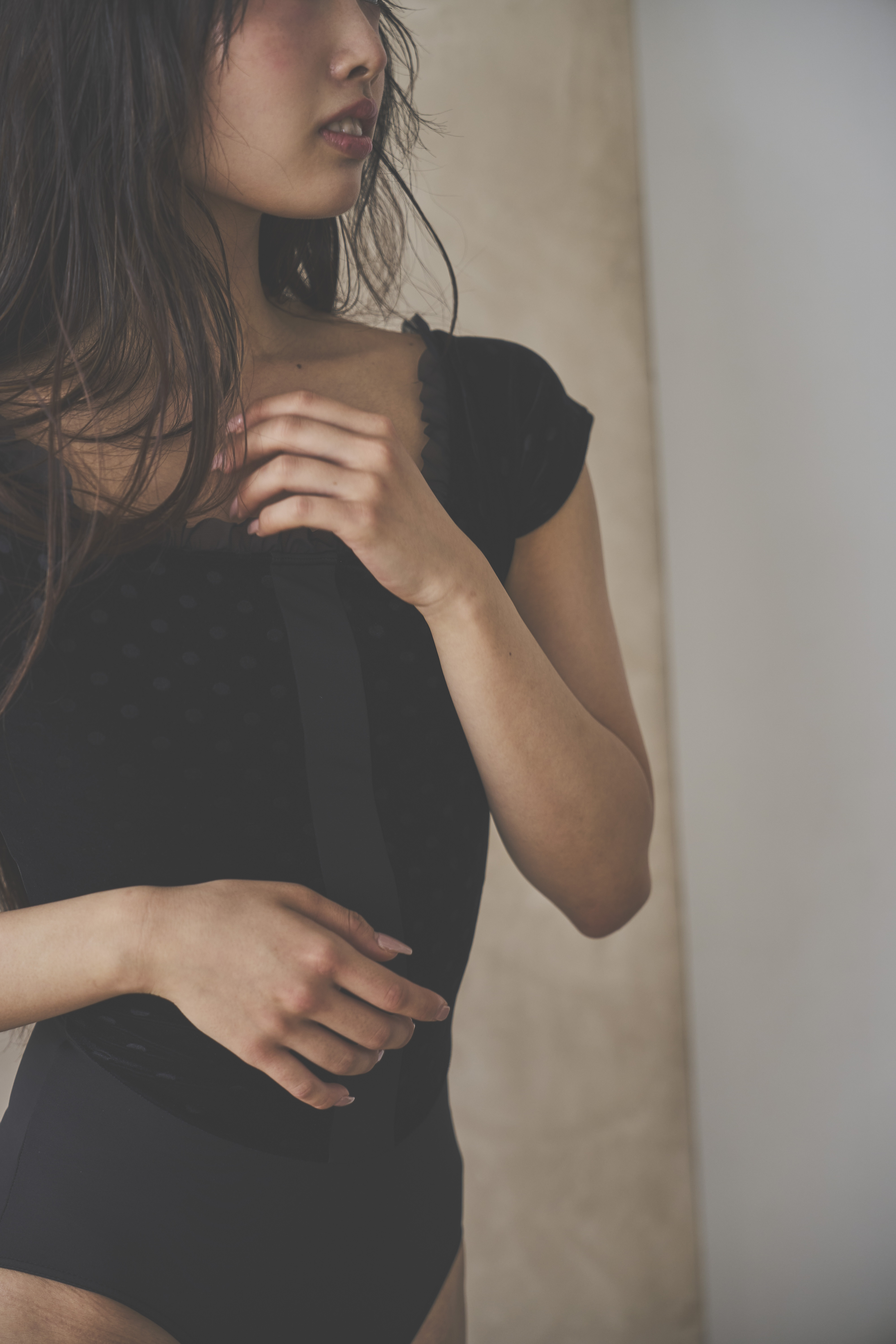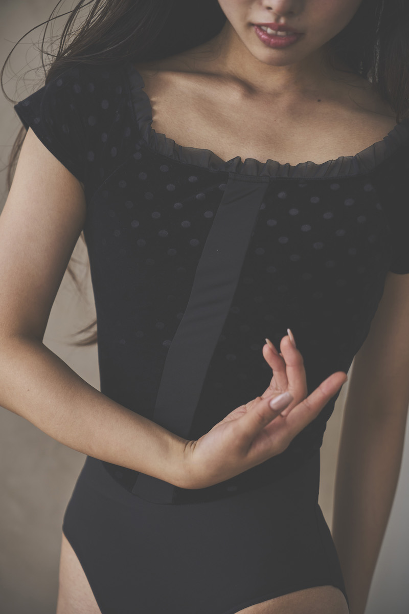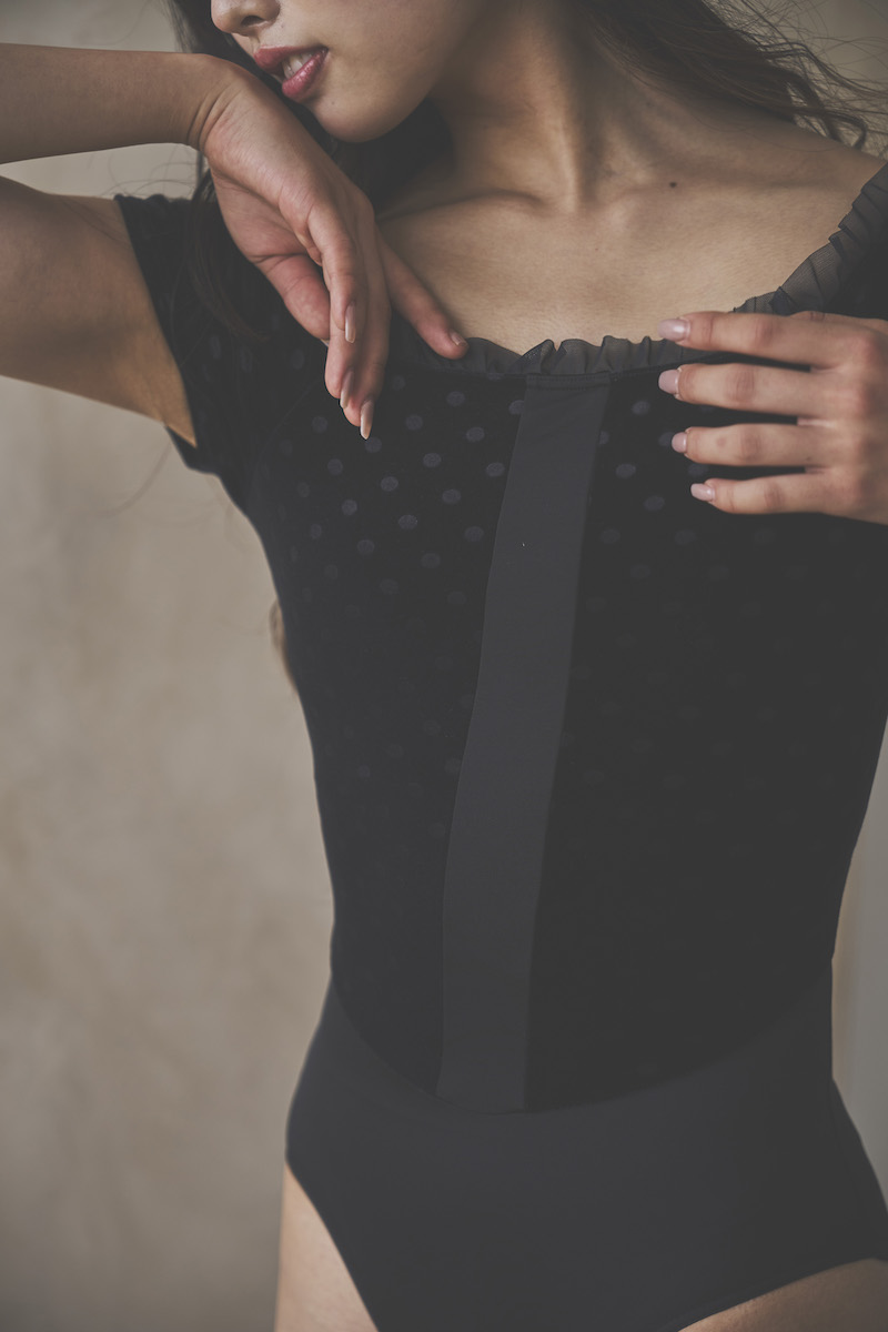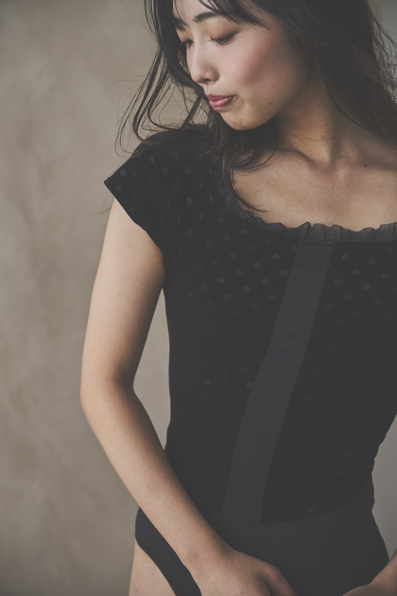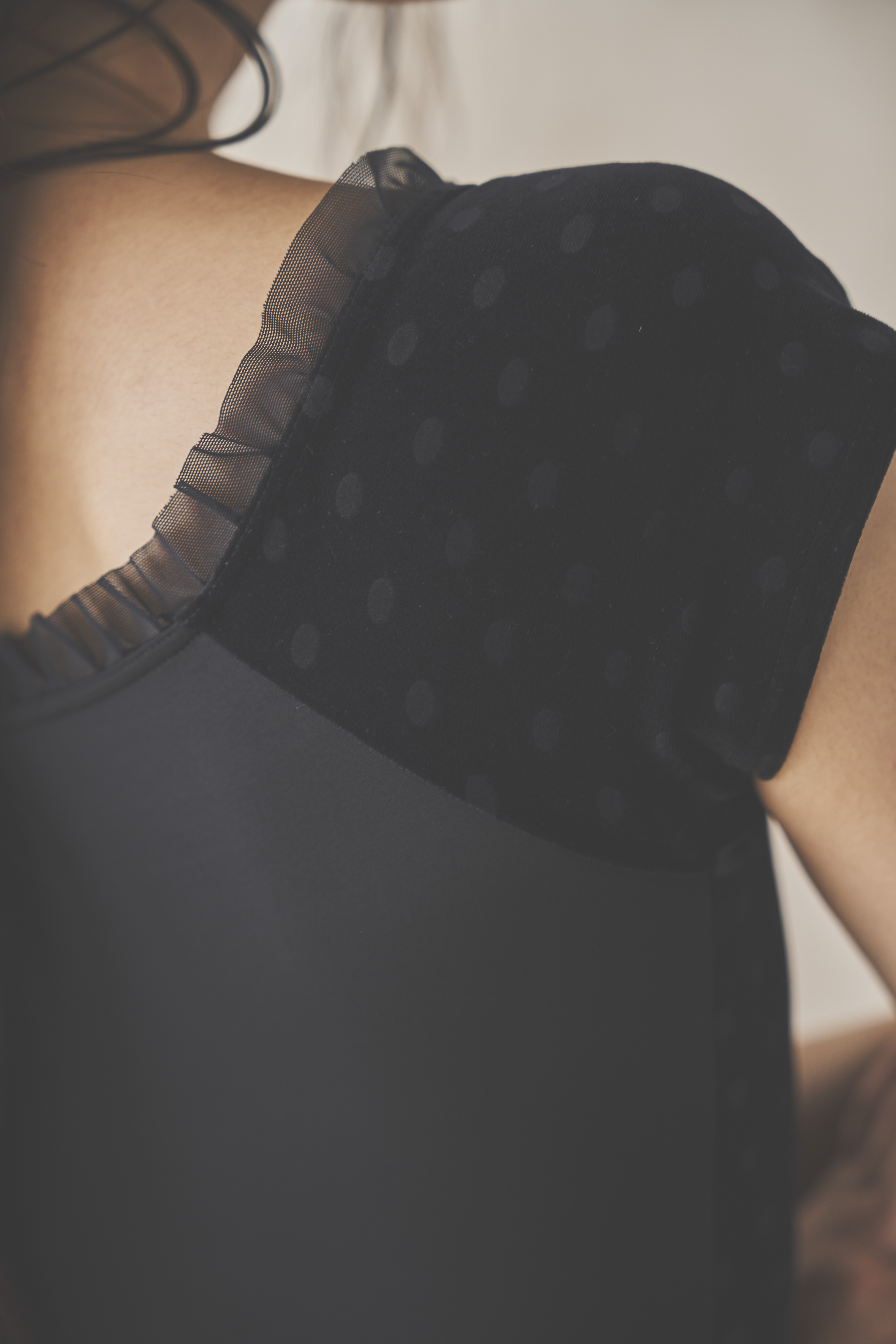 パフスリーブの可憐さが絶妙に調和し、品よく洗練された一着に仕上げています。