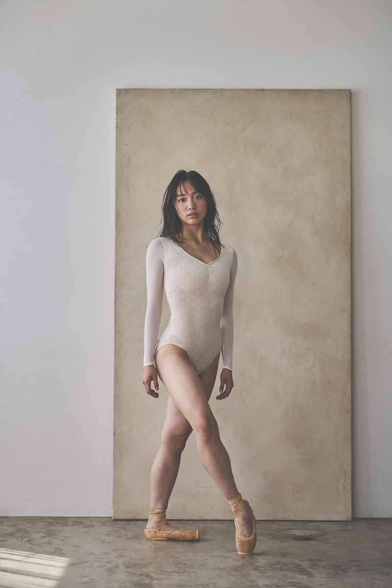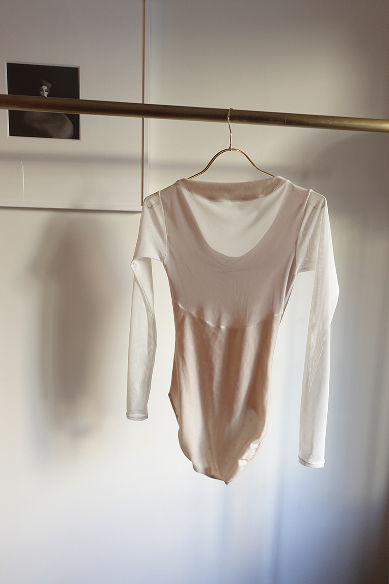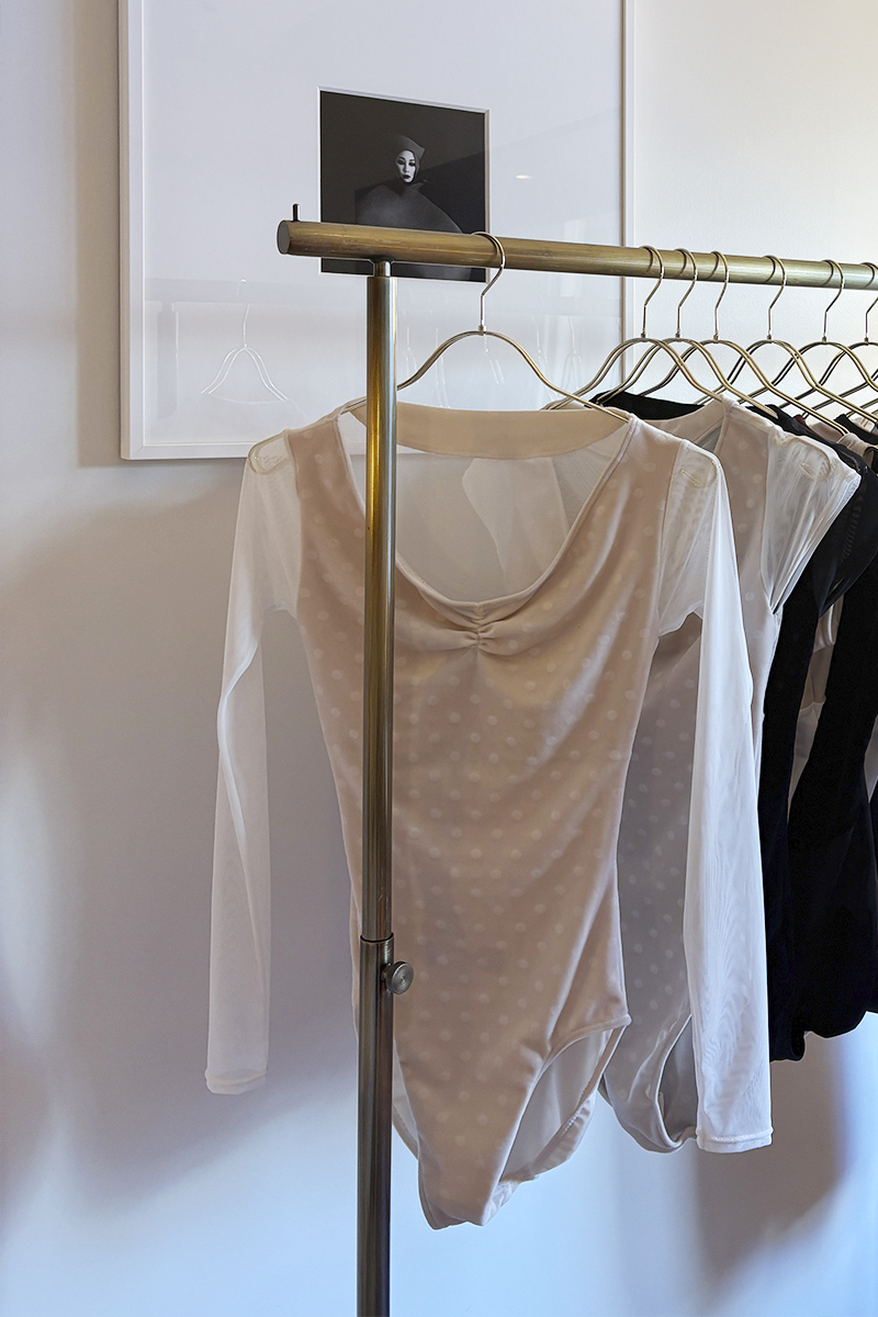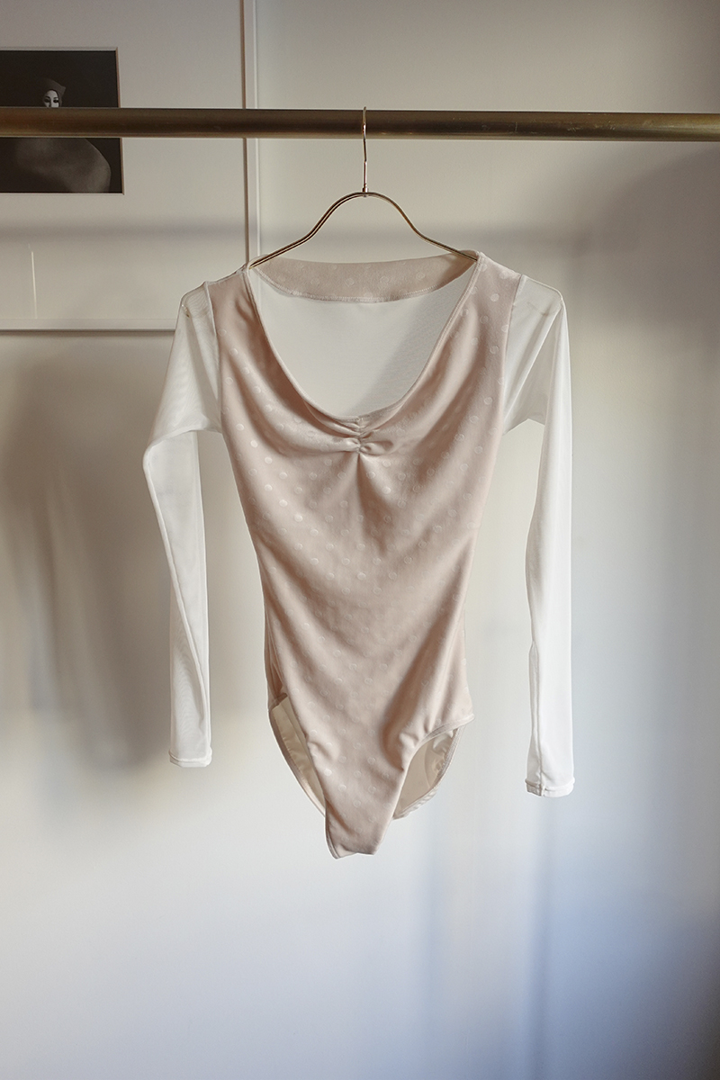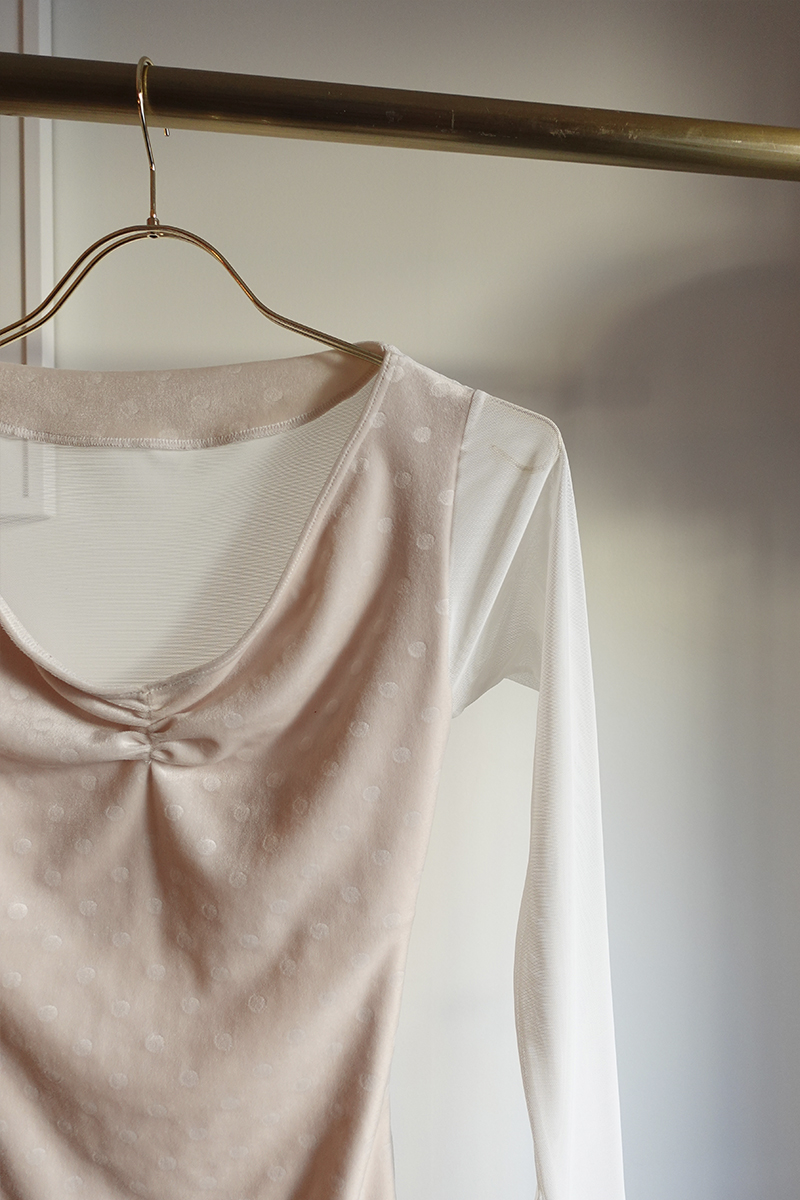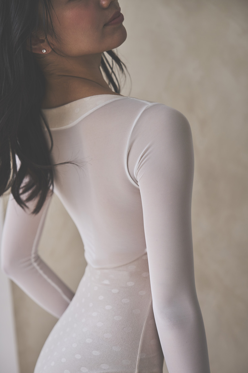 ベロアドットの柔らかな光沢に、シースルーの長袖が寄り添い、