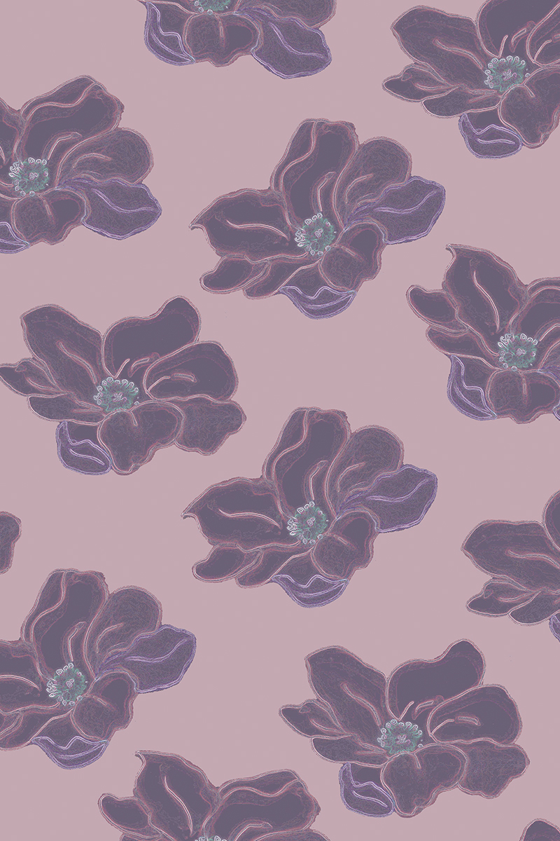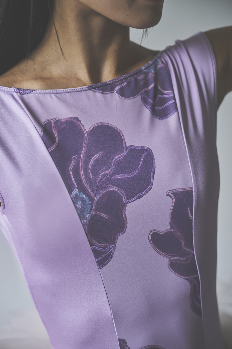 淡いラベンダー地に、パープルの花々が柔らかく浮かび上がるstinaオリジナルファブリック。