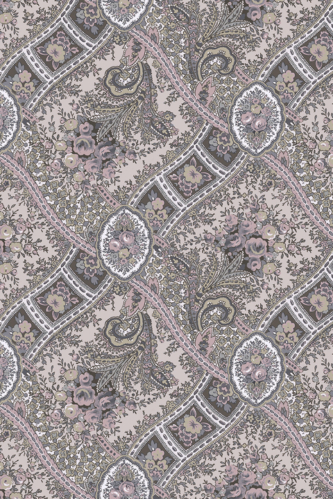 繊細な花々とクラシカルなペイズリー柄が美しく調和した、華やかで上品なファブリック。