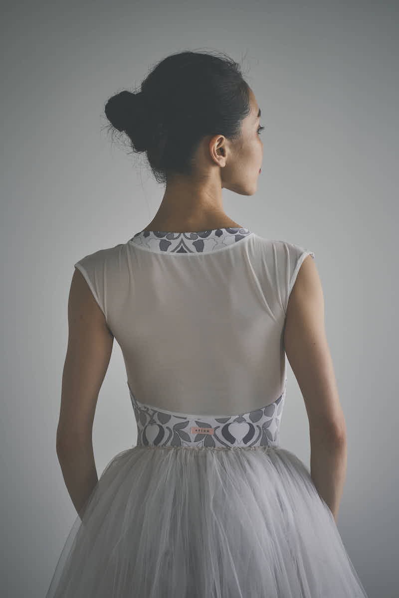 シンプルな型でありながら背面にも拘り、パワーネットの透け感が上品さをプラスしエレガントなラインに。背面の首元に柄生地で施されたトリムがよりスタイリッシュな一枚に。