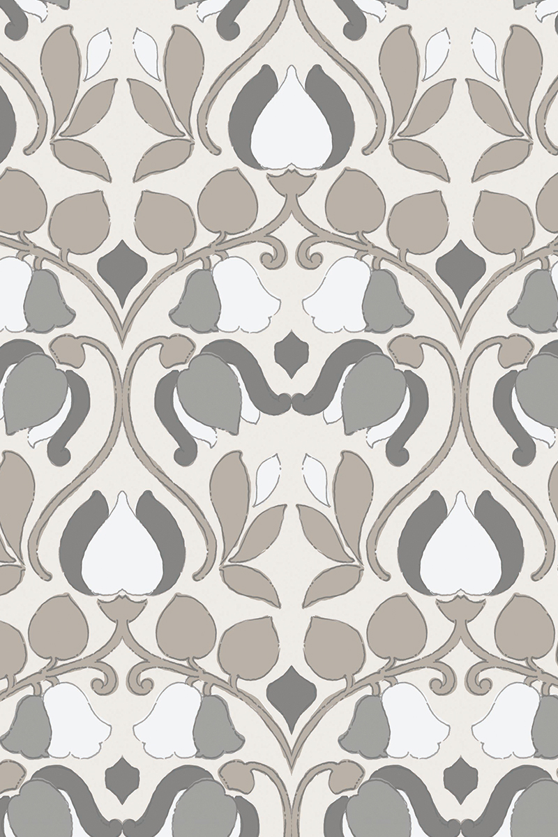 規則的に並んだリリーモチーフが、柔らかさと凛とした印象のコントラストを引き立てるモダンなテキスタイル。