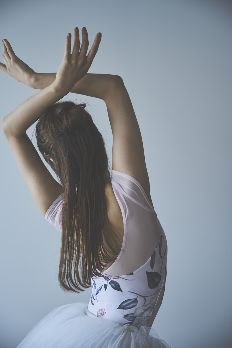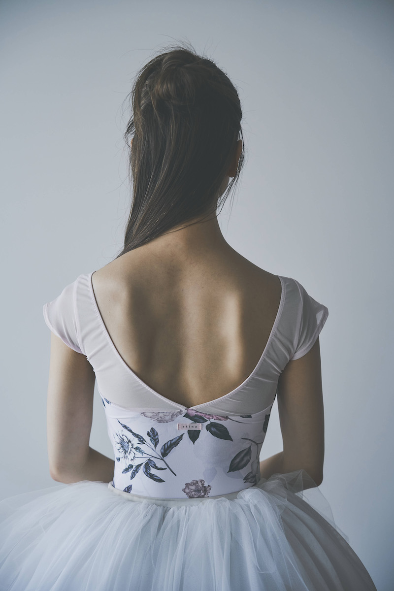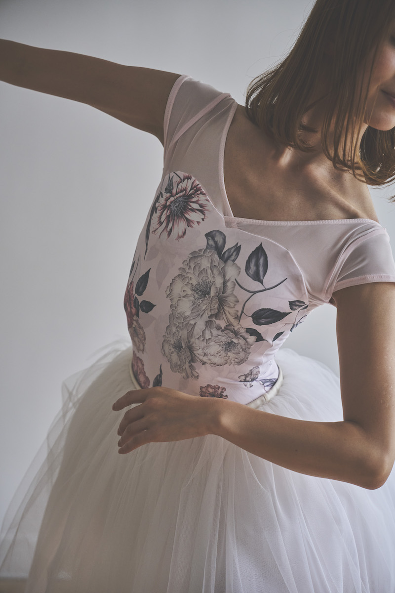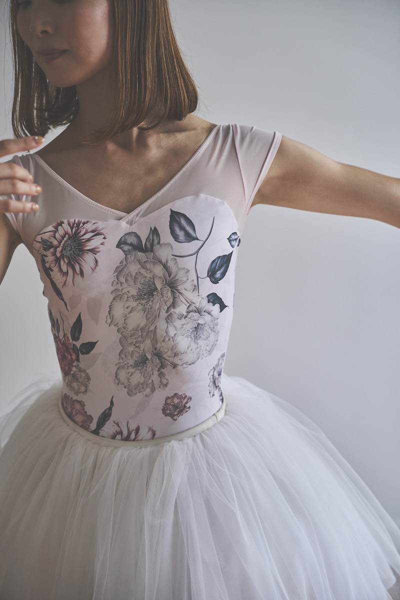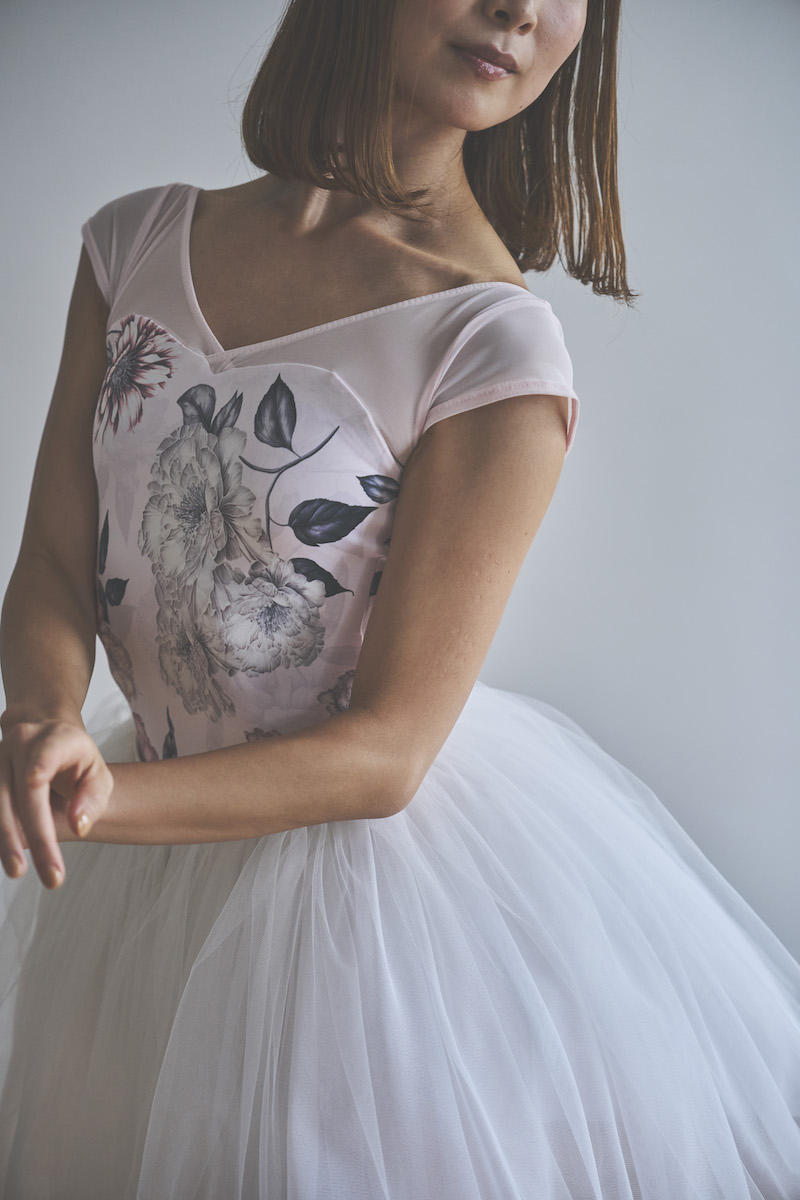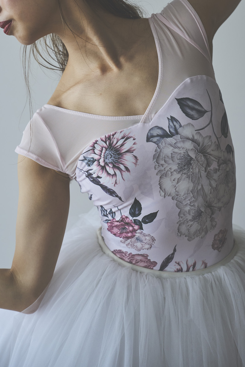 ライトピンクのベースは肌を明るく見せ、柔らかな魅力と心ときめく可憐さを纏うレオタード。