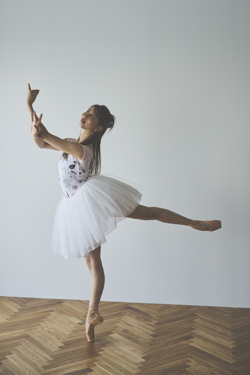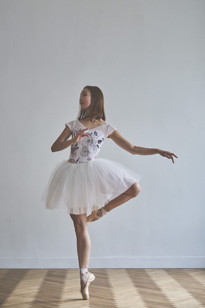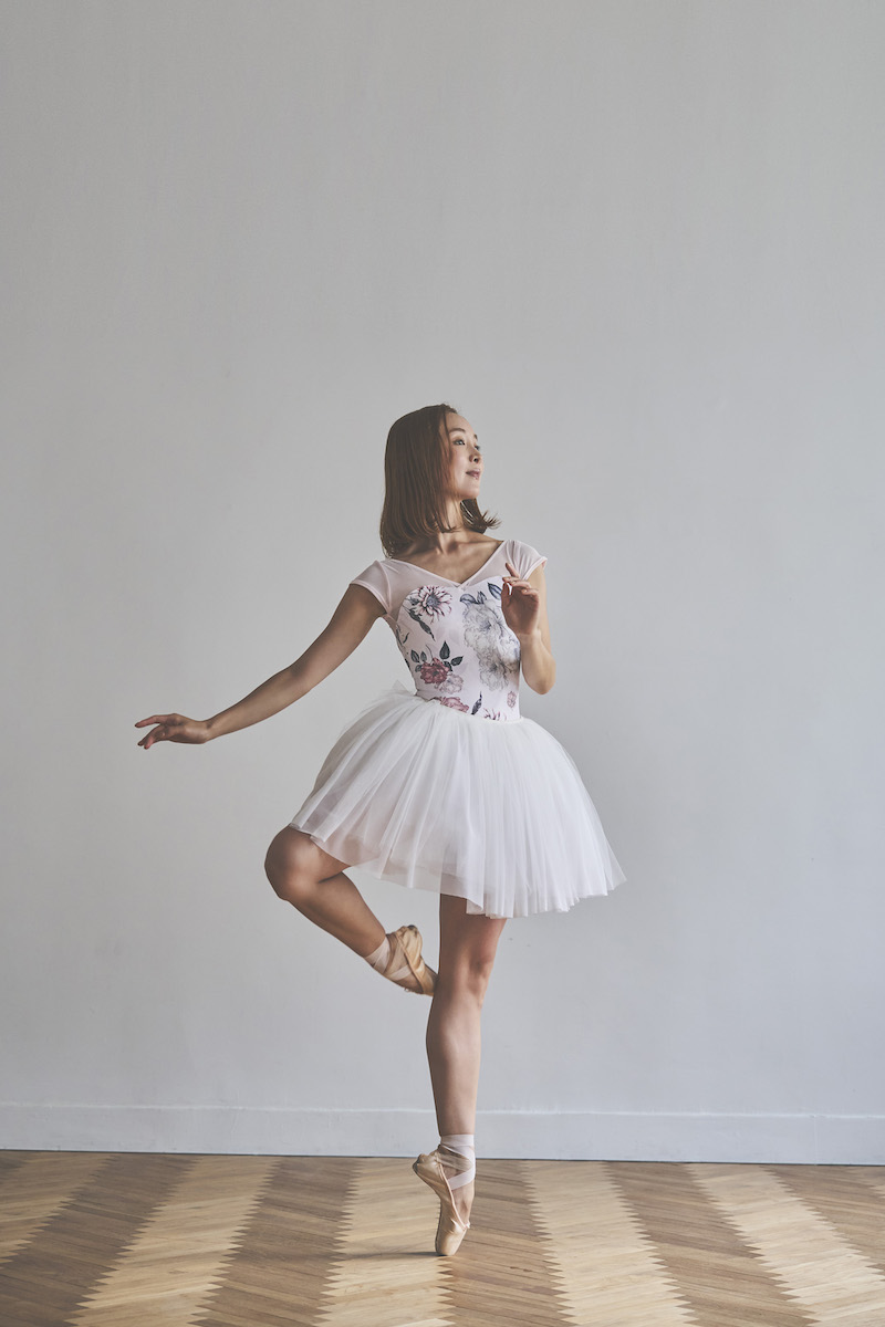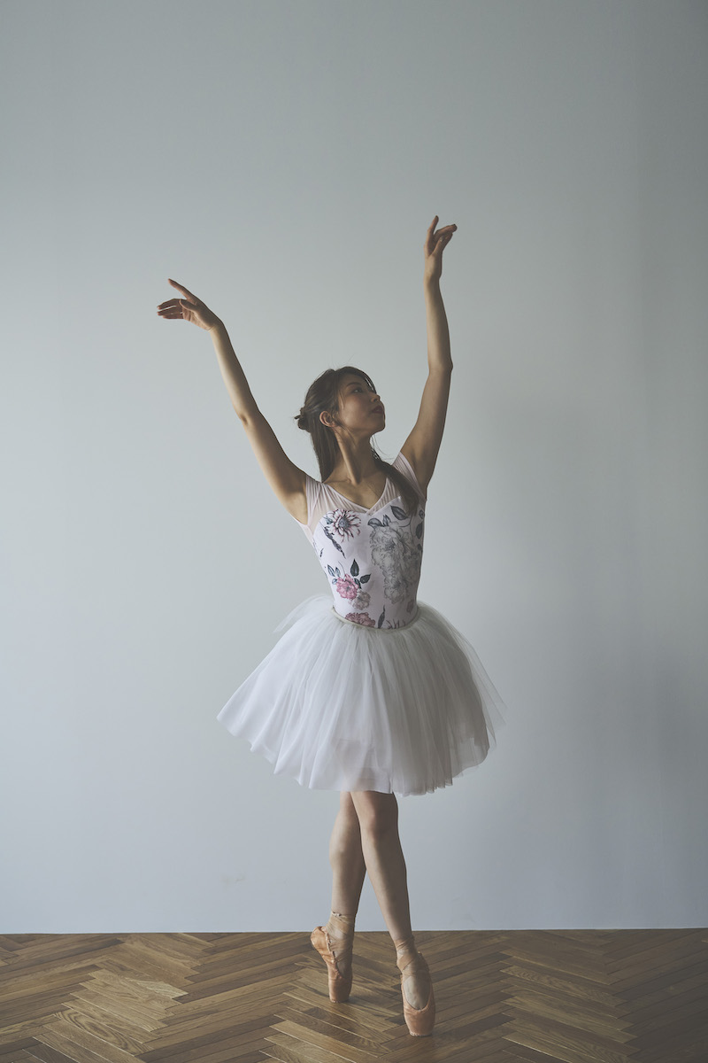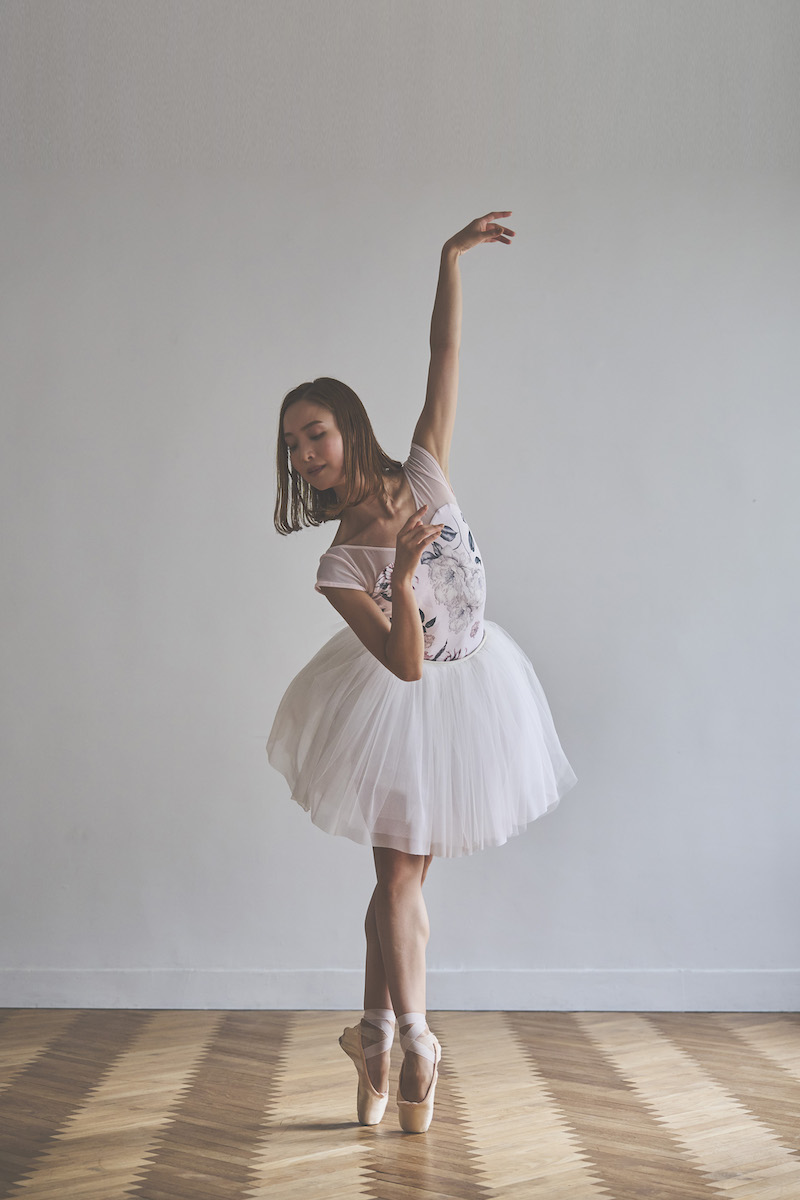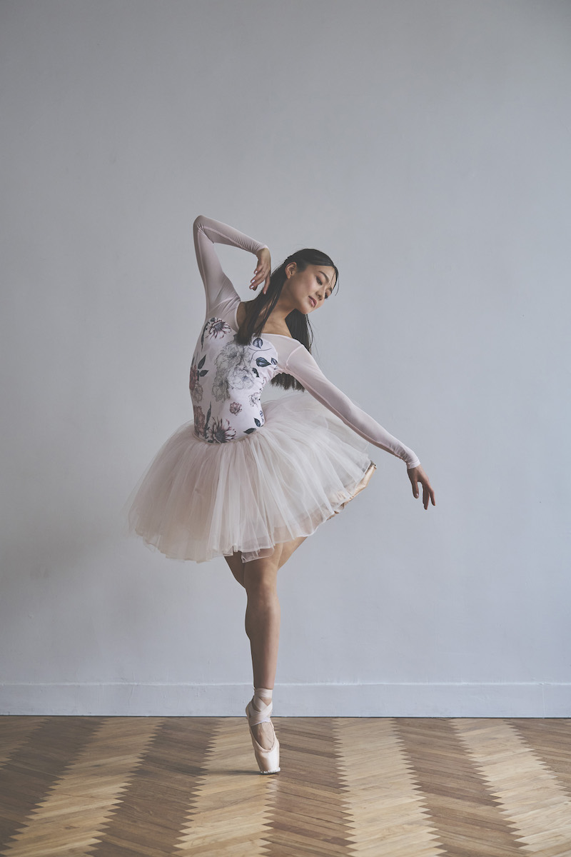 ライトピンクのベースは肌を明るく見せ、柔らかな魅力と心ときめく可憐さを纏うレオタード。