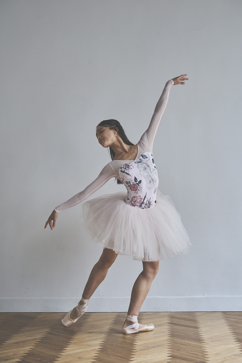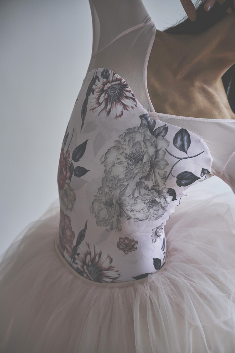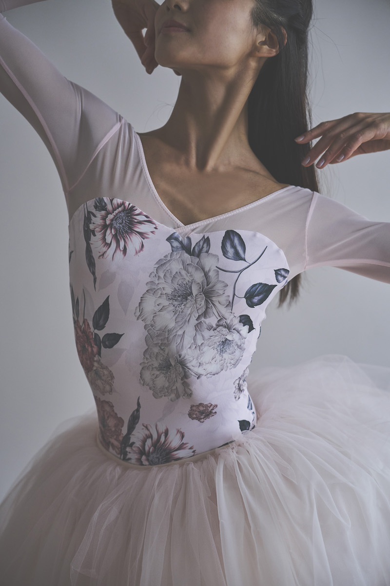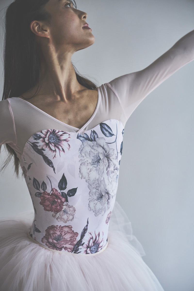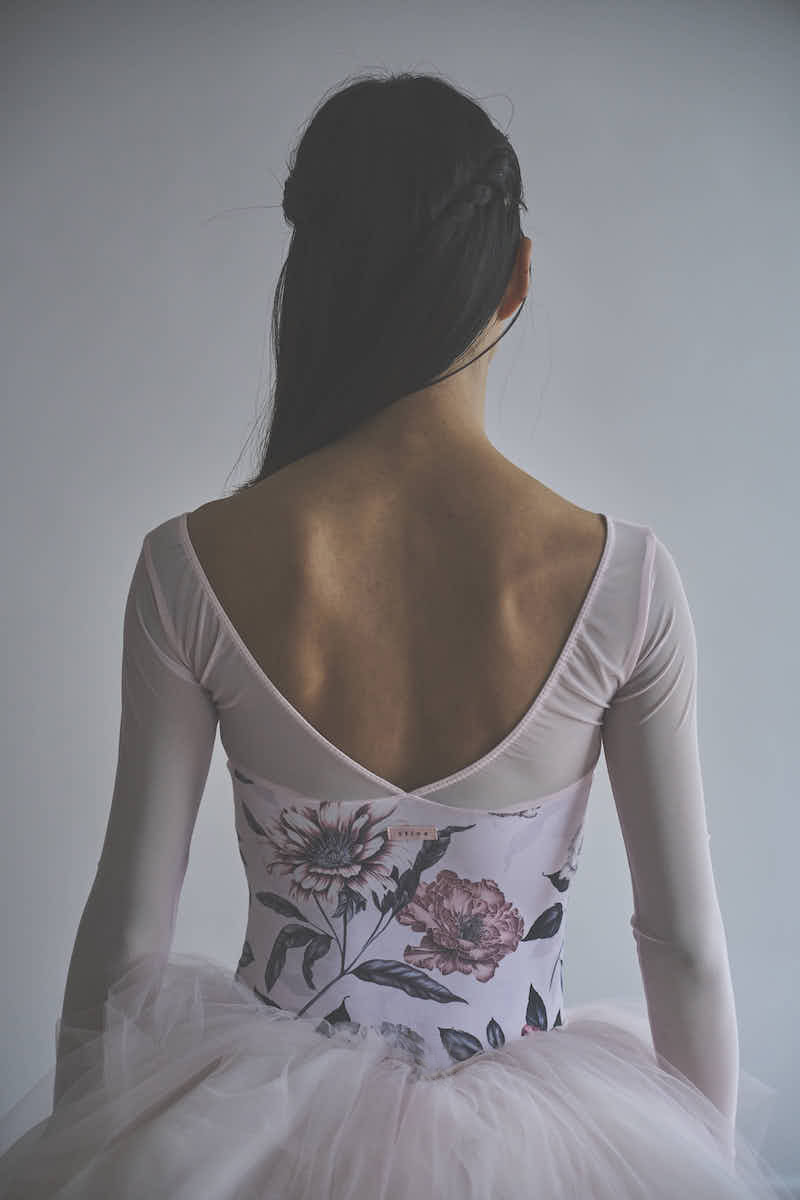 ライトピンクのベースは肌を明るく見せ、柔らかな魅力と心ときめく可憐さを纏うレオタード。