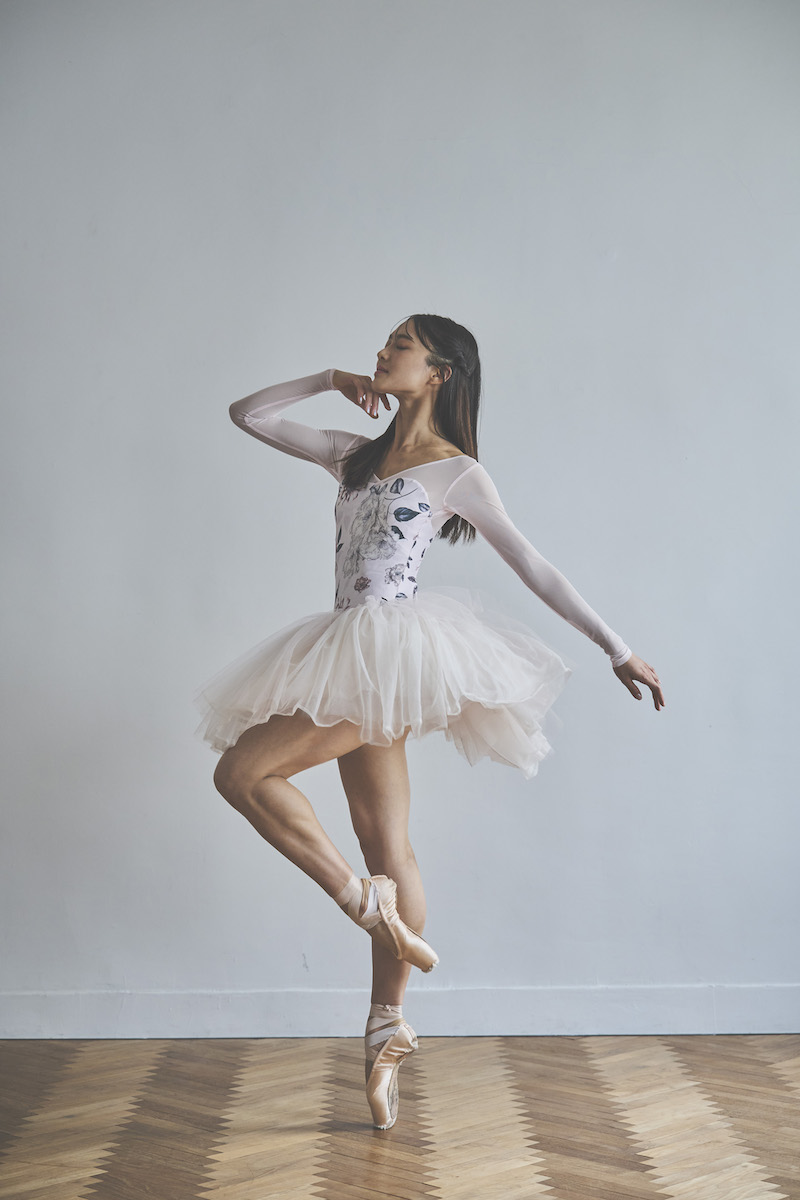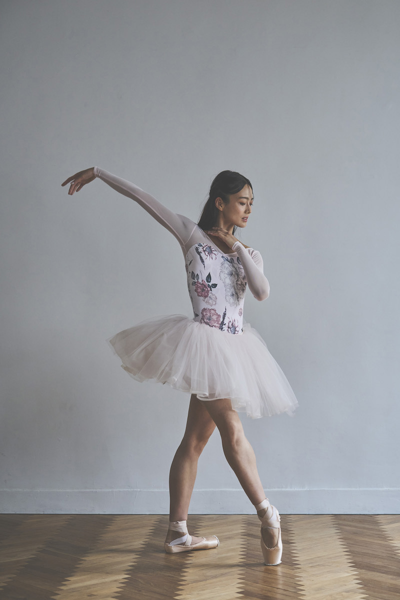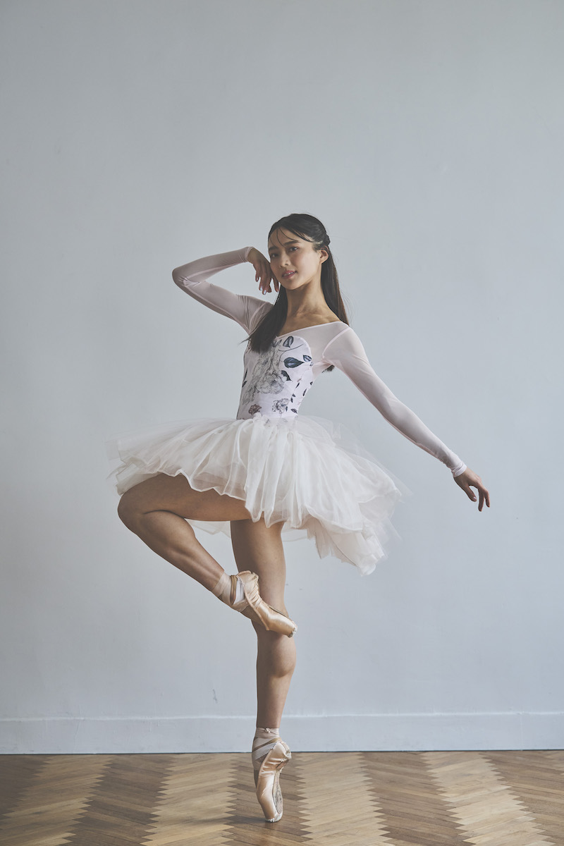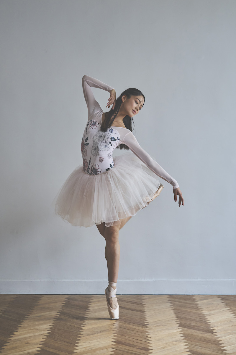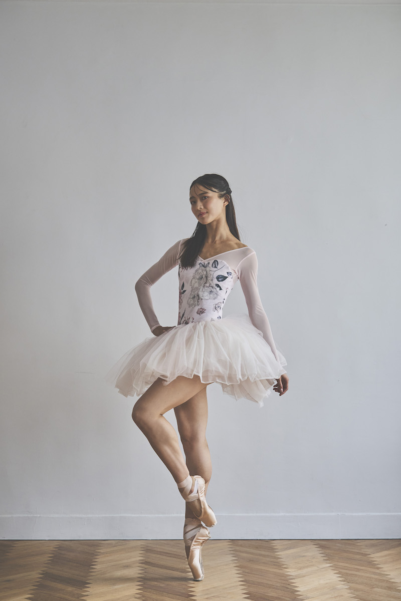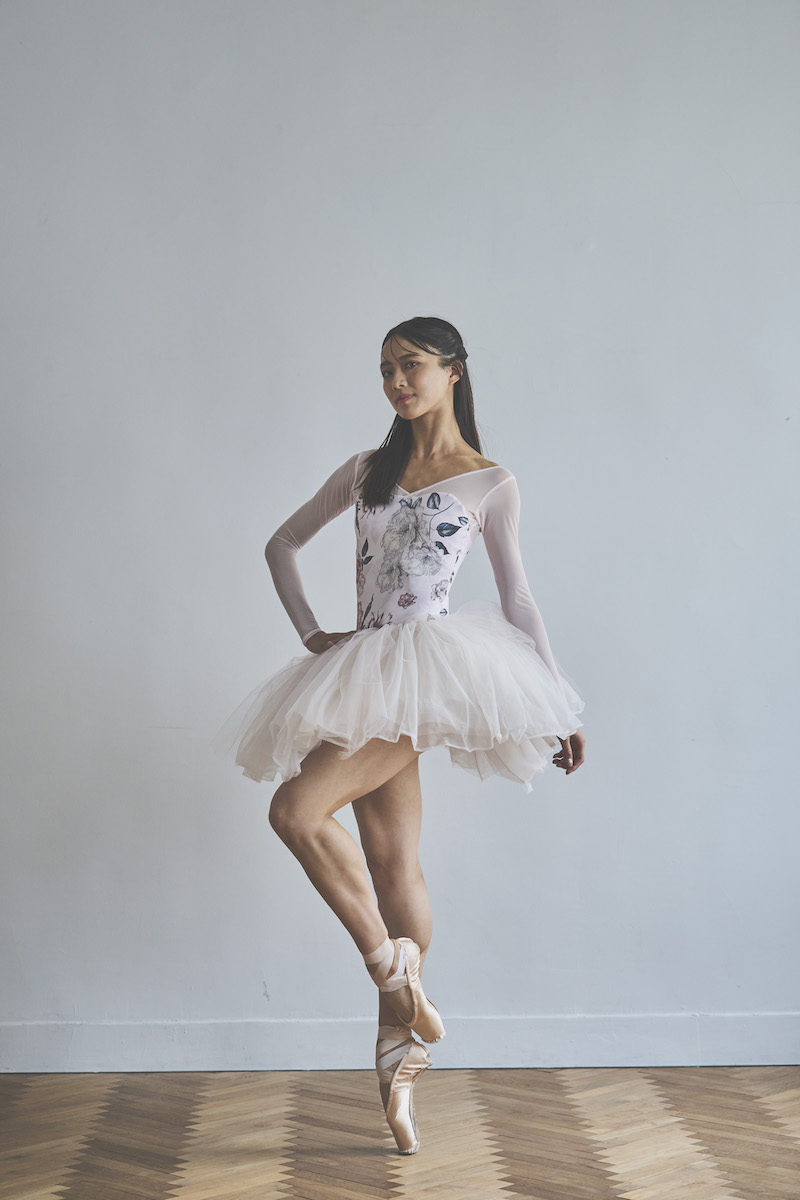 ライトピンクのベースは肌を明るく見せ、柔らかな魅力と心ときめく可憐さを纏うレオタード。