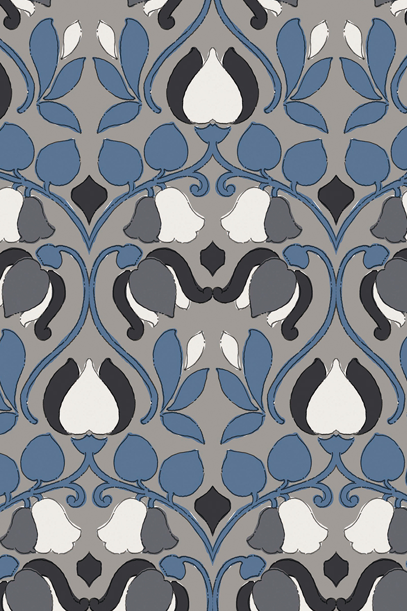 規則的に並んだリリーモチーフが、柔らかさと凛とした印象のコントラストを引き立てるモダンなテキスタイル。
