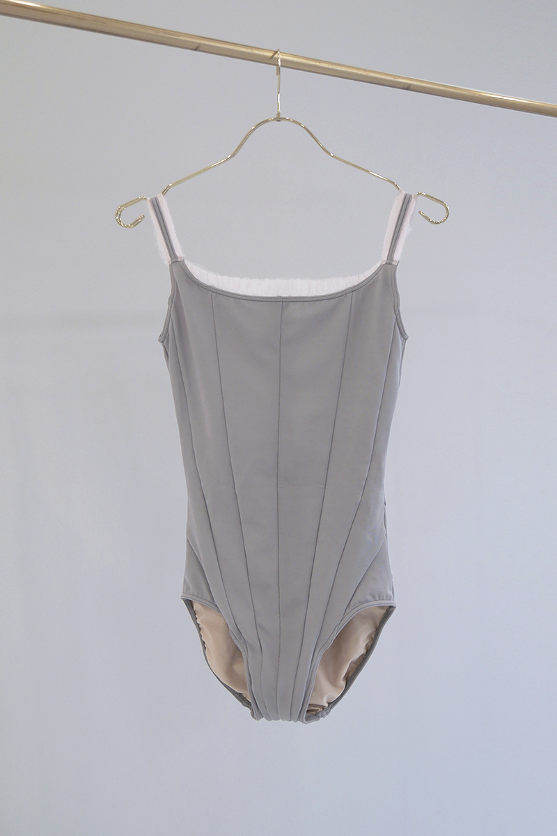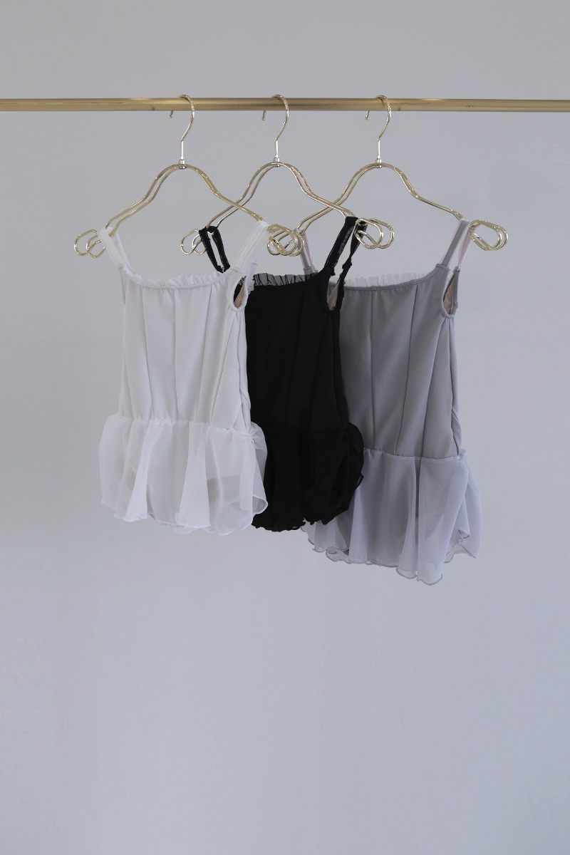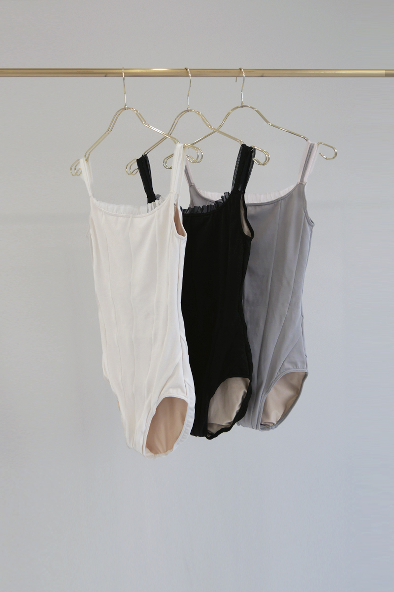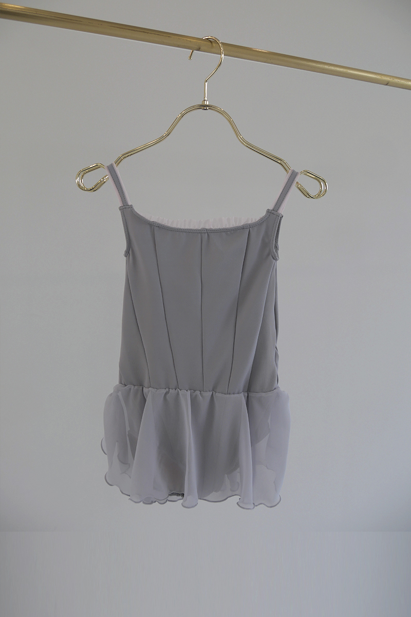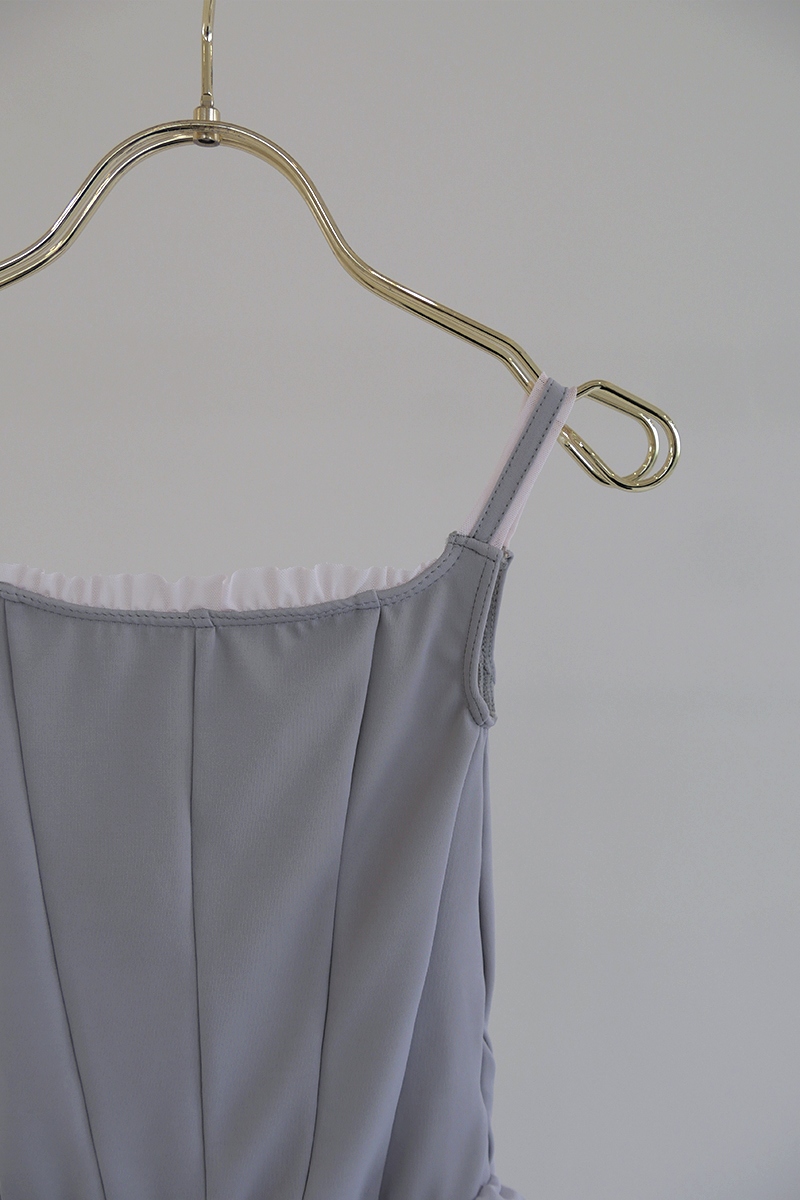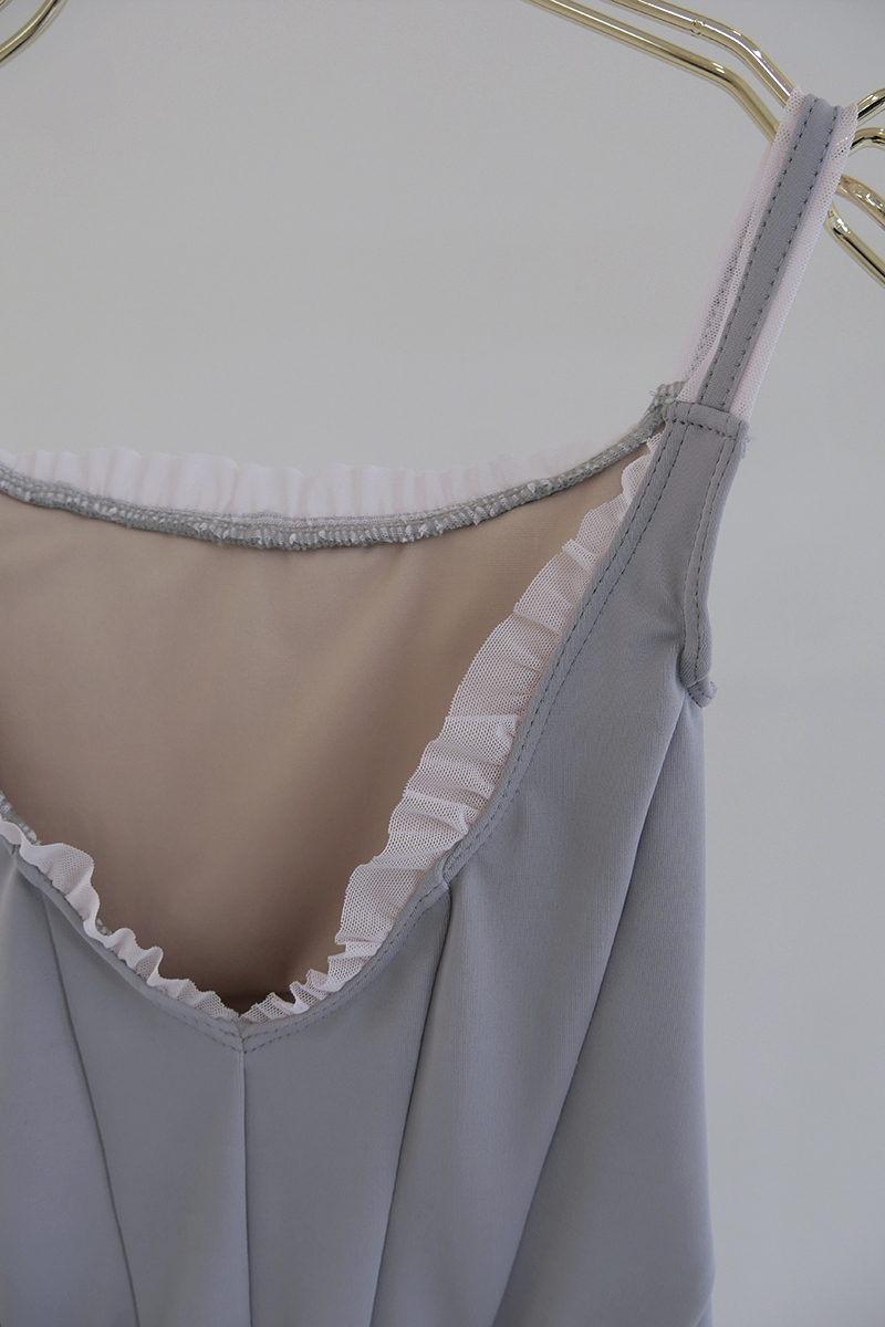 ライトグレーはネックラインに、ピンクとグレーの2色を重ねた繊細なフリルをあしらい、上品な可愛らしさと奥行きのある表情を生み出します。