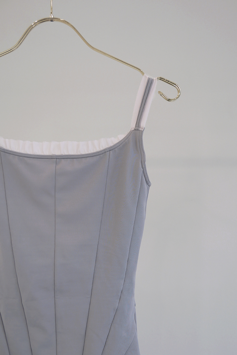 立体的で美しいボディラインを演出しつつ、スクエアネックと控えめなフリルが、クラシックでモードな印象を両立。