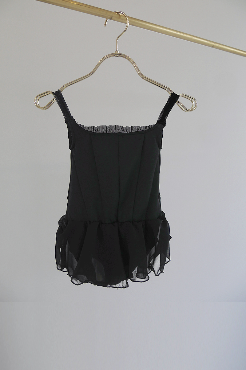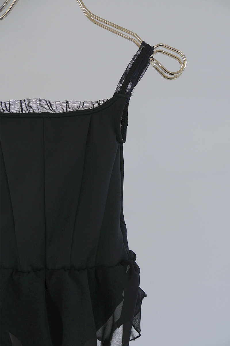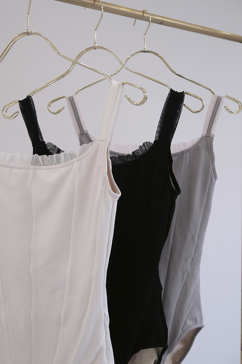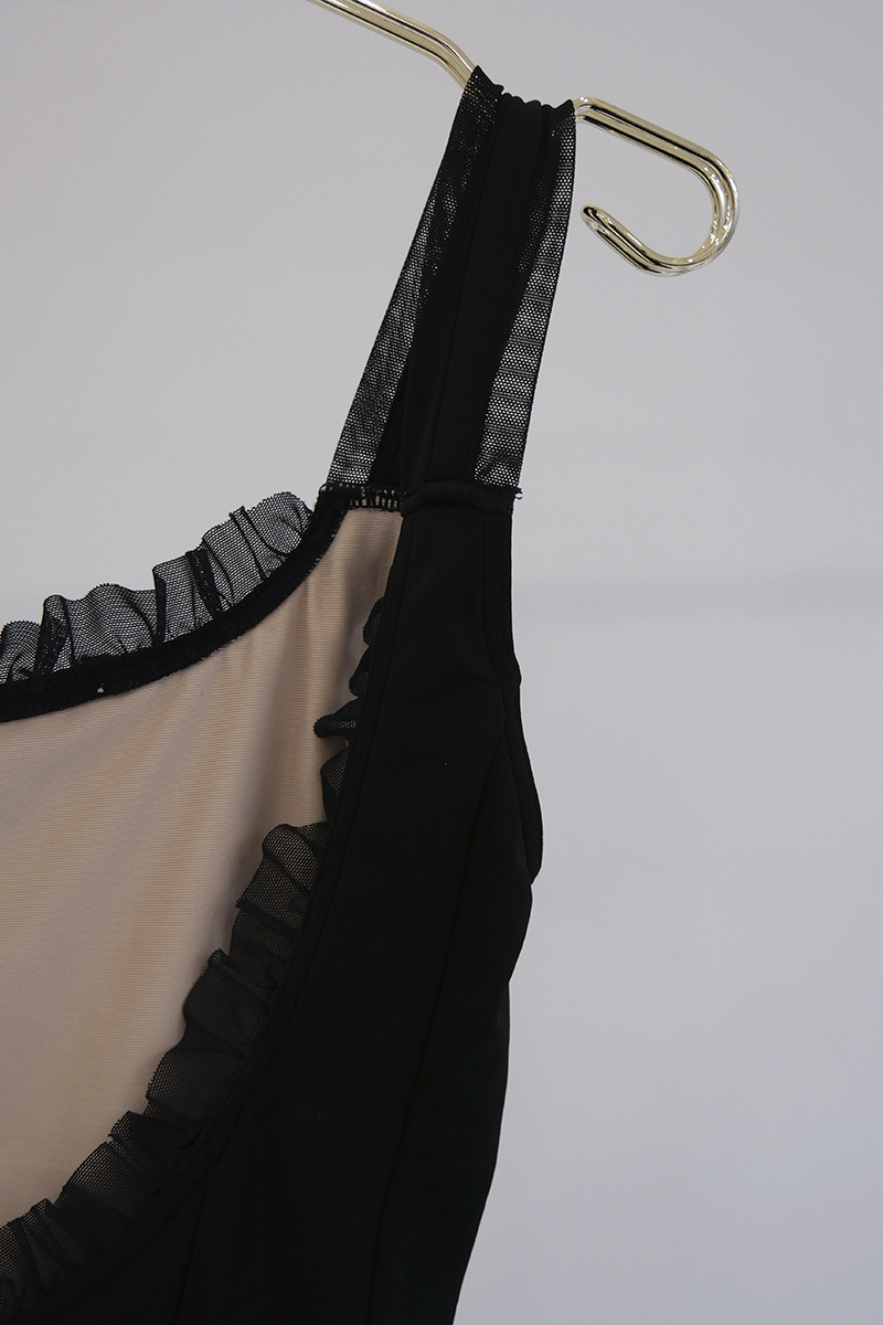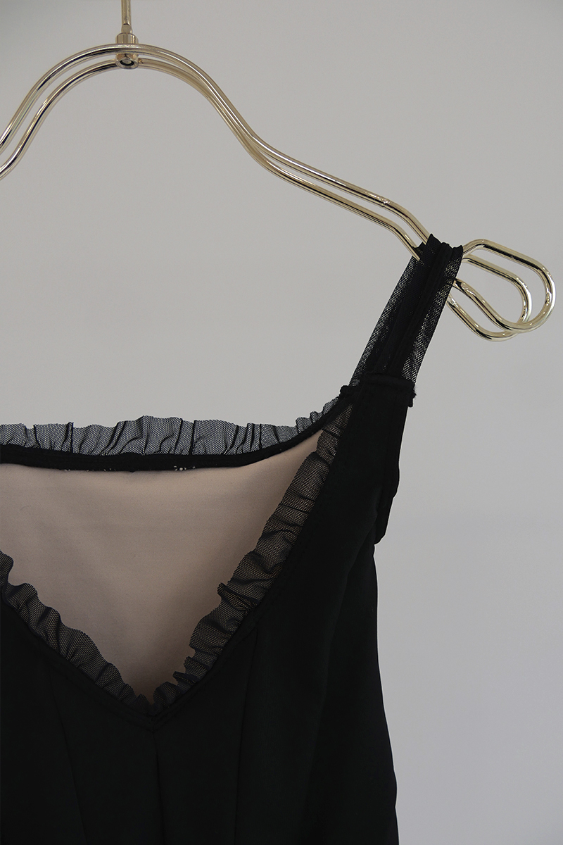 立体的で美しいボディラインを演出しつつ、スクエアネックと控えめなフリルが、クラシックでモードな印象を両立。