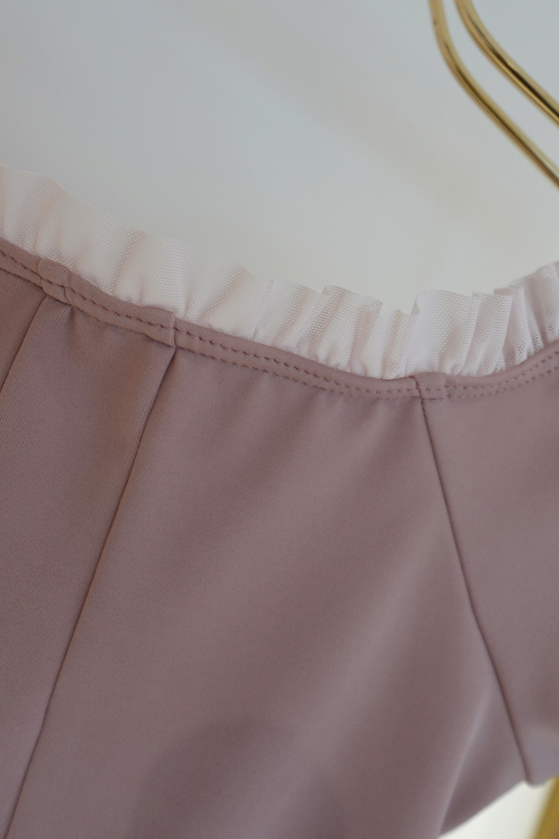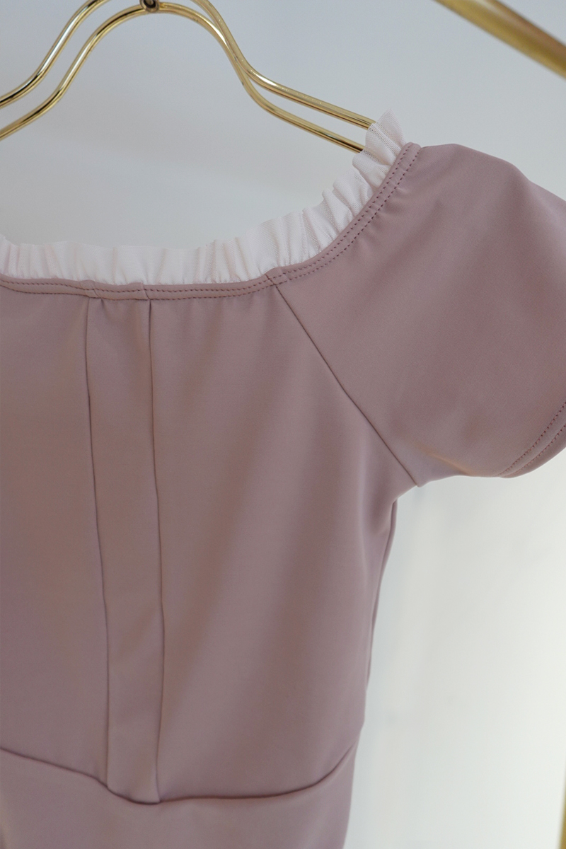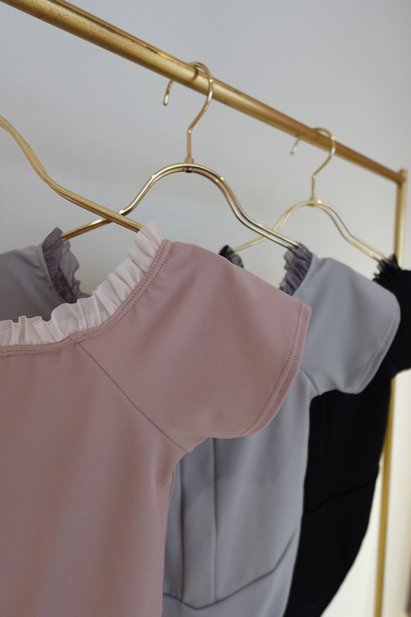 シンプルなラウンドネックにフリルを施し可愛らしさを演出。胸元の切り替えステッチが美しい陰影を生む「Dólce」。