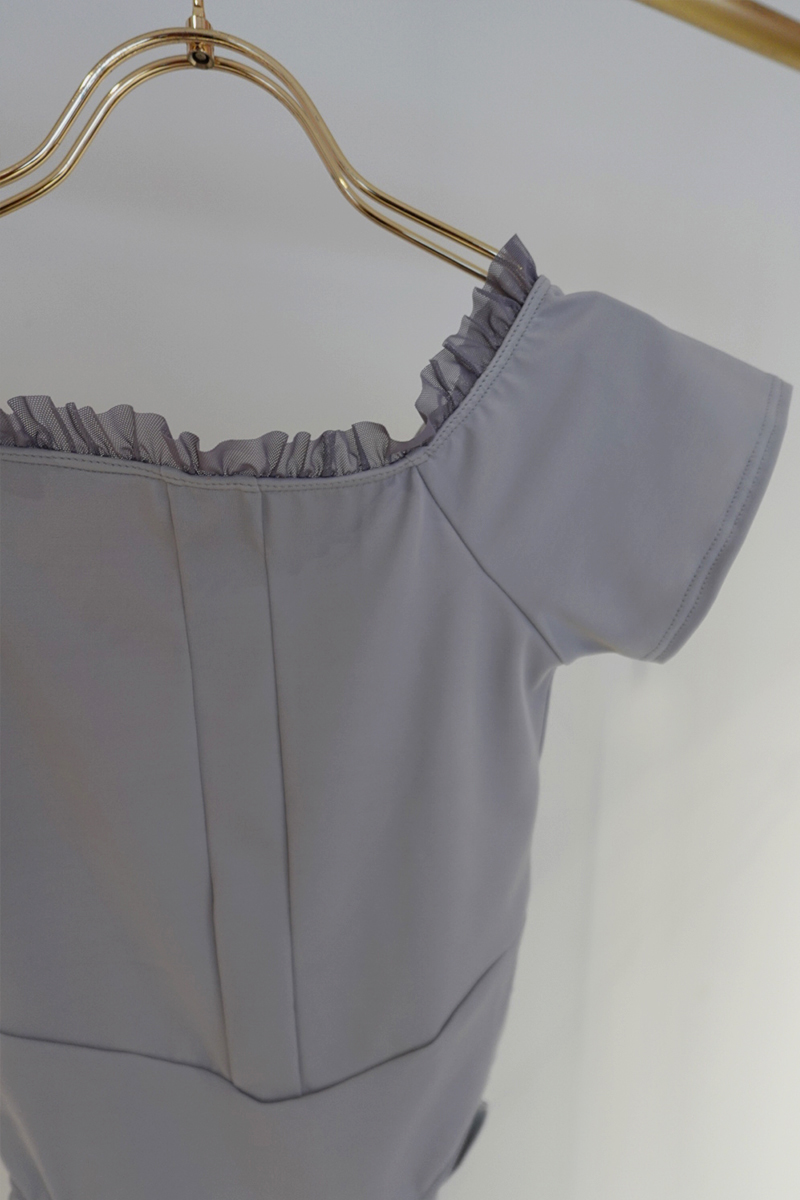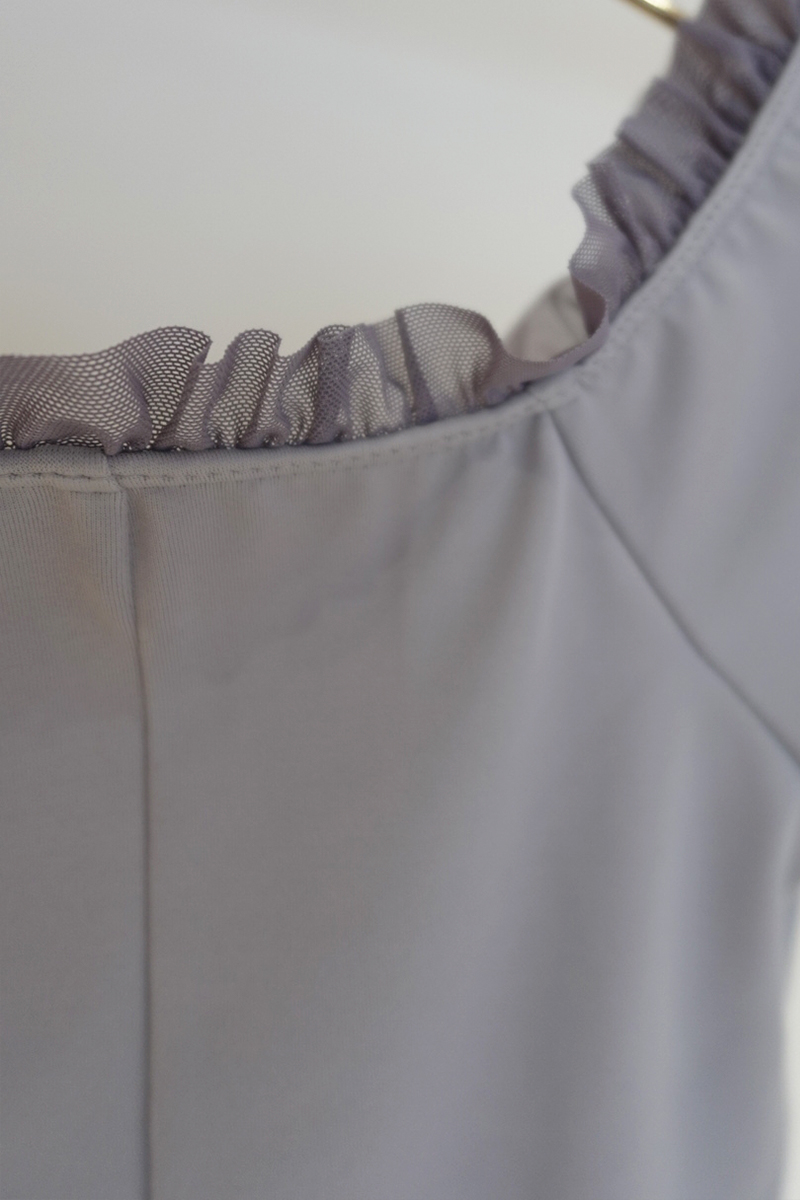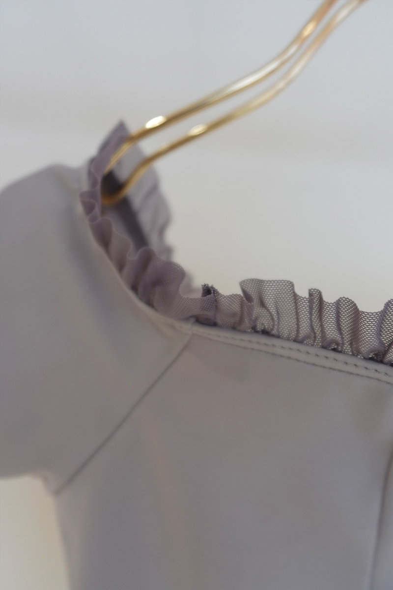 シンプルなラウンドネックにフリルを施し可愛らしさを演出。胸元の切り替えステッチが美しい陰影を生む「Dólce」。