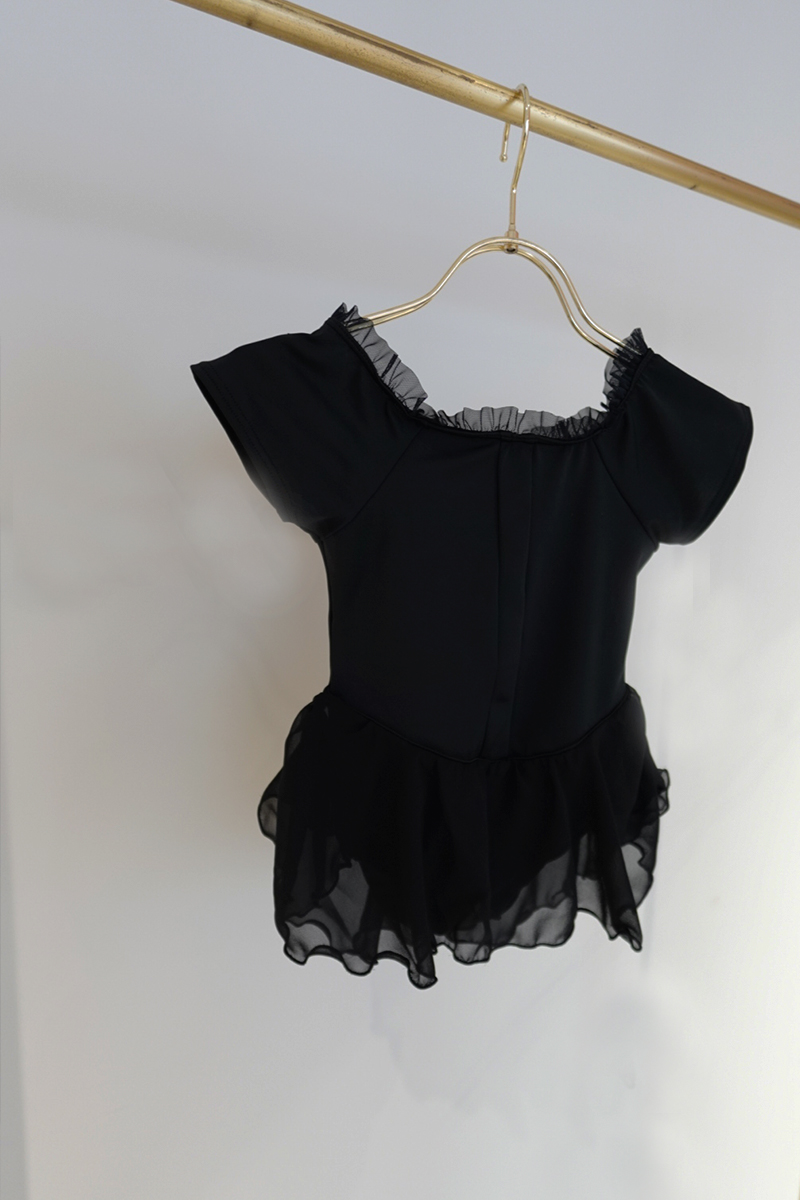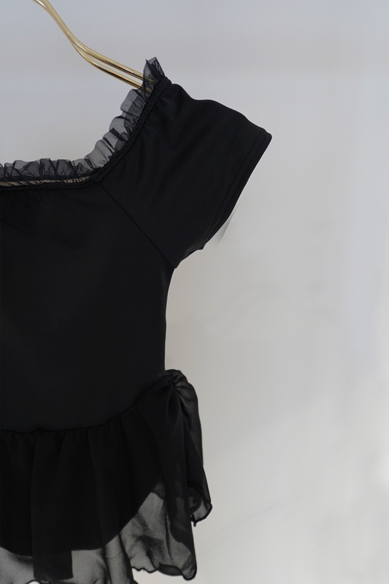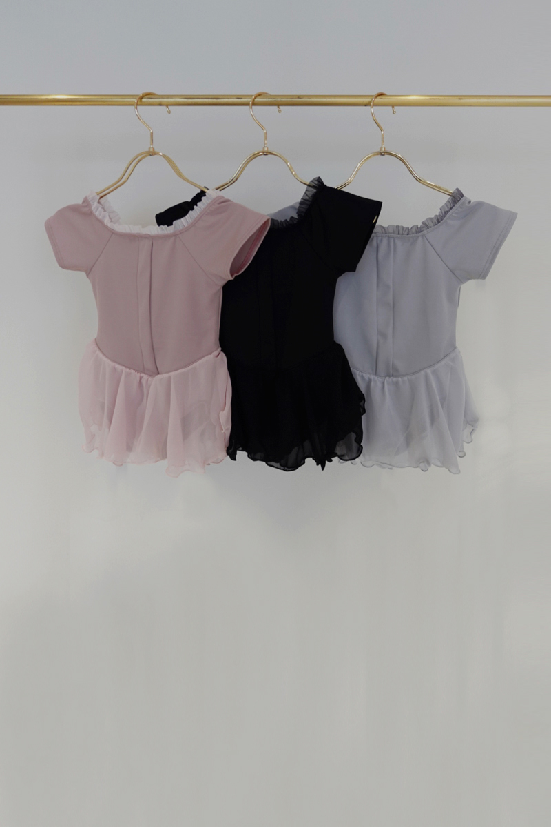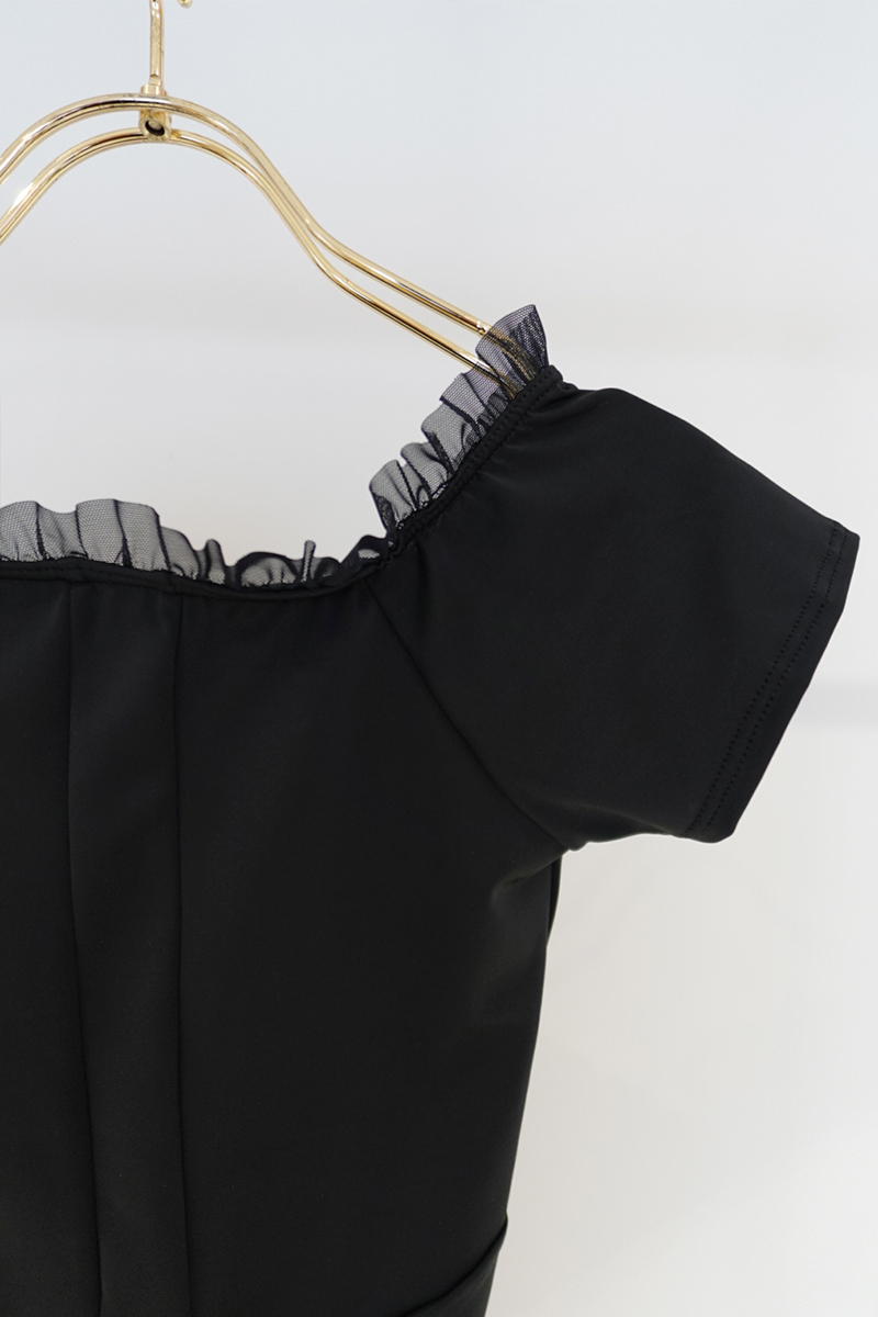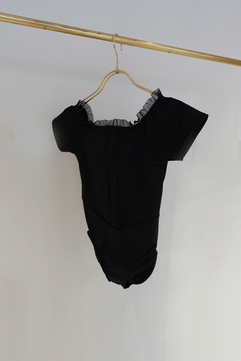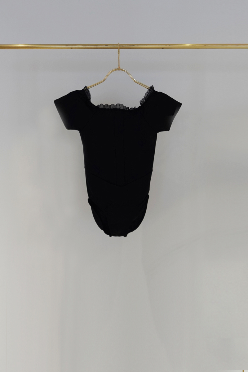 シンプルなラウンドネックにフリルを施し可愛らしさを演出。胸元の切り替えステッチが美しい陰影を生む「Dólce」。