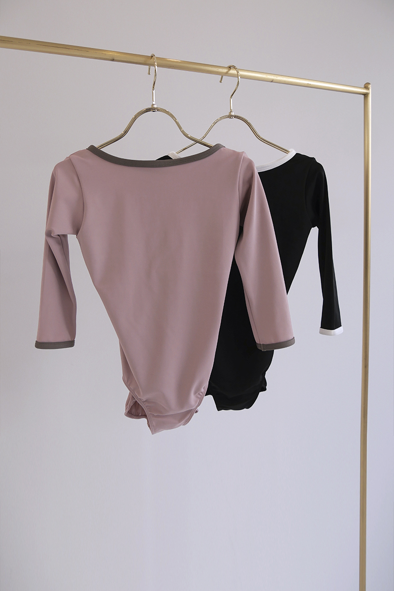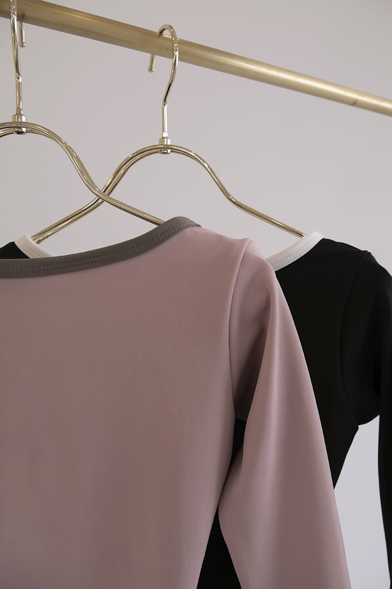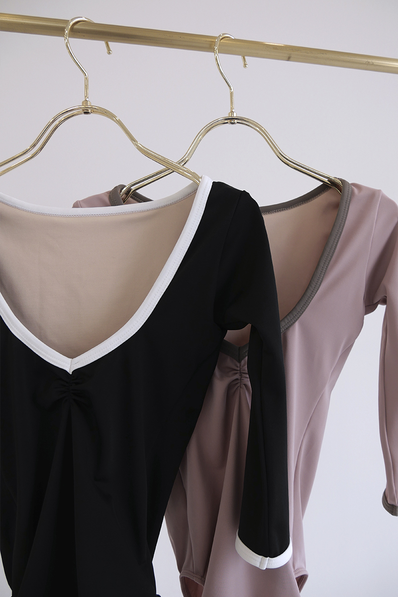 長袖シルエットとコントラスト配色のパイピングが、静けさの中に芯のある美しさを引き出します。