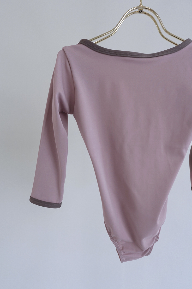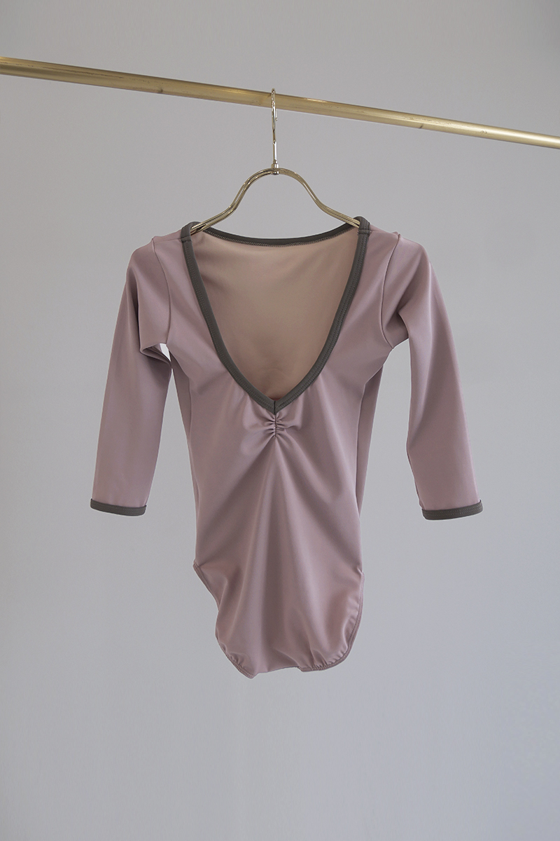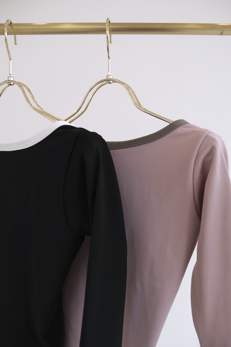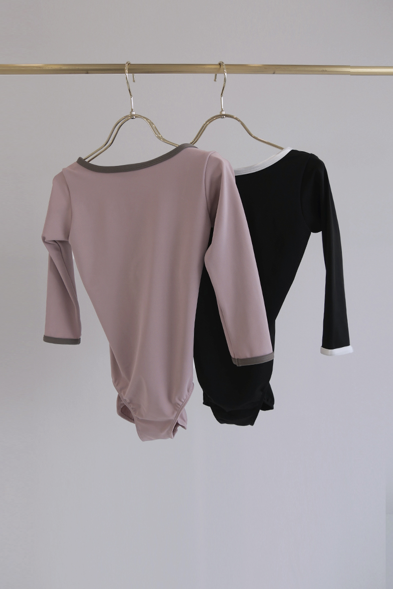 長袖シルエットとコントラスト配色のパイピングが、静けさの中に芯のある美しさを引き出します。