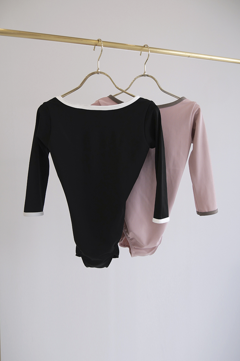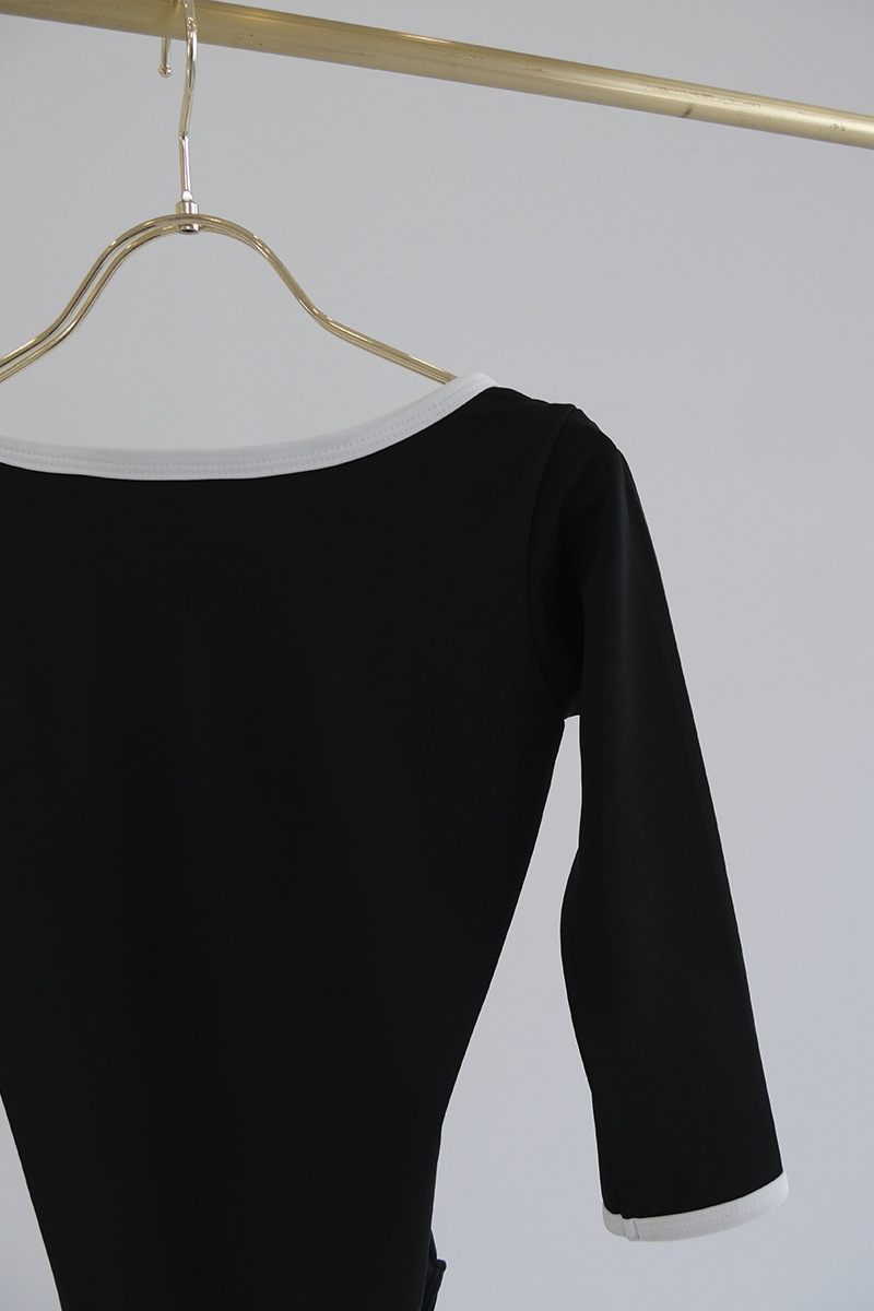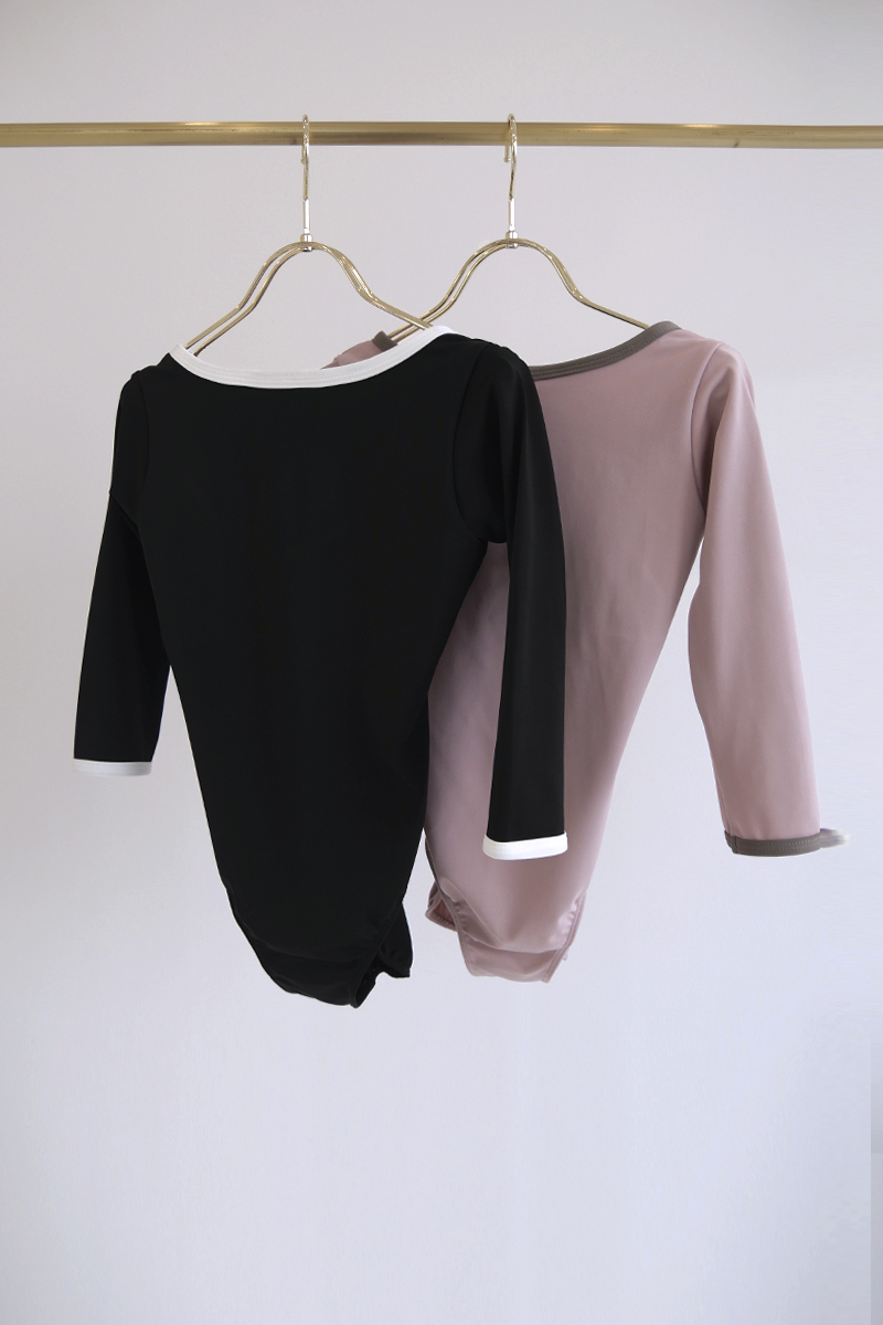 長袖シルエットとコントラスト配色のパイピングが、静けさの中に芯のある美しさを引き出します。