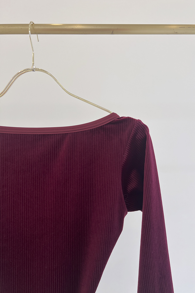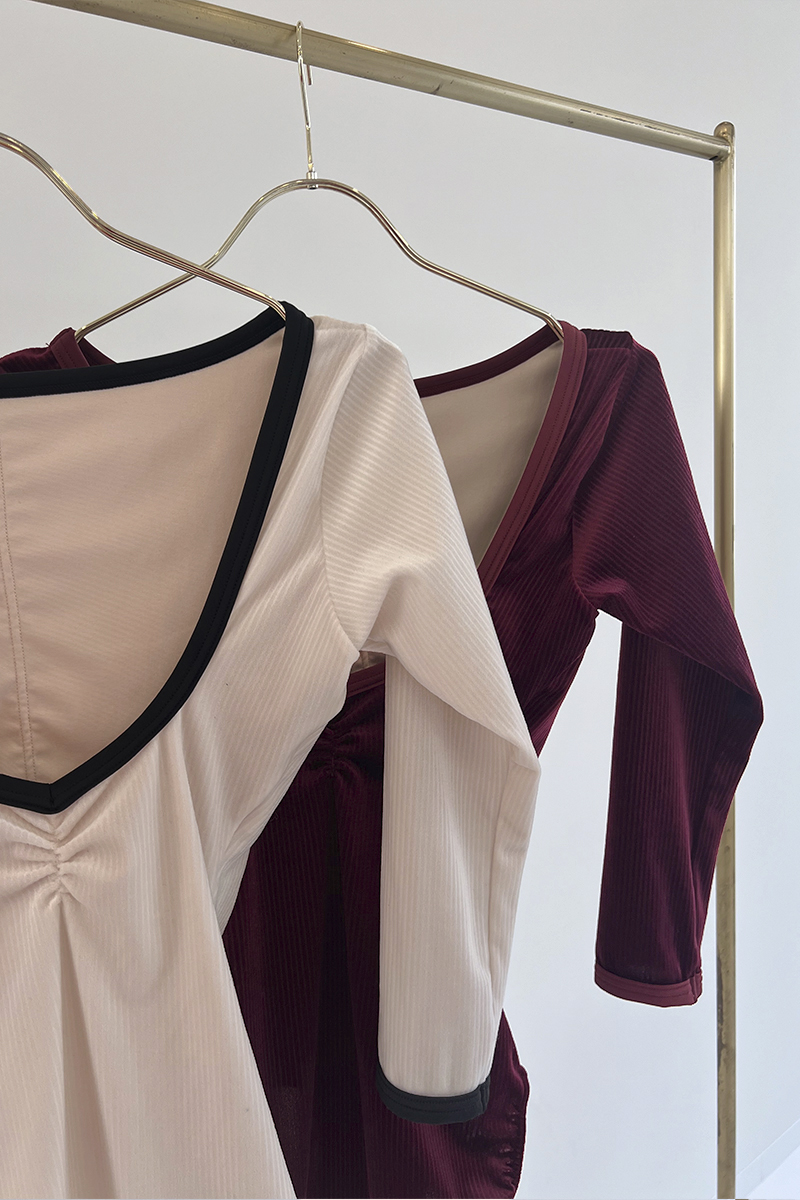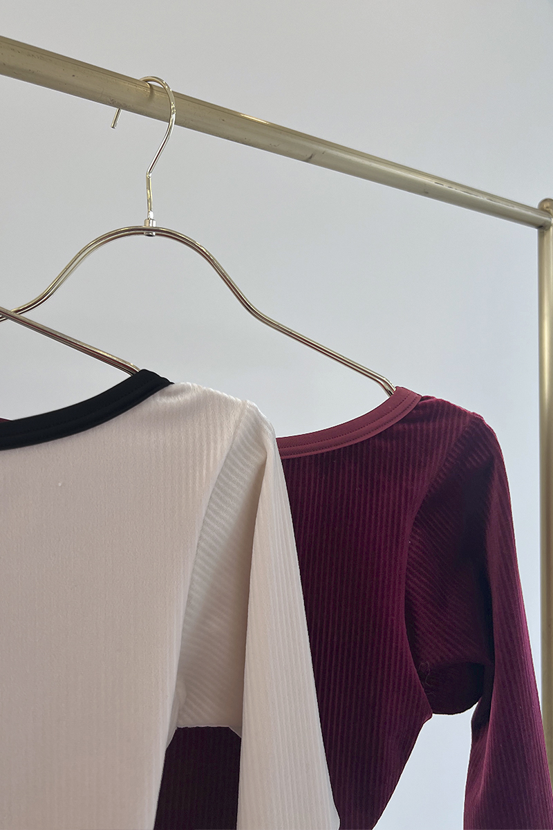 身体のラインにやわらかく寄り添うリブ素材が、