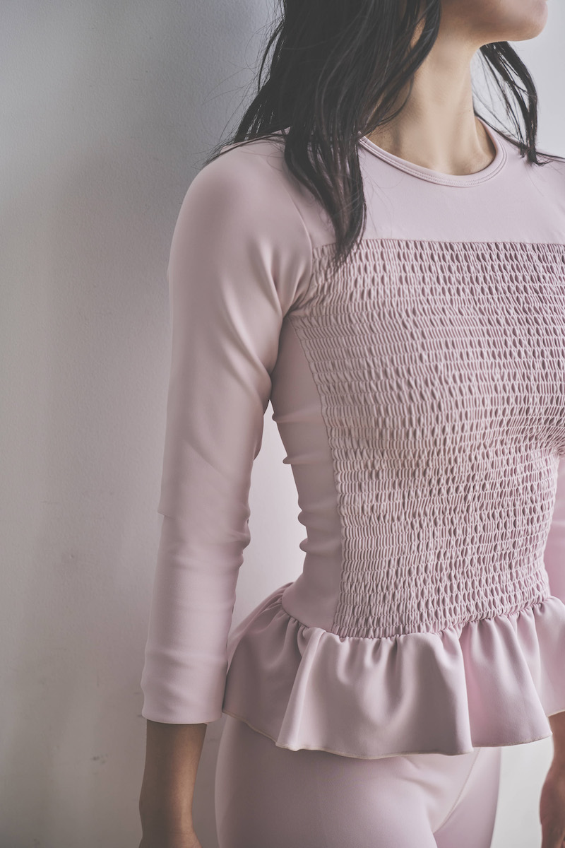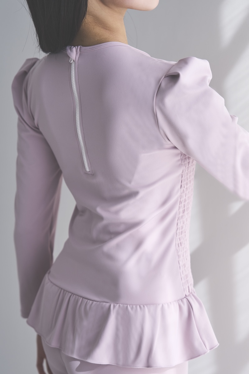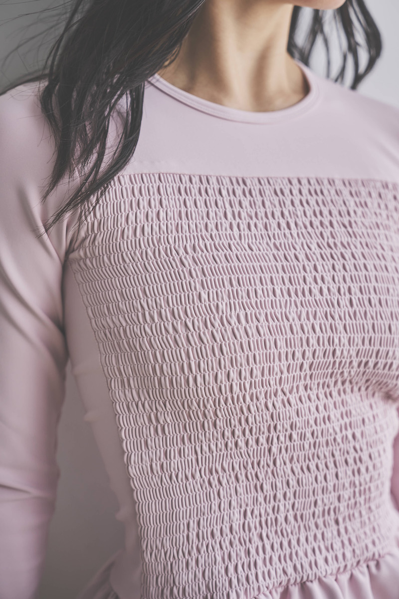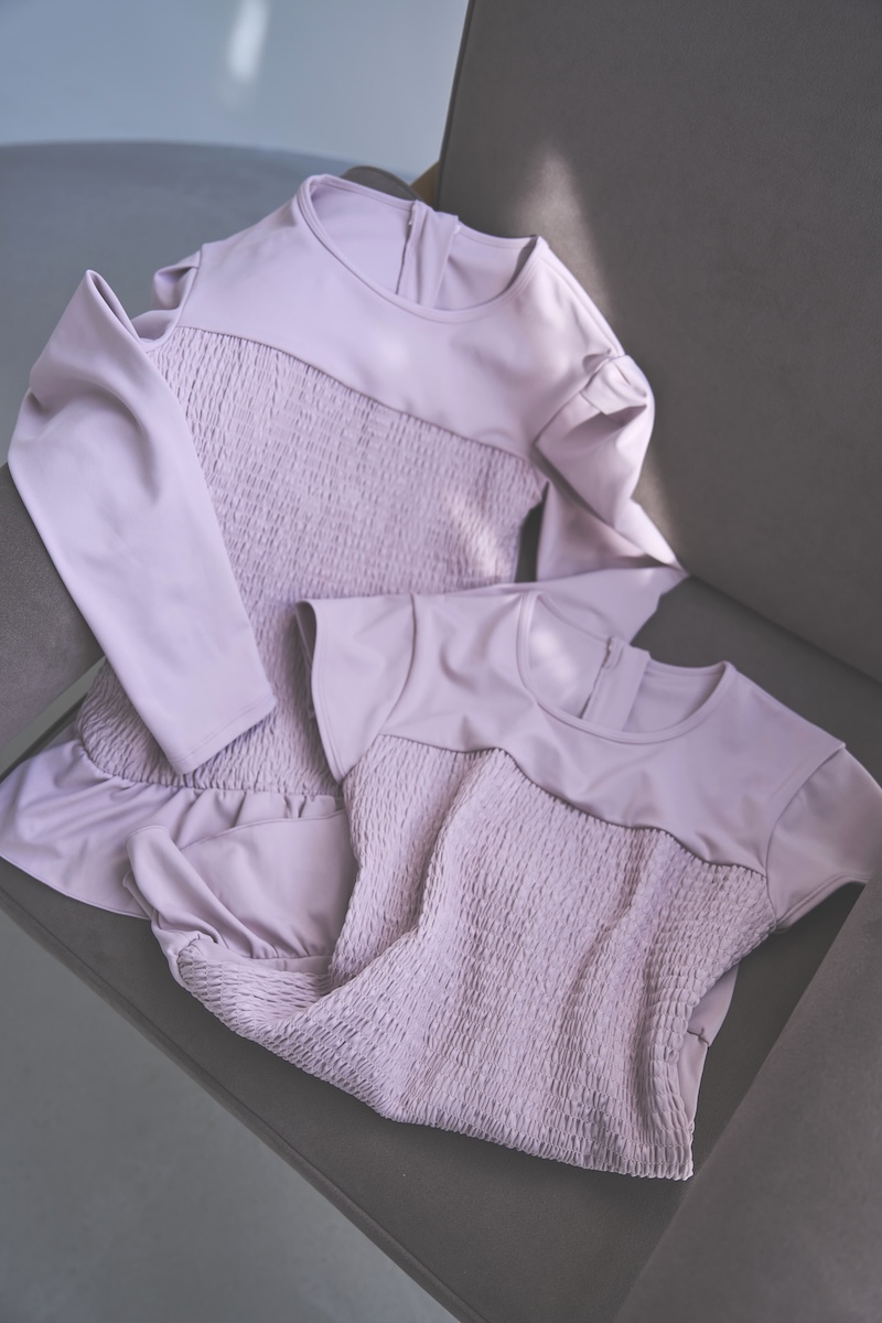 胸元に施した繊細なシャーリングが立体感を生み、肩に軽く入ったタックがふんわりとした丸みのあるシルエットを描きます。