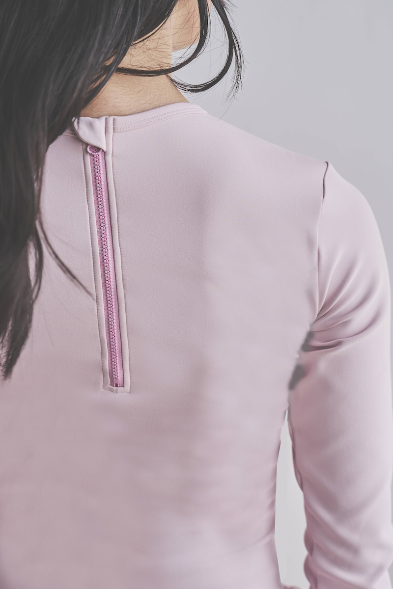 バックはジップアップ仕様で、後ろ姿まで上品に仕上げました。