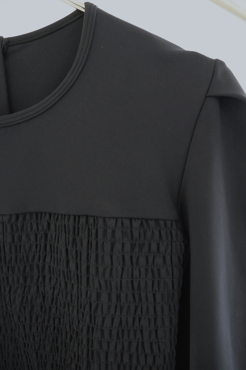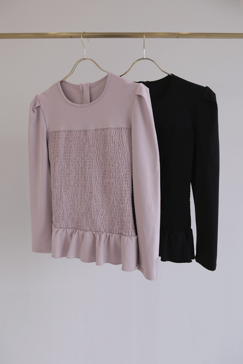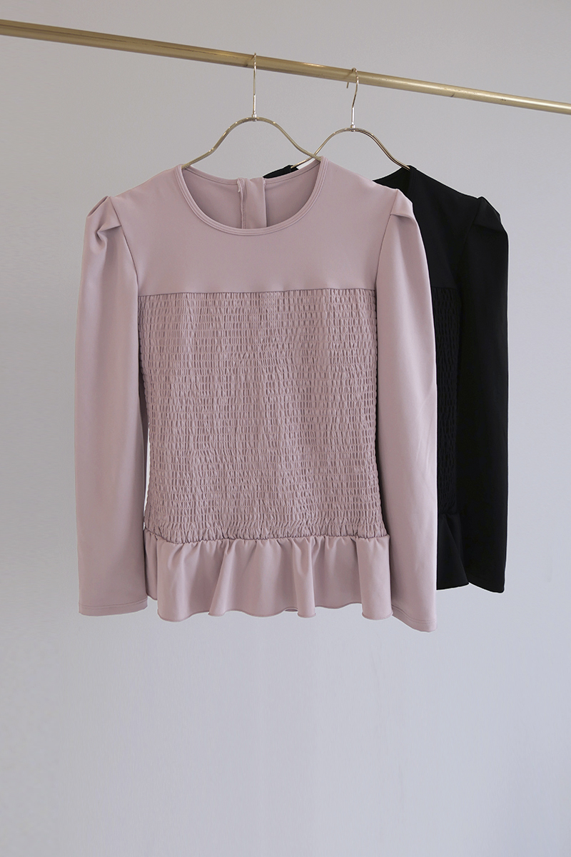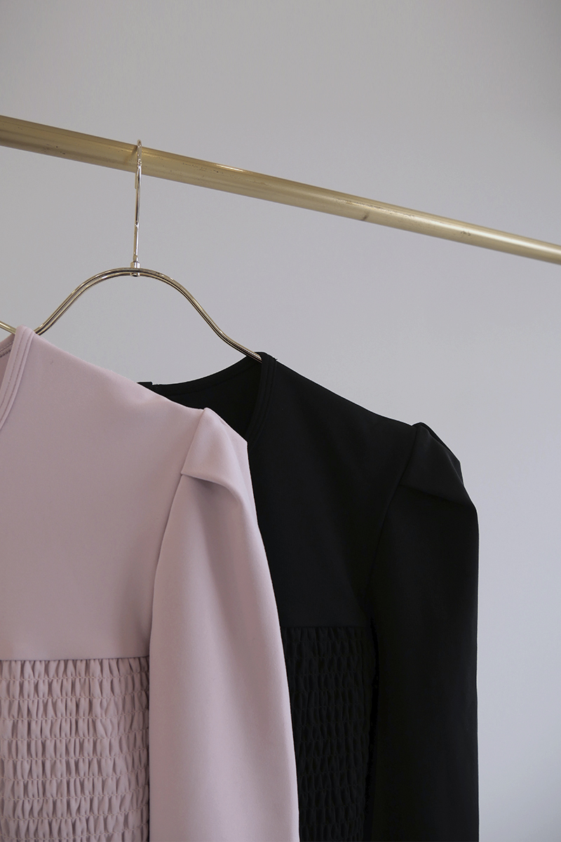 胸元に施した繊細なシャーリングが立体感を生み、肩に軽く入ったタックがふんわりとした丸みのあるシルエットを描きます。
