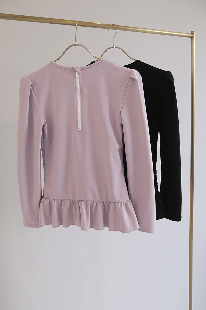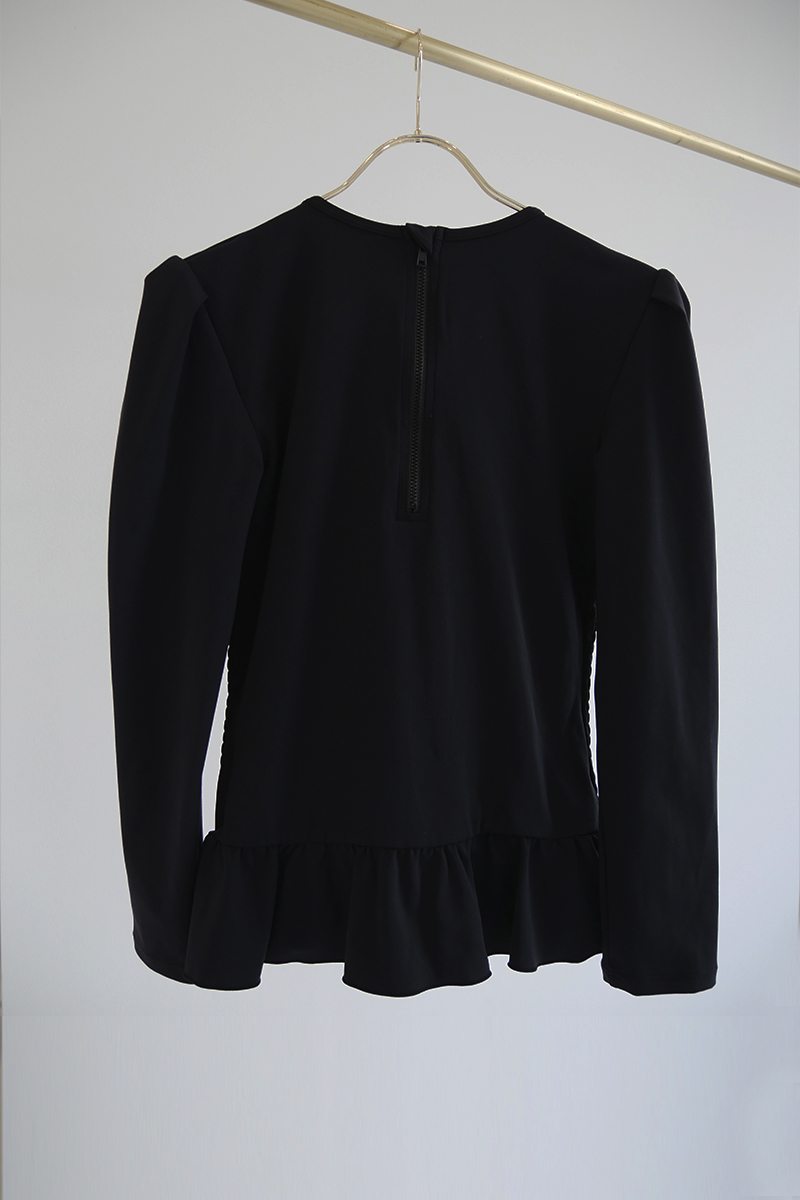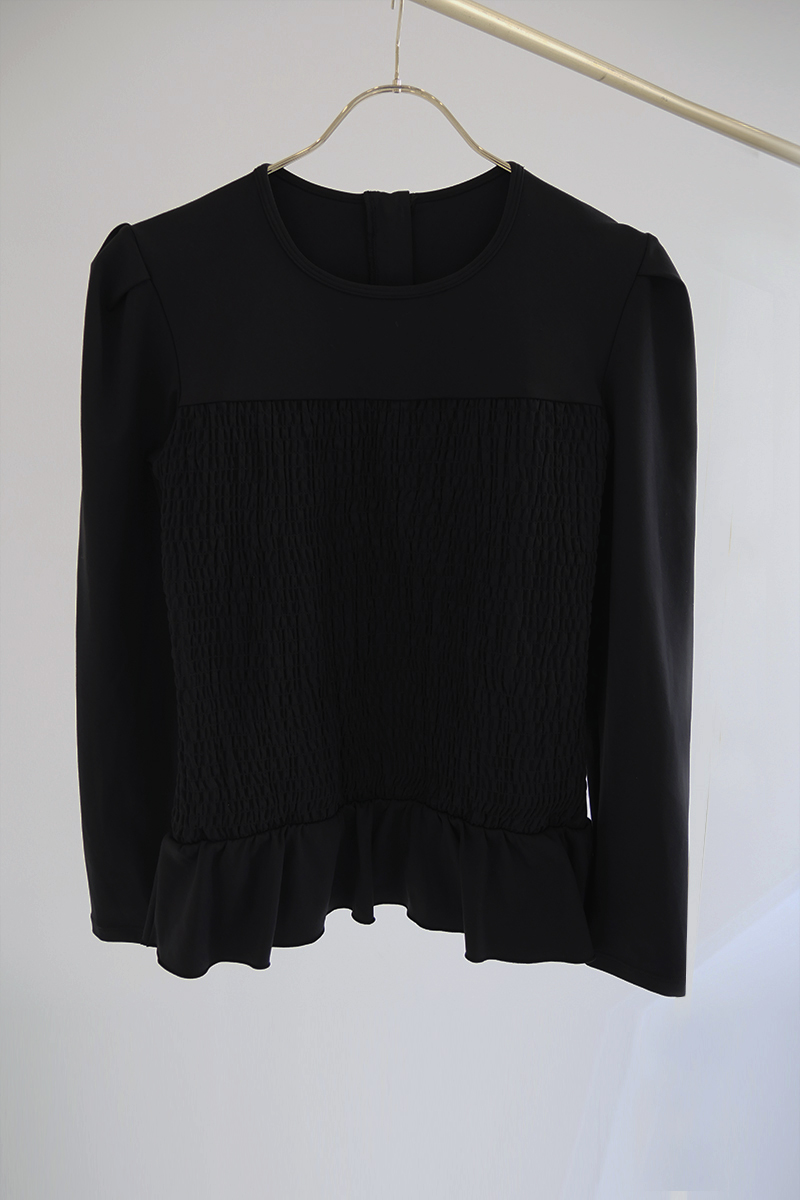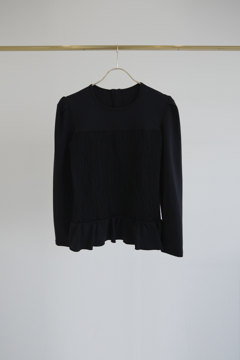 胸元に施した繊細なシャーリングが立体感を生み、肩に軽く入ったタックがふんわりとした丸みのあるシルエットを描きます。