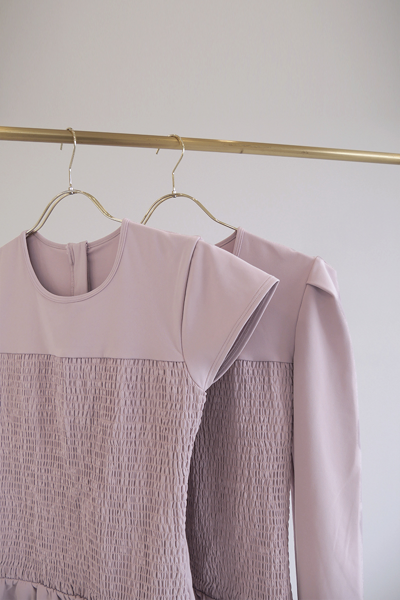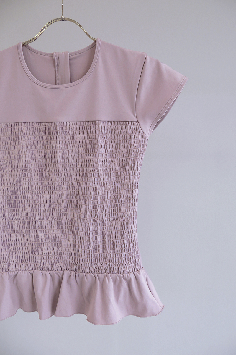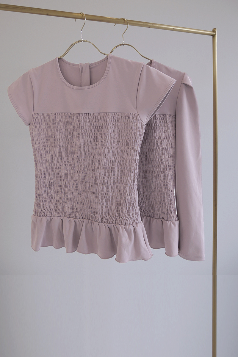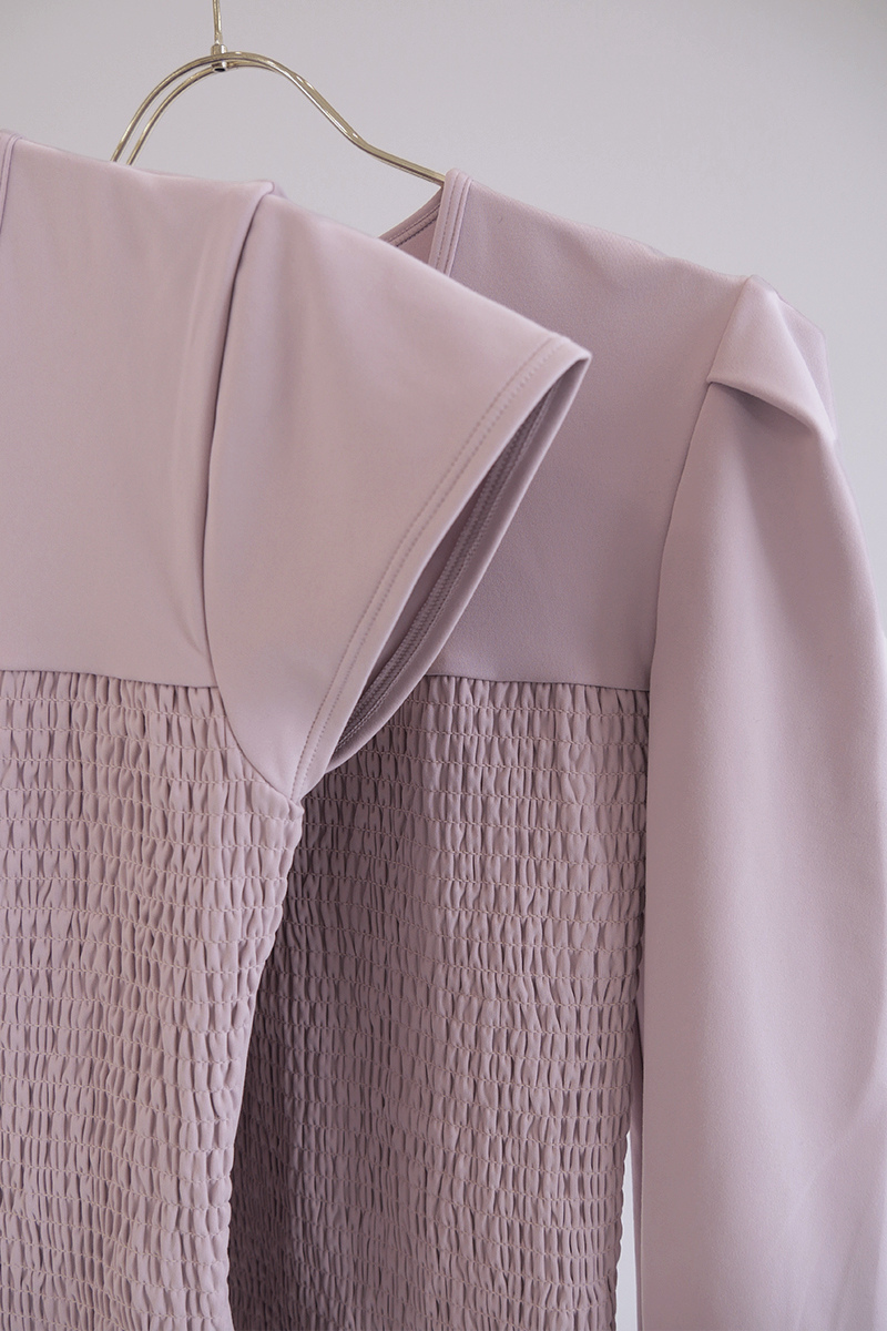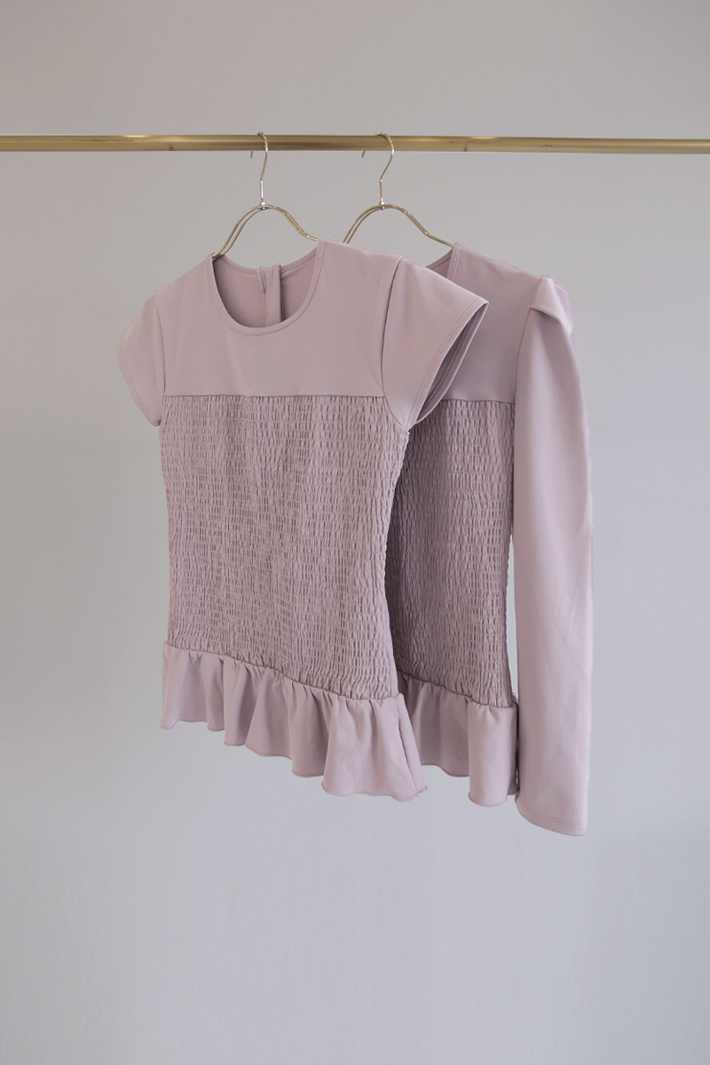 胸元にたっぷりと寄せたギャザーが立体感を生み、身体の動きに合わせて優しく伸びる軽やかな素材が美しいラインを描きます。