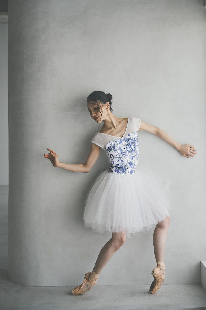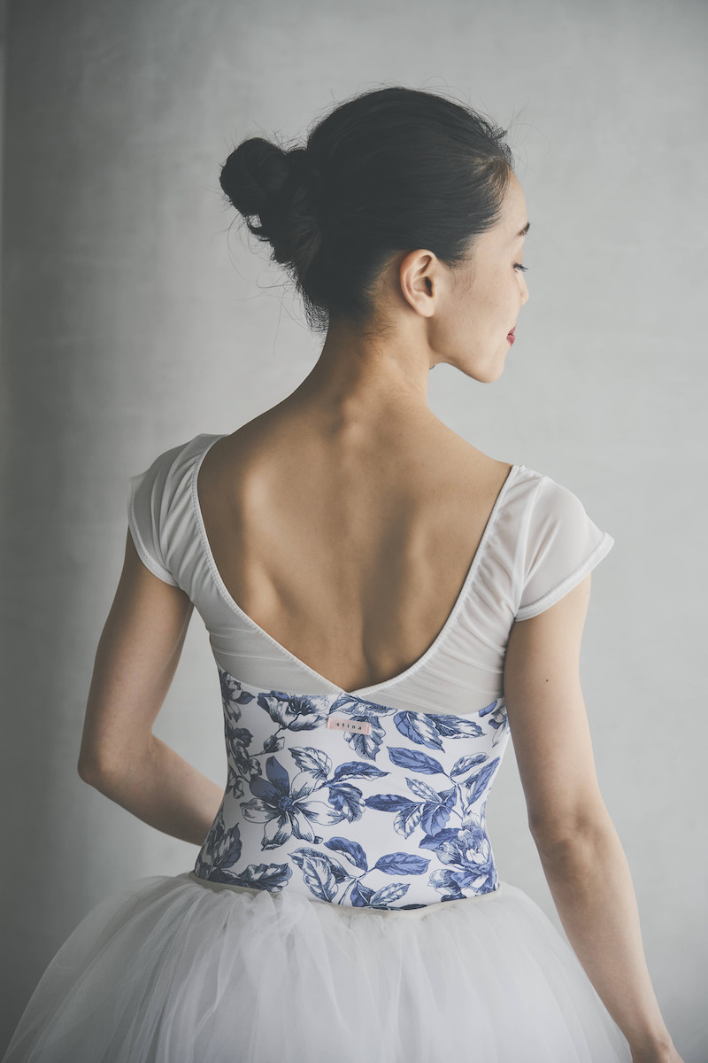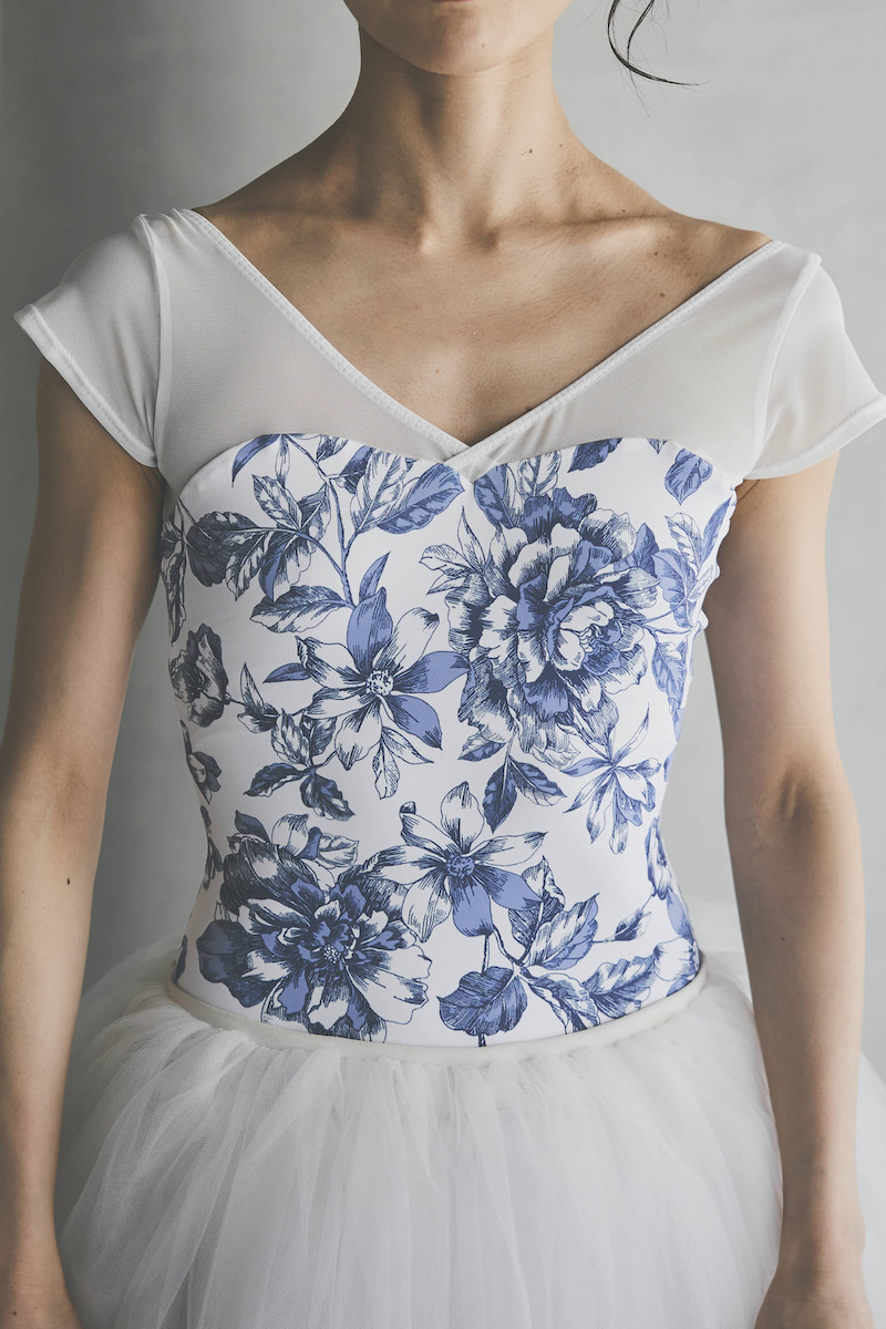 清潔感のあるブルーが、甘さを抑えた大人の可愛らしさを引き立て、ホワイト地とのコントラストが身体の動きに合わせて柄を美しく際立たせます。