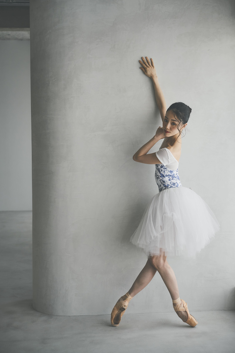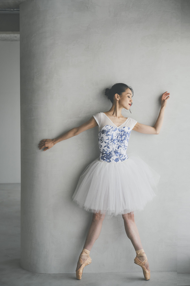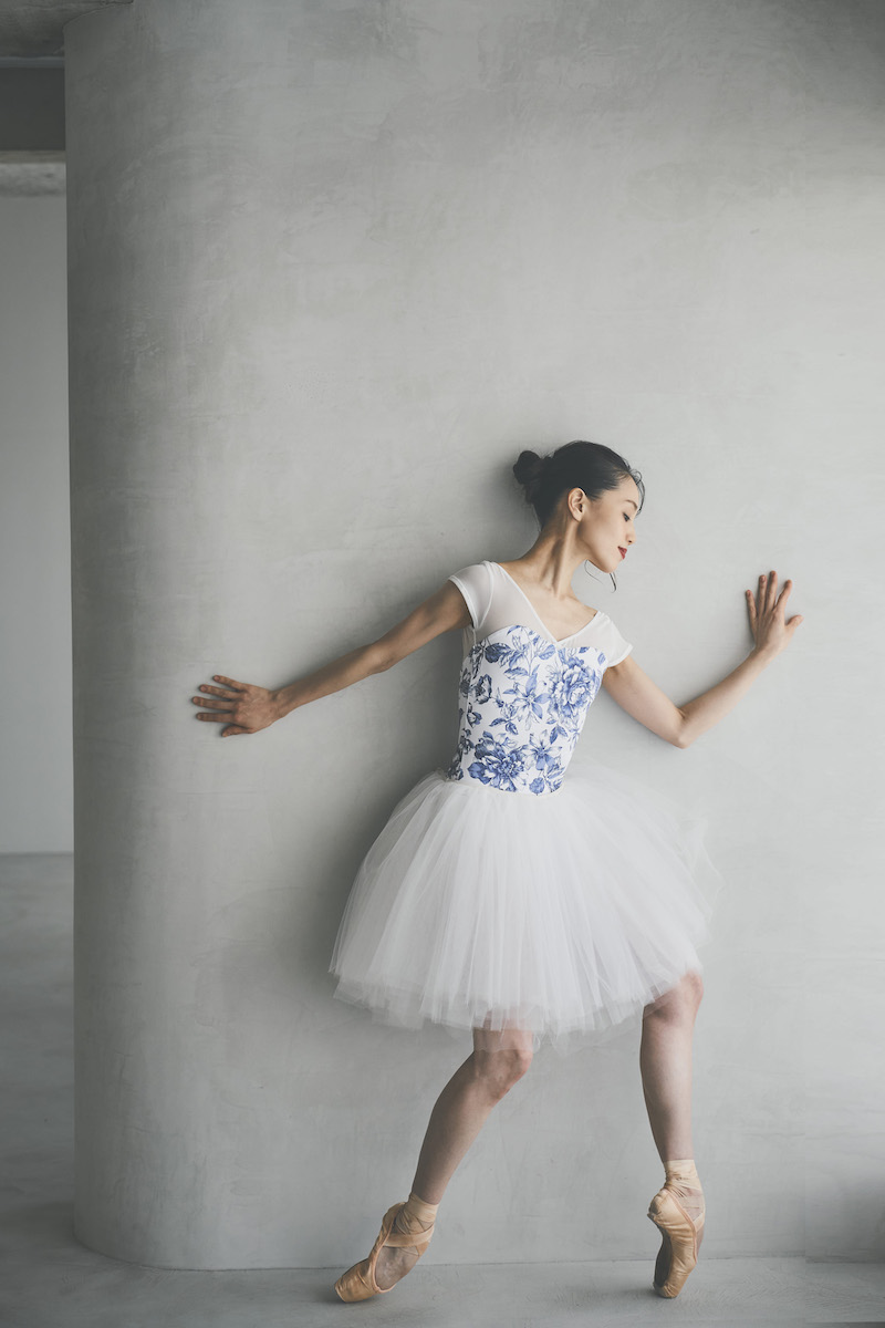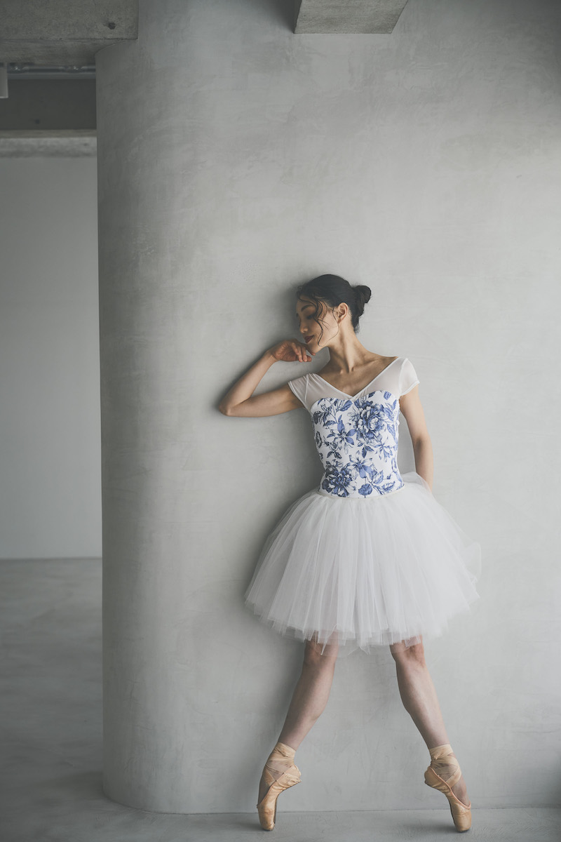 清潔感のあるブルーが、甘さを抑えた大人の可愛らしさを引き立て、ホワイト地とのコントラストが身体の動きに合わせて柄を美しく際立たせます。