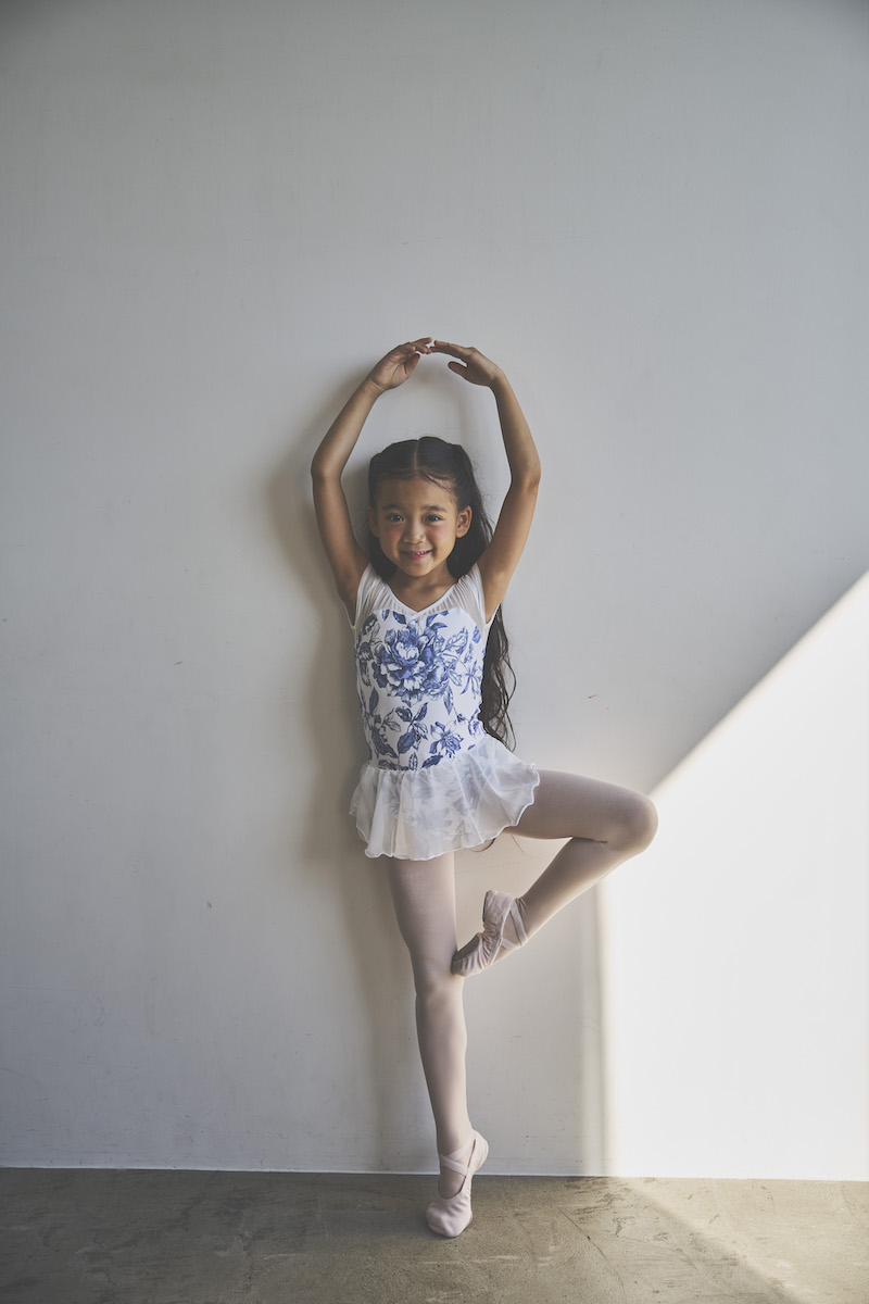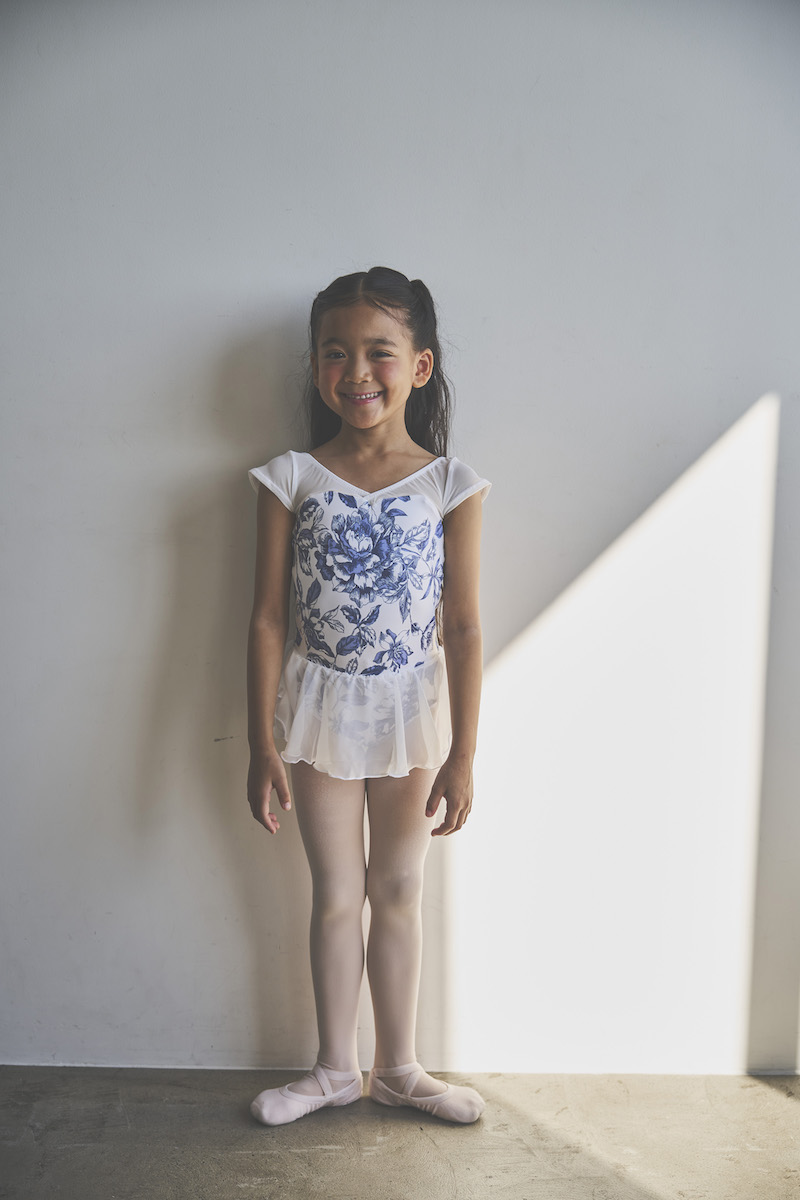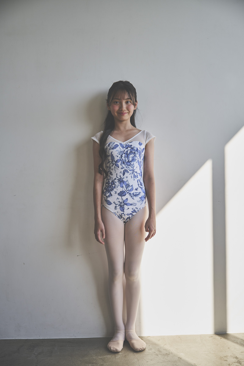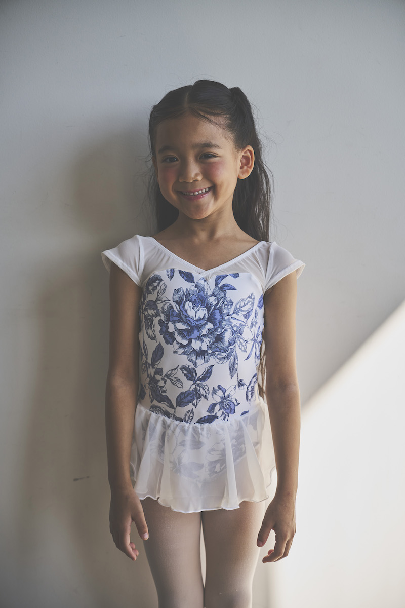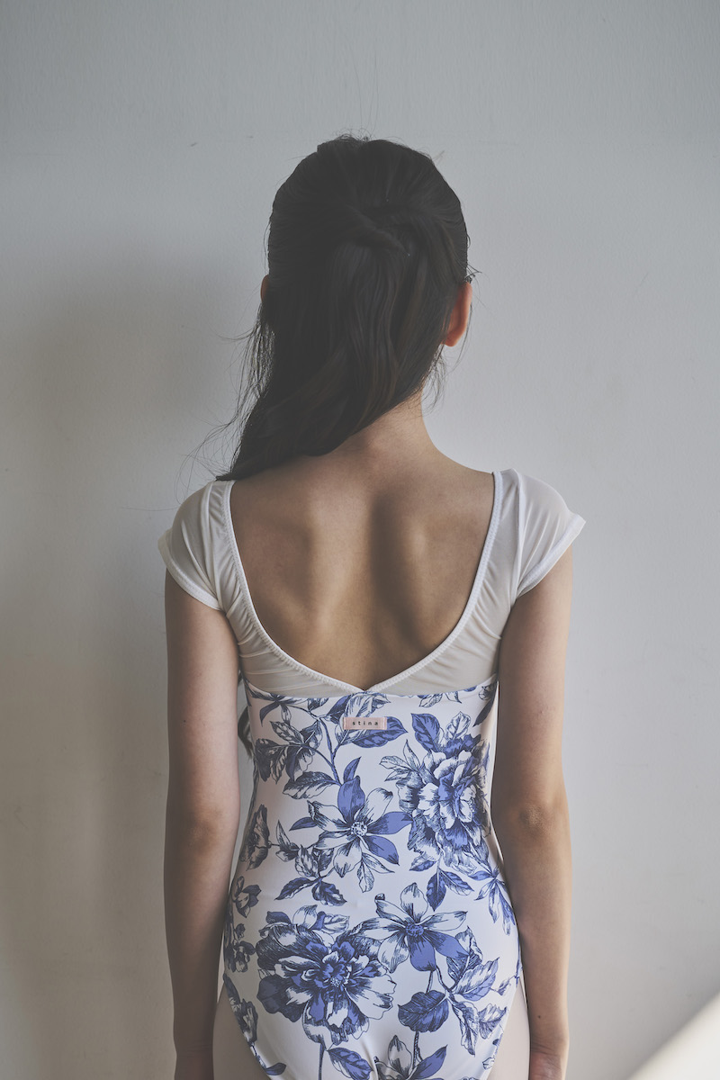 清潔感のあるブルーが、甘さを抑えた大人の可愛らしさを引き立て、ホワイト地とのコントラストが身体の動きに合わせて柄を美しく際立たせます。