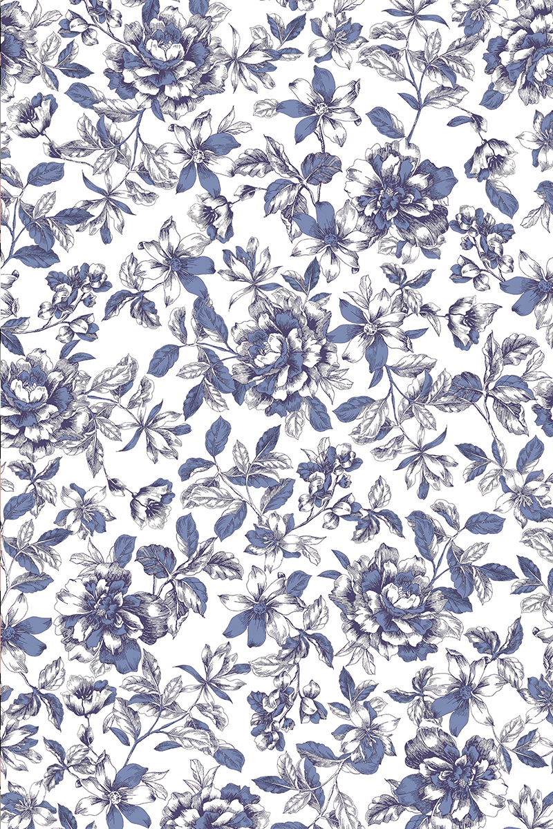 ホワイトのベースに、ブルーの濃淡で丁寧に描き込まれたお花が咲き広がるファブリック。