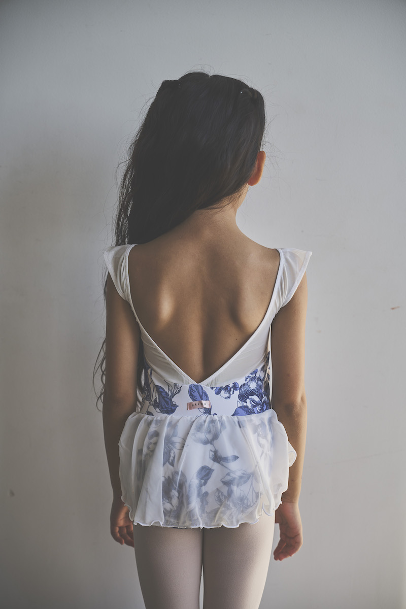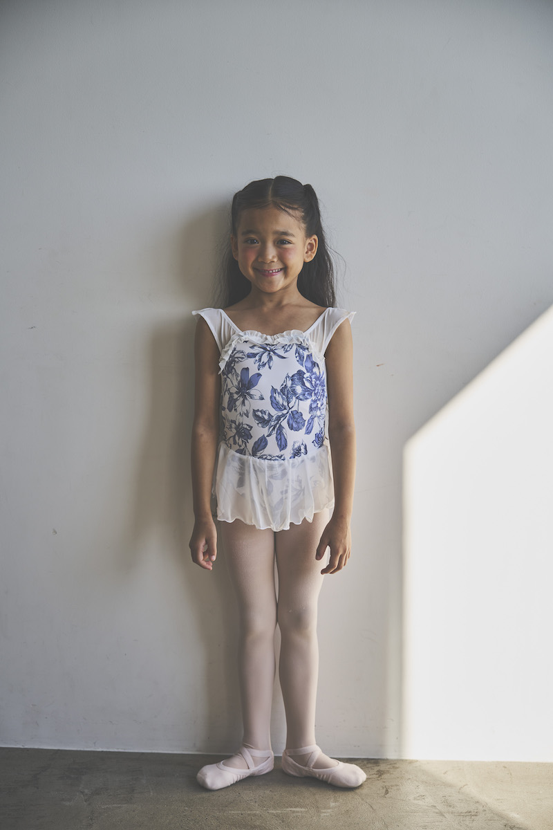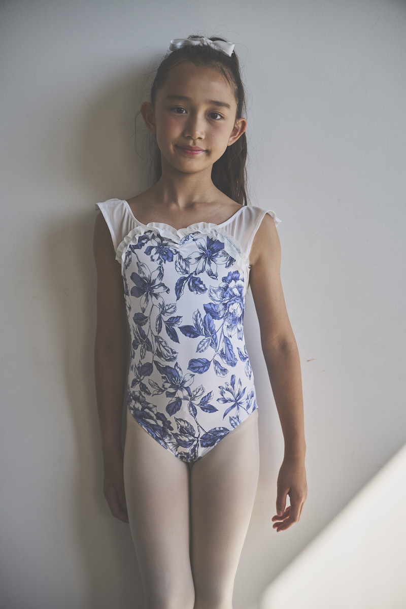 清潔感のあるブルーが、甘さを抑えた大人の可愛らしさを引き立て、ホワイト地とのコントラストが身体の動きに合わせて柄を美しく際立たせます。