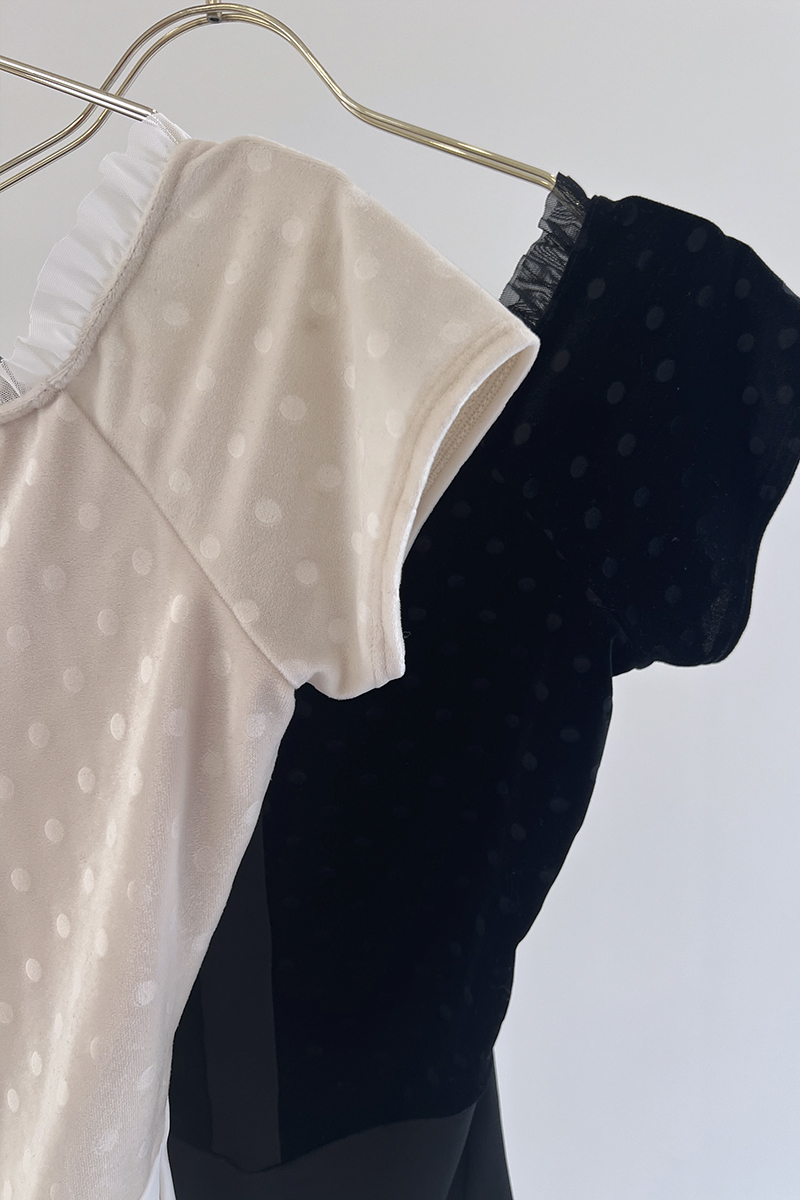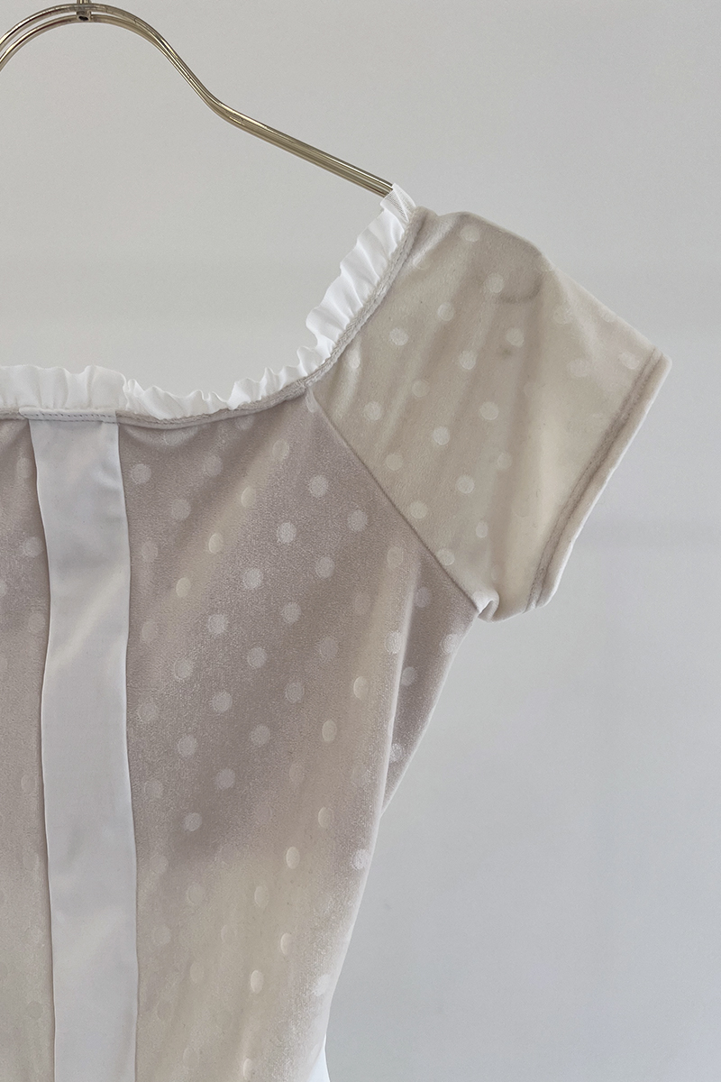 可愛らしさを演出するパフスリーブとデコルテラインの細やかなギャザー、