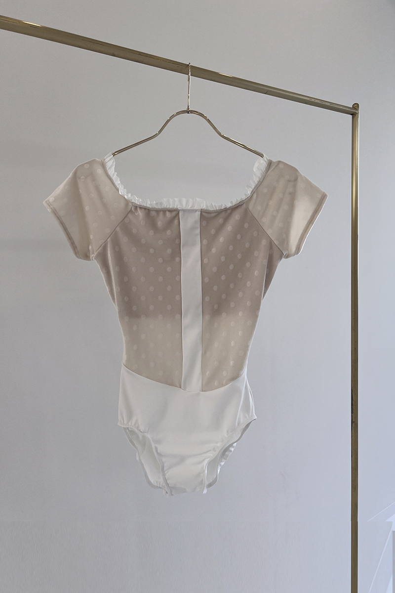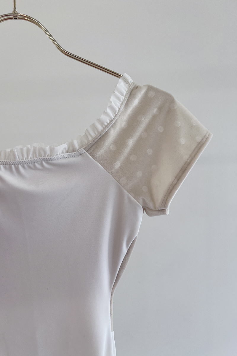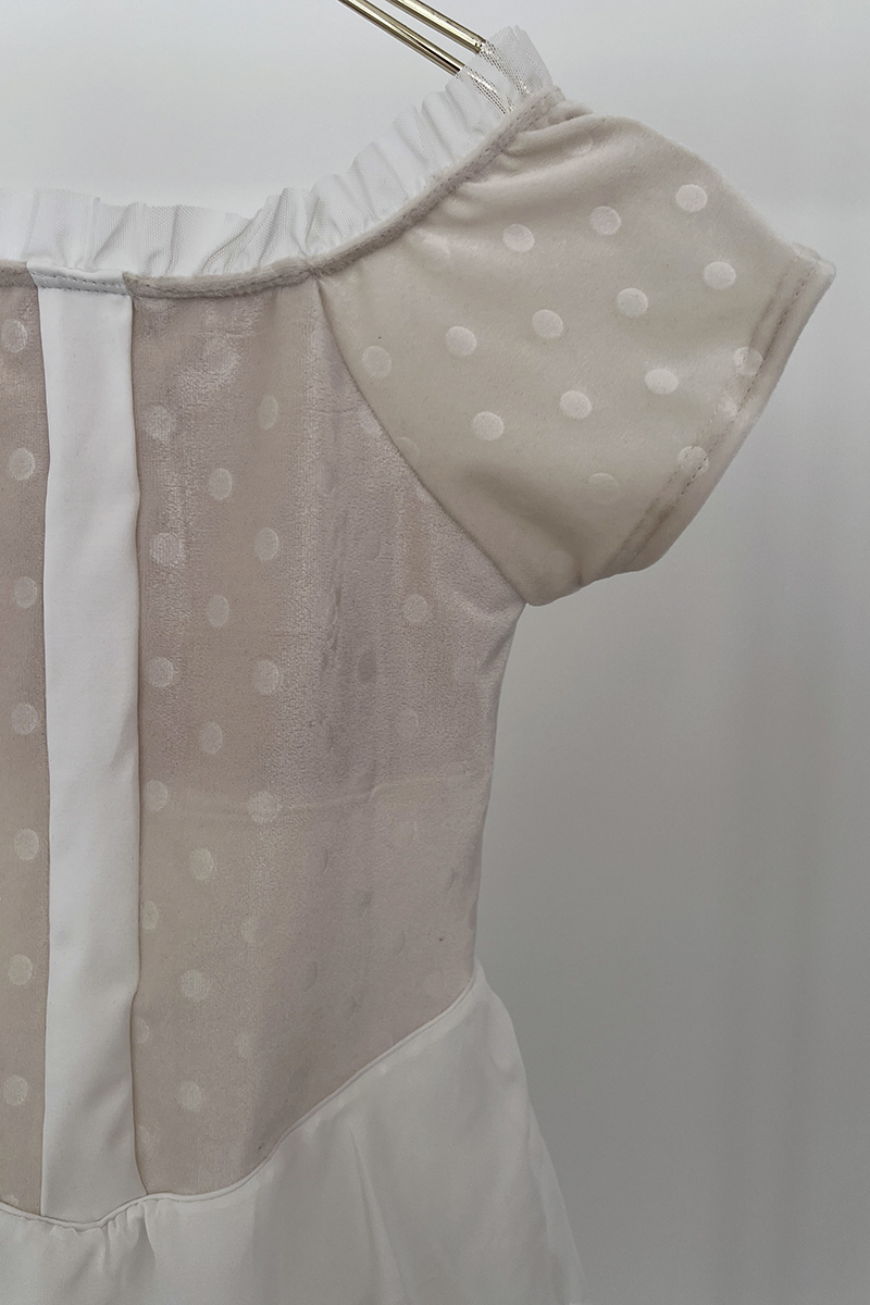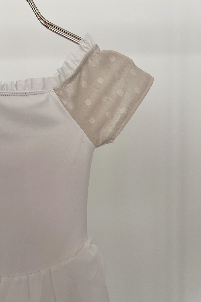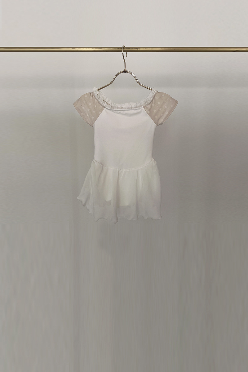 可愛らしさを演出するパフスリーブとデコルテラインの細やかなギャザー、
