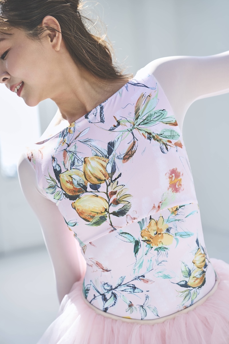 柔らかなピンクをベースに、軽やかに描かれたレモンとフラワーモチーフが広がるファブリック。