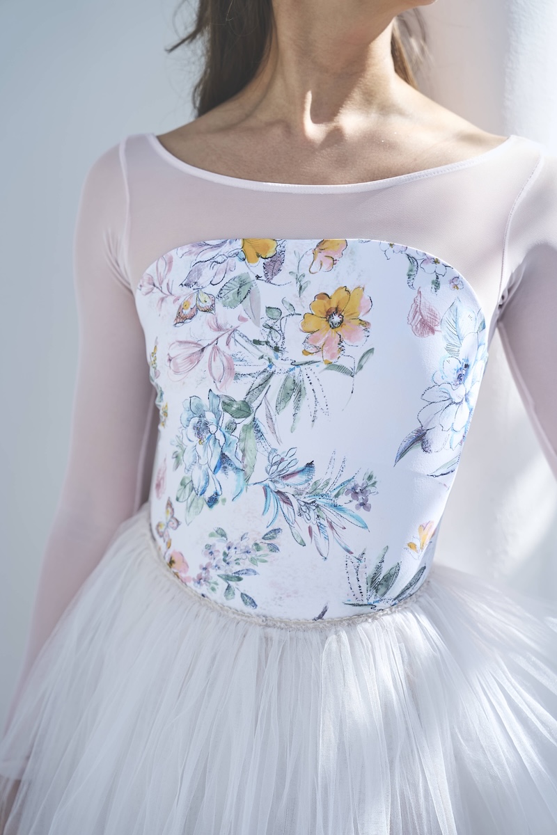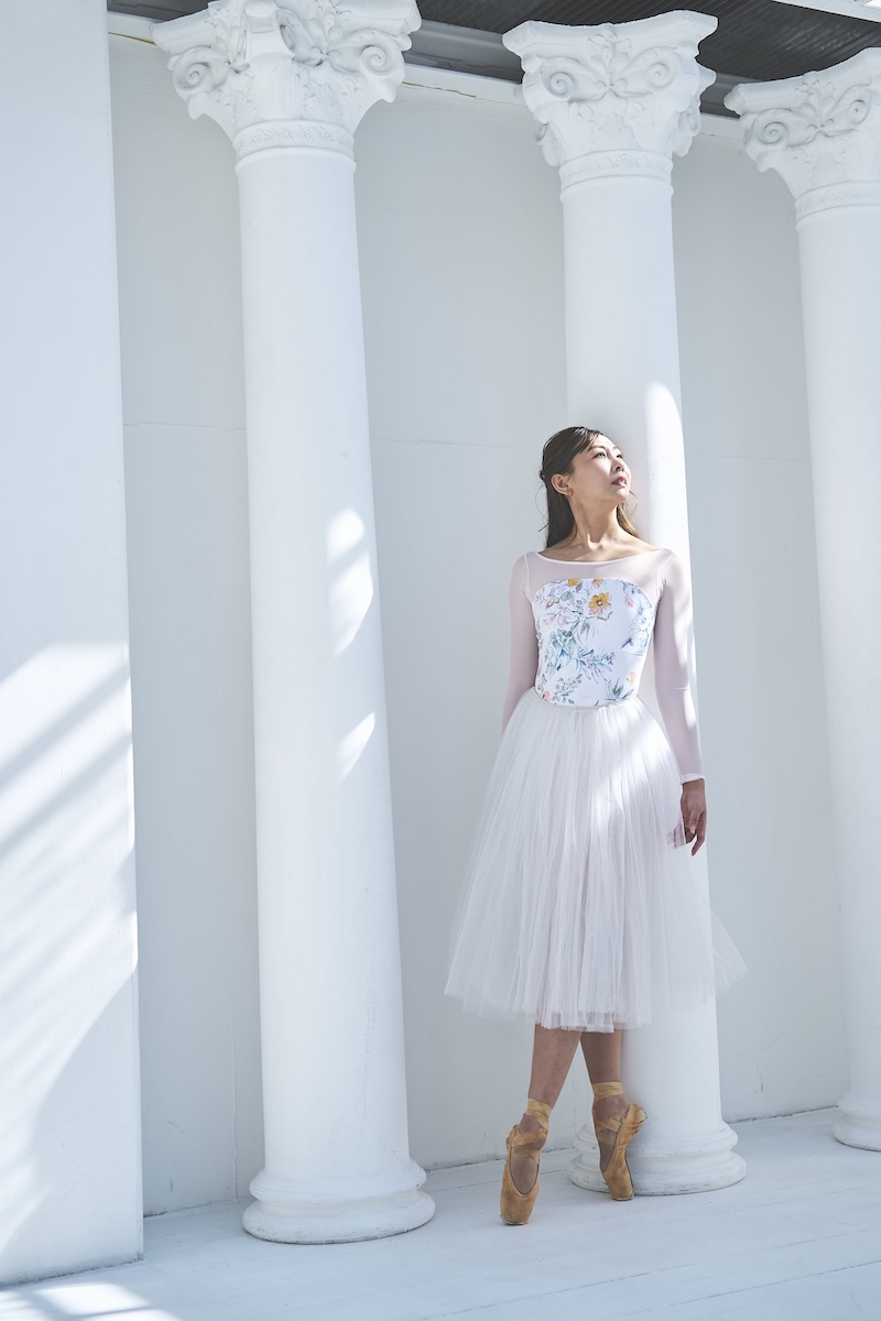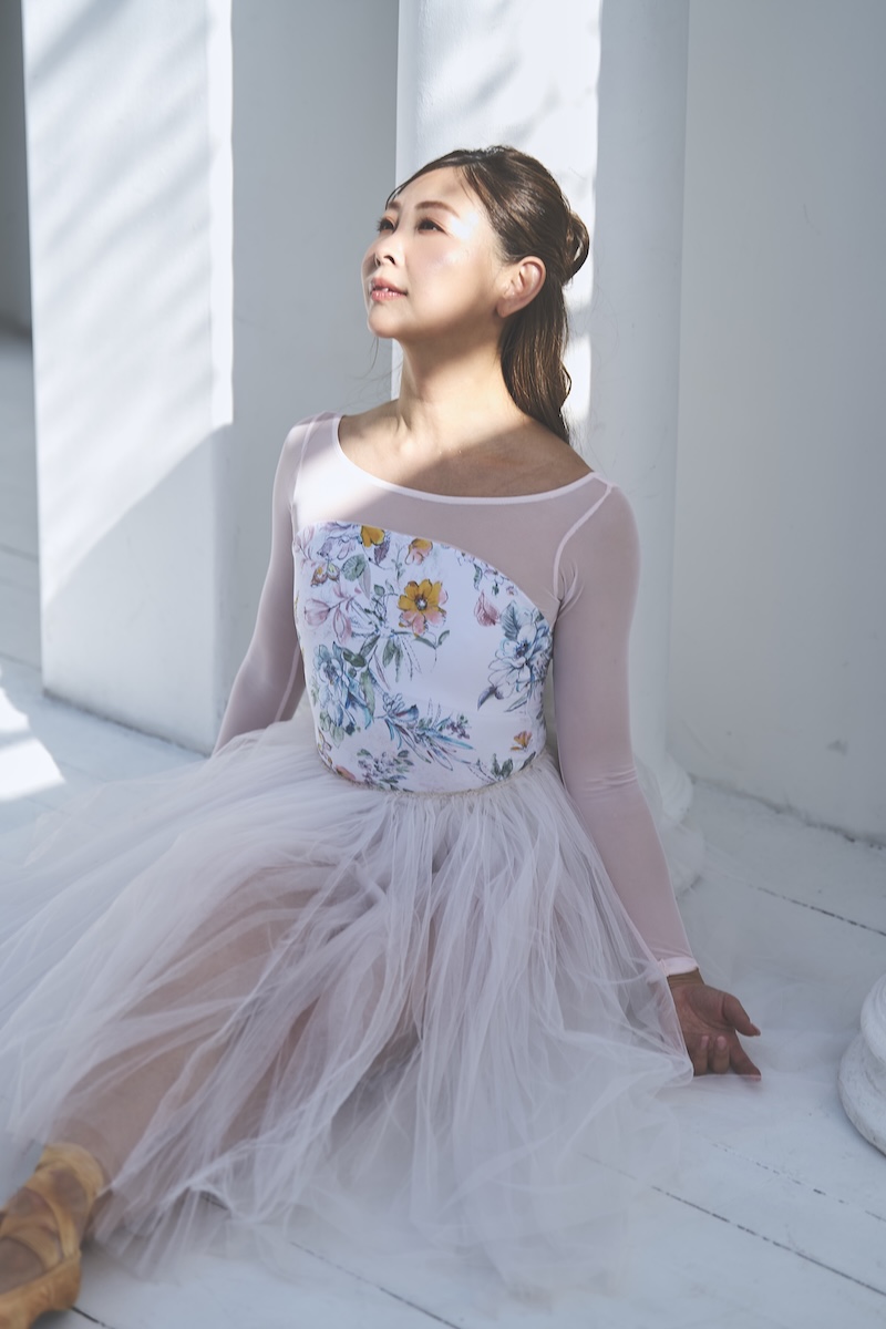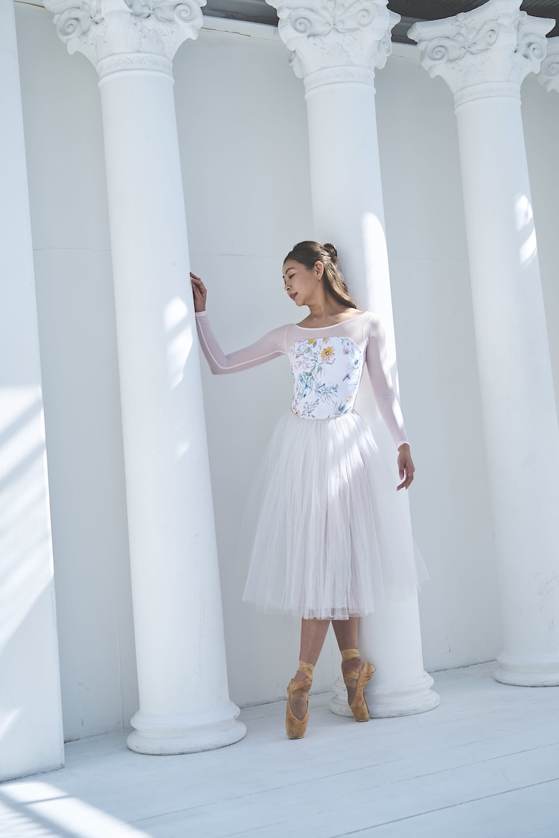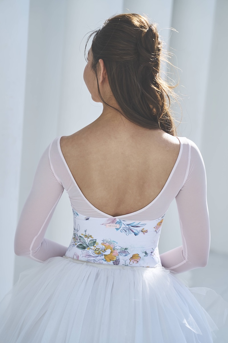 light pinkのパワーネットが柔らかく肌になじみボディラインを優しく見せ、華やかな印象に。
