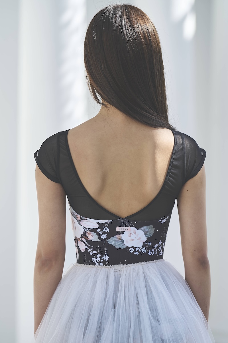 blackのパワーネットが肩まわりをすっきりと引き締め、上品さの中に“モードな表情”を添えています。