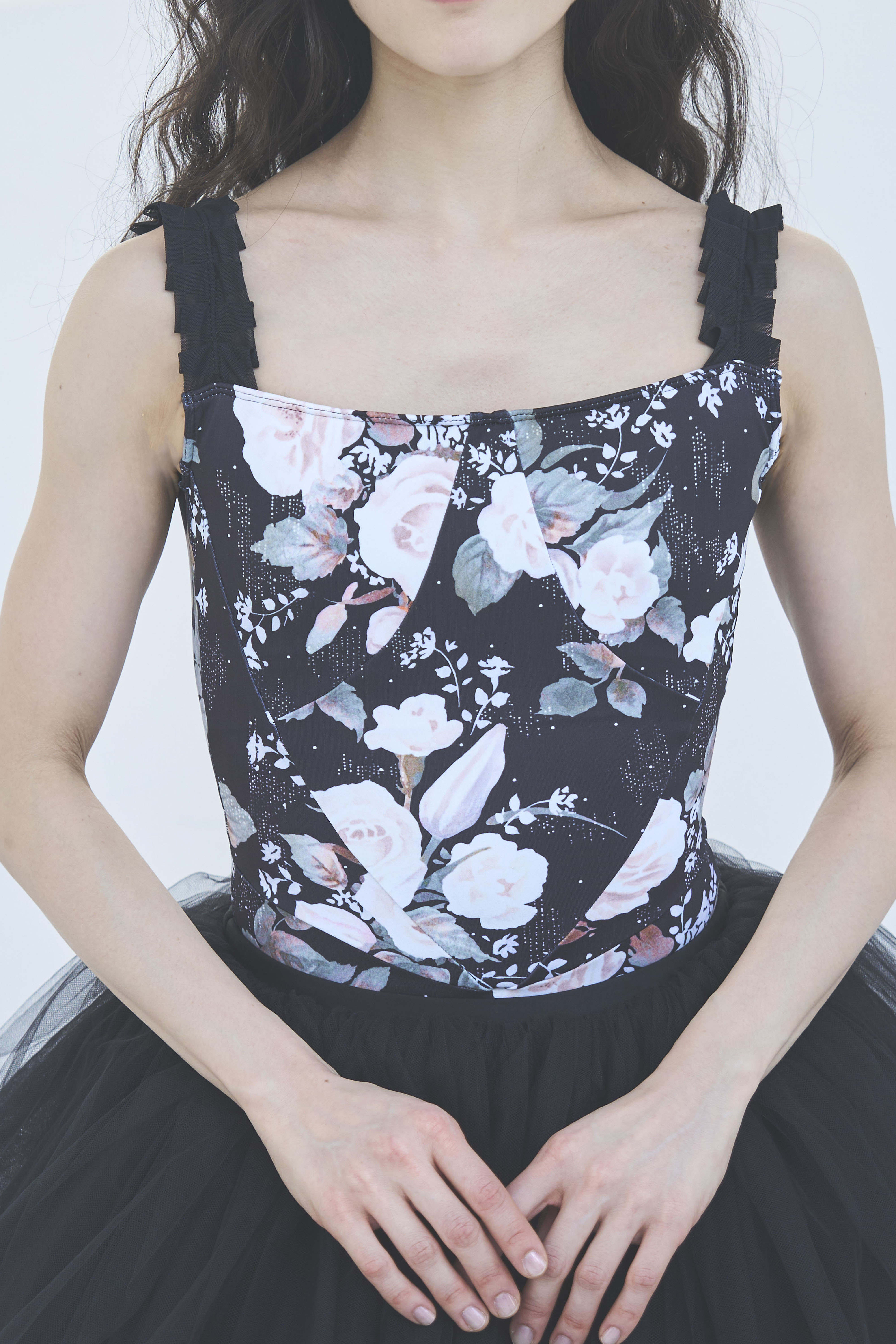 胸元の立体切り替えがフィット感を高め、上半身を美しくホールド。