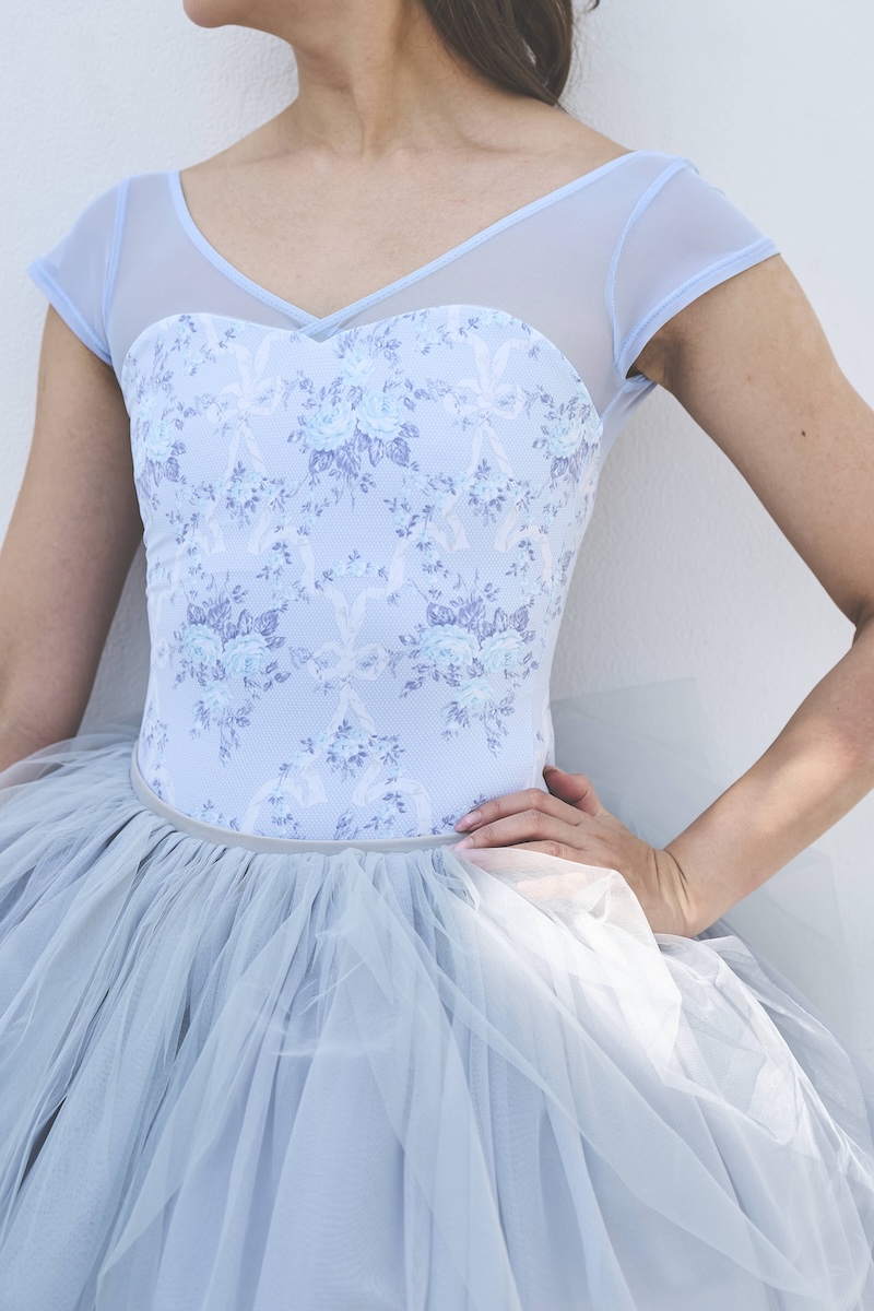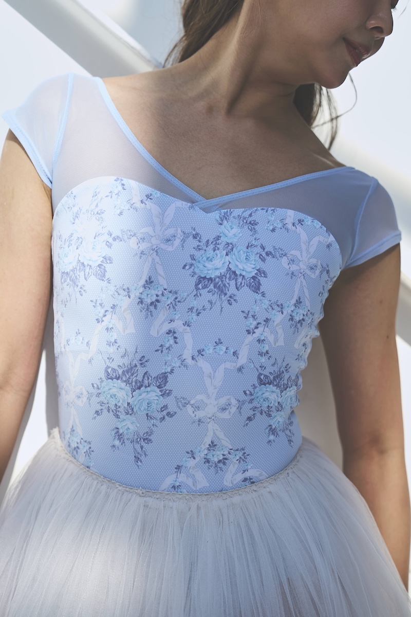 楽園の空の色をイメージした澄んだサックスブルーをベースに、繊細なローズとリボンモチーフを描いた爽やかなカラーリング。