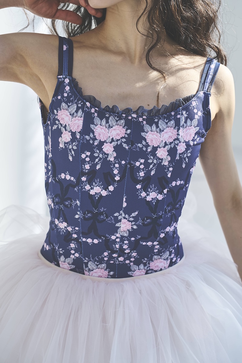 深みのあるネイビーをベースに、ピンクのローズが華やかに映える印象的なファブリック。
