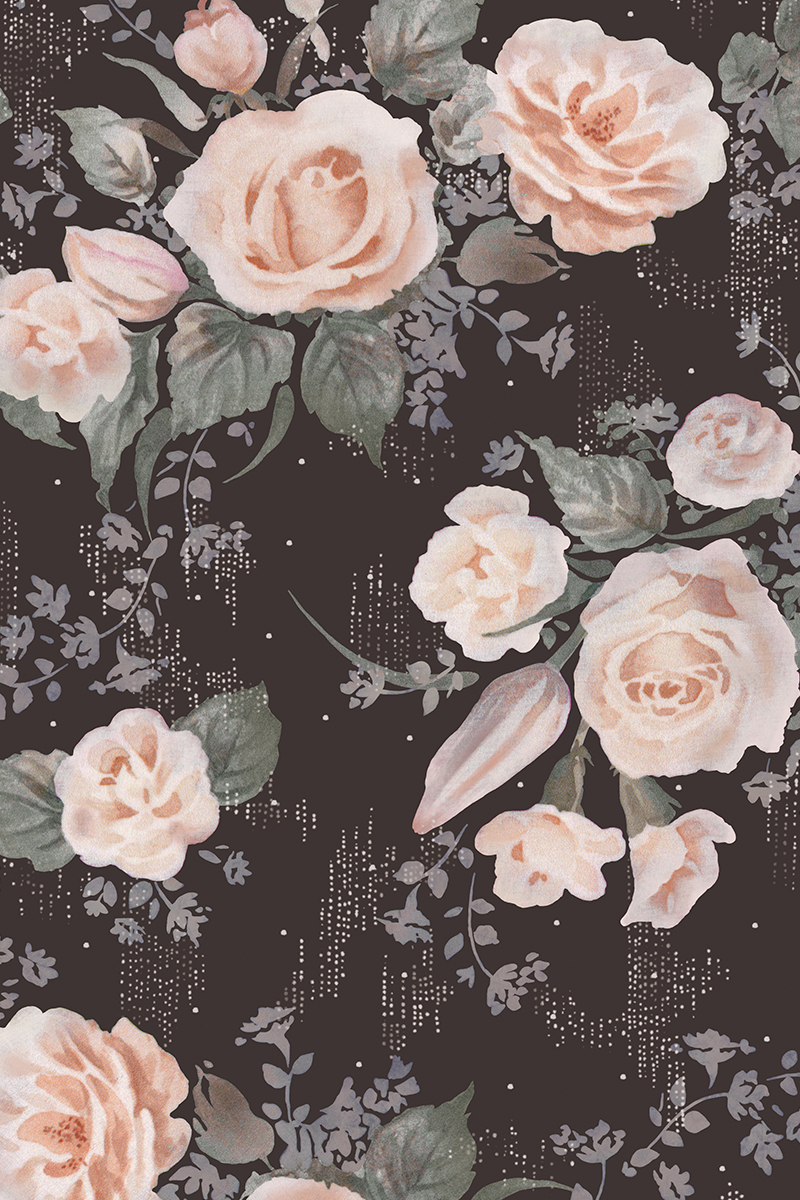 落ち着きのあるミントグリーンをベースに、柔らかなローズモチーフを配したファブリック。