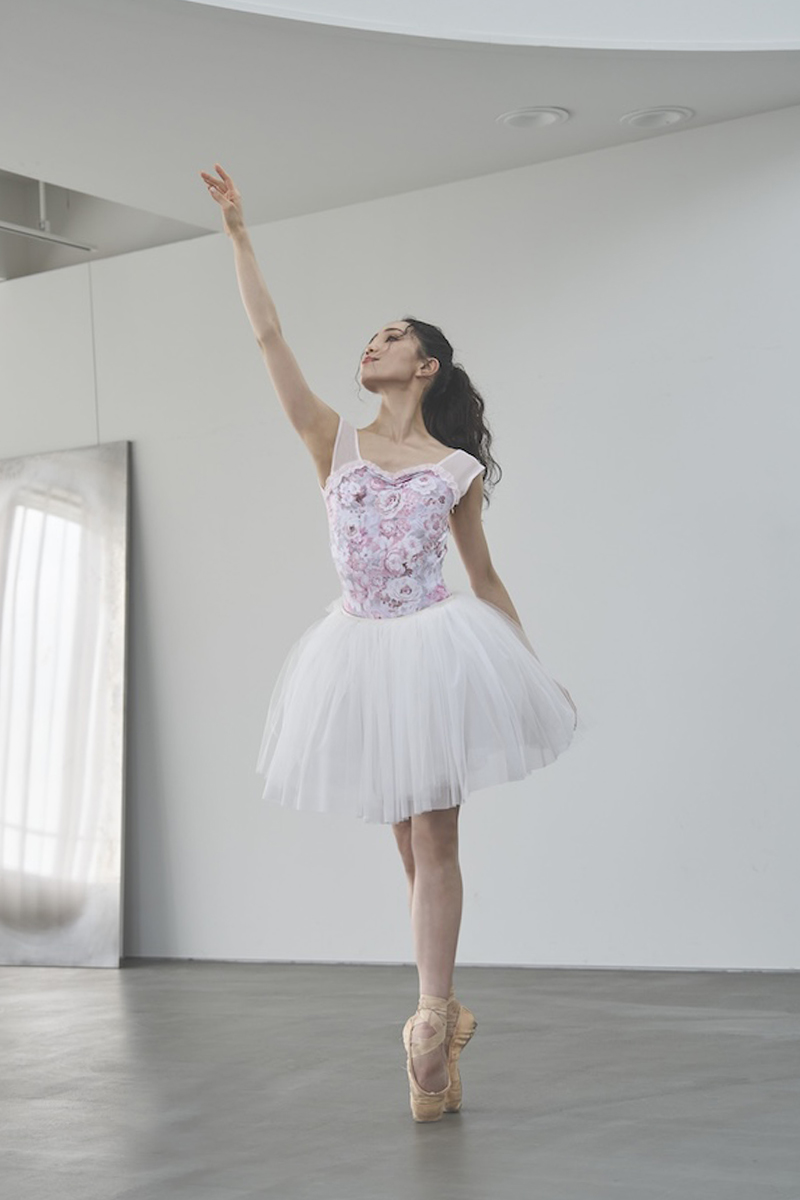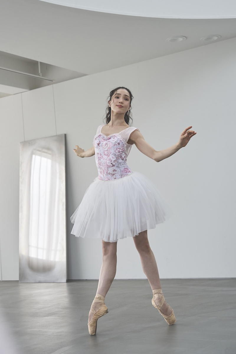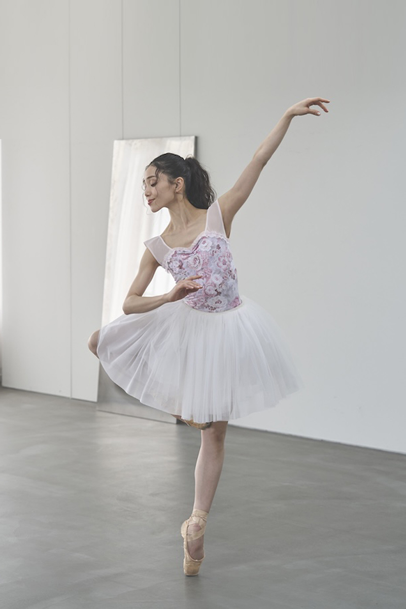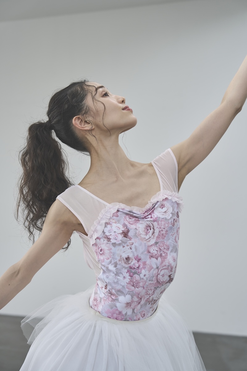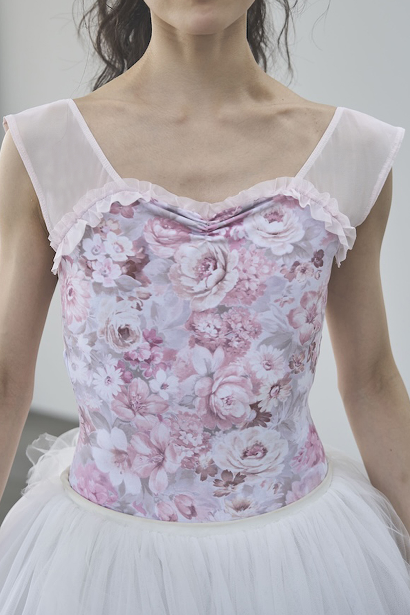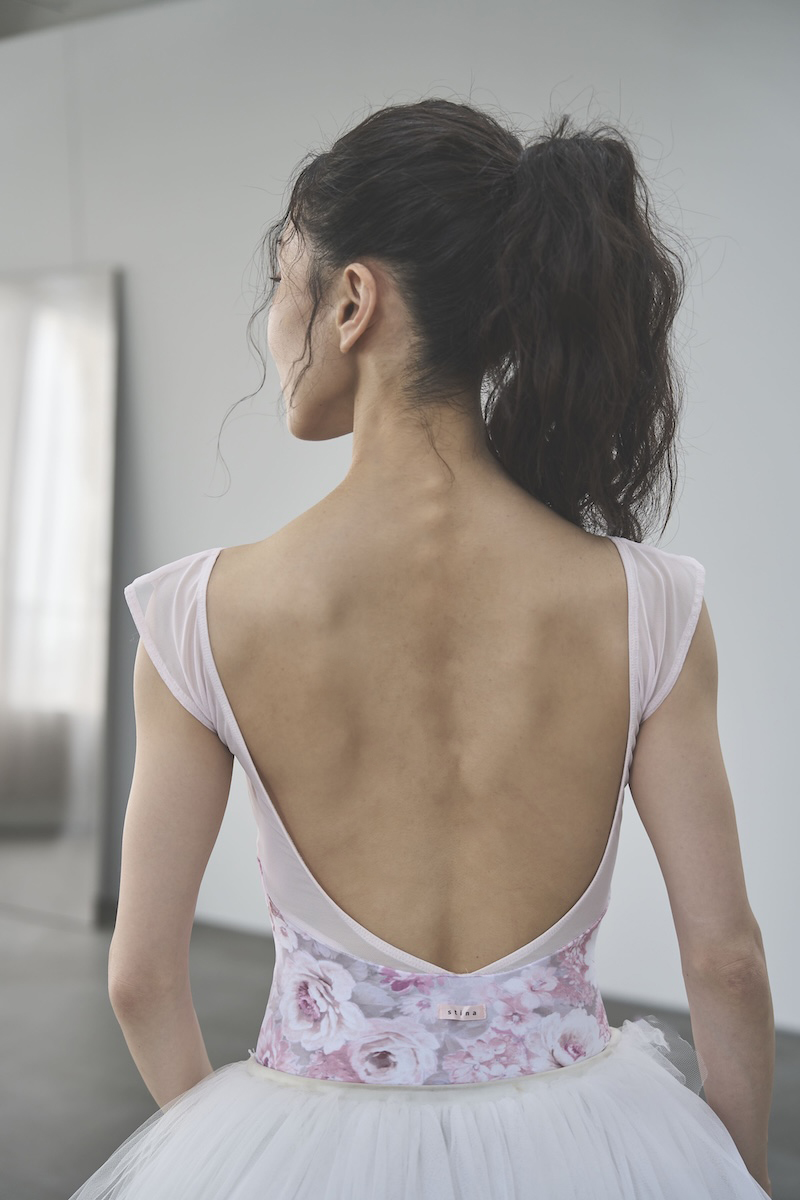 light pinkのパワーネットが柔らかく肌になじみボディラインを優しく見せ、華やかな印象に。