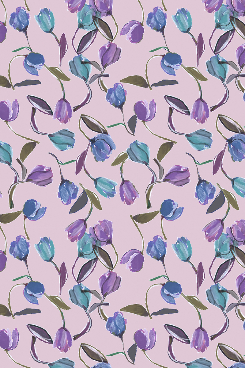 柔らかいピンクをベースに、落ち着いたトーンのチューリップがリズミカルに広がるデザイン。