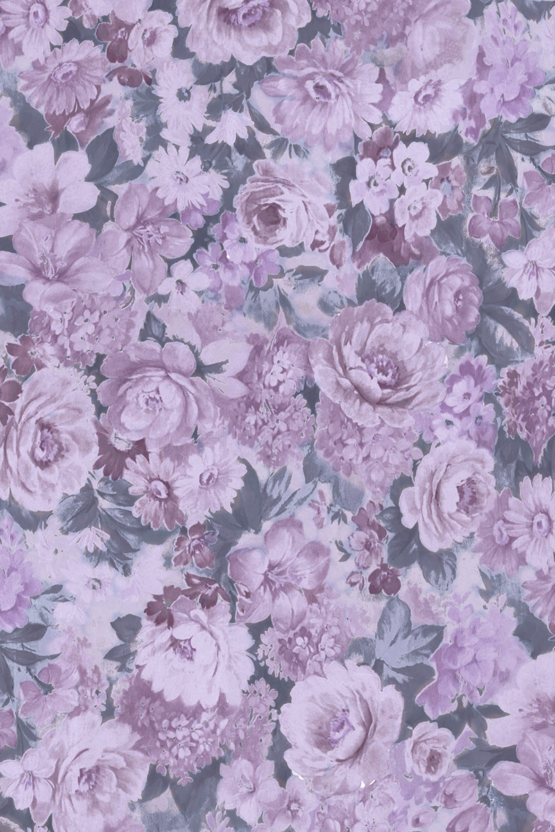 グレーベースに、パープルの花々が重なり合った奥行きのあるデザイン。